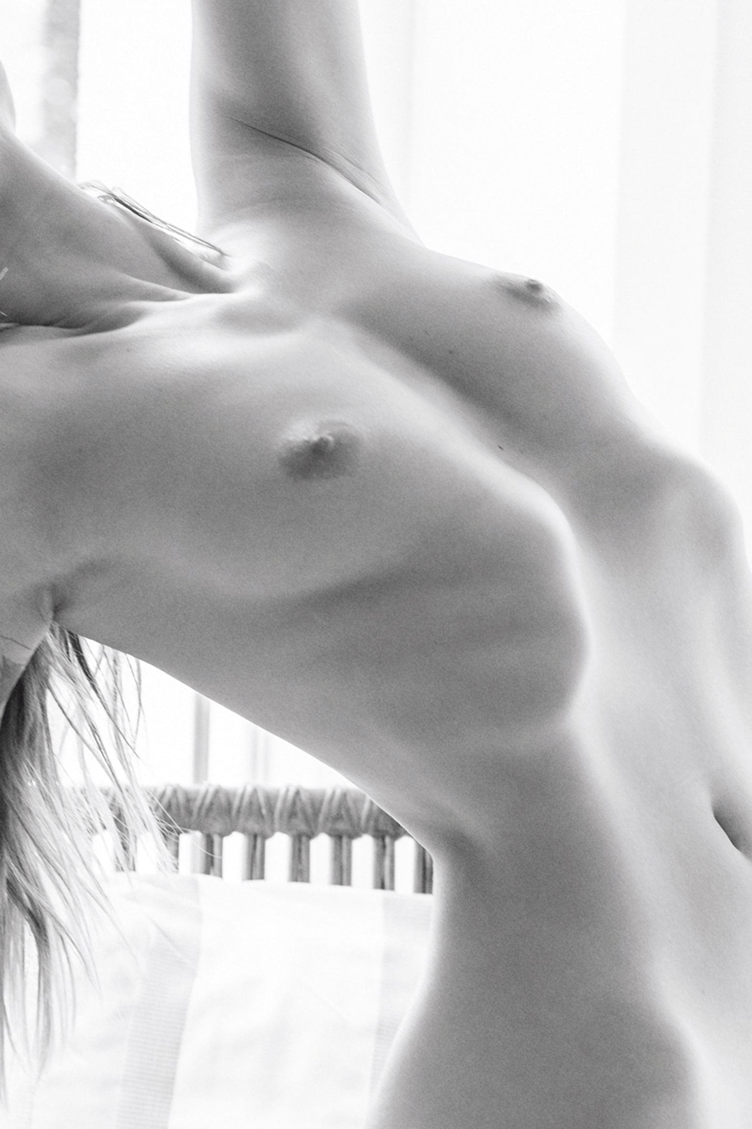 Direktes Sonnenlicht flutet den Raum, wirft Lichtstreifen auf die Frau, die sich lässig im Korbstuhl räkelt. Ihr Strohhut sitzt schief und verleiht ihr einen Hauch von Unbekümmertheit und Rebellion. Die helle Umgebung bringt die sinnlichen Linien ihres Körpers zur Geltung, während sie sich in entspannter Haltung präsentiert