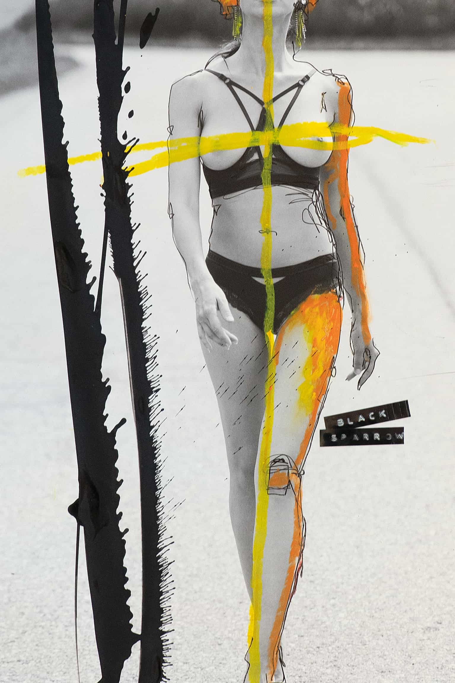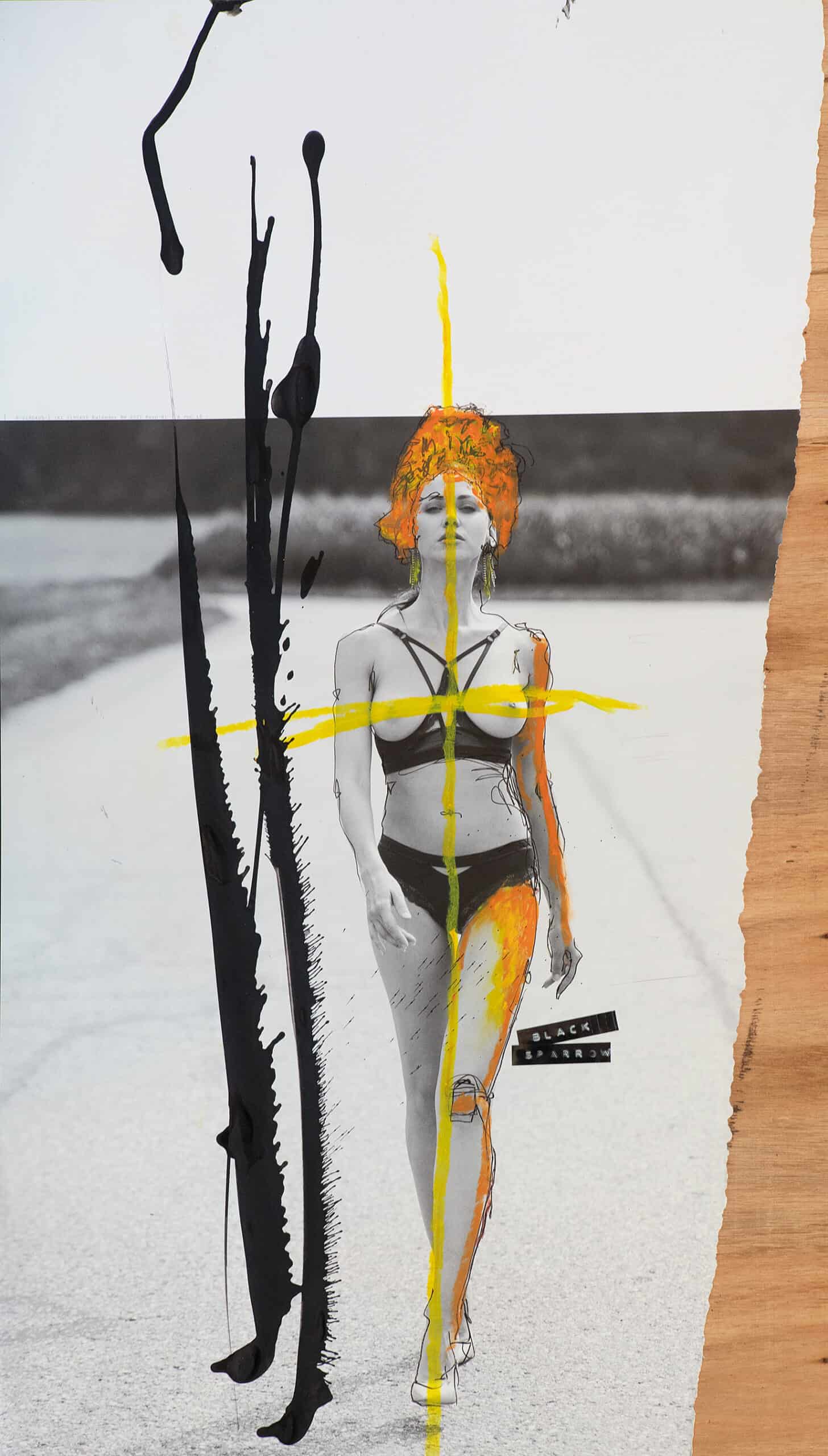 Dieses Werk präsentiert eine faszinierende Darstellung weiblicher Selbstbestimmung und Stärke. Die Frau, gekleidet nur in Unterwäsche und High Heels, durchquert unerschrocken die Straße, sichtbar und ohne Scham. Trotz der Offenheit ihrer Erscheinung strahlt sie Selbstbewusstsein und Entschlossenheit aus, was die Betrachter dazu einlädt, über Konventionen und gesellschaftliche Normen nachzudenken. Die subtile Übermalung in warmen Farbtönen fügt dem Bild eine gewisse Intimität hinzu und betont die Ausstrahlung der Frau, die durch ihre Selbstsicherheit und Präsenz im Mittelpunkt steht.