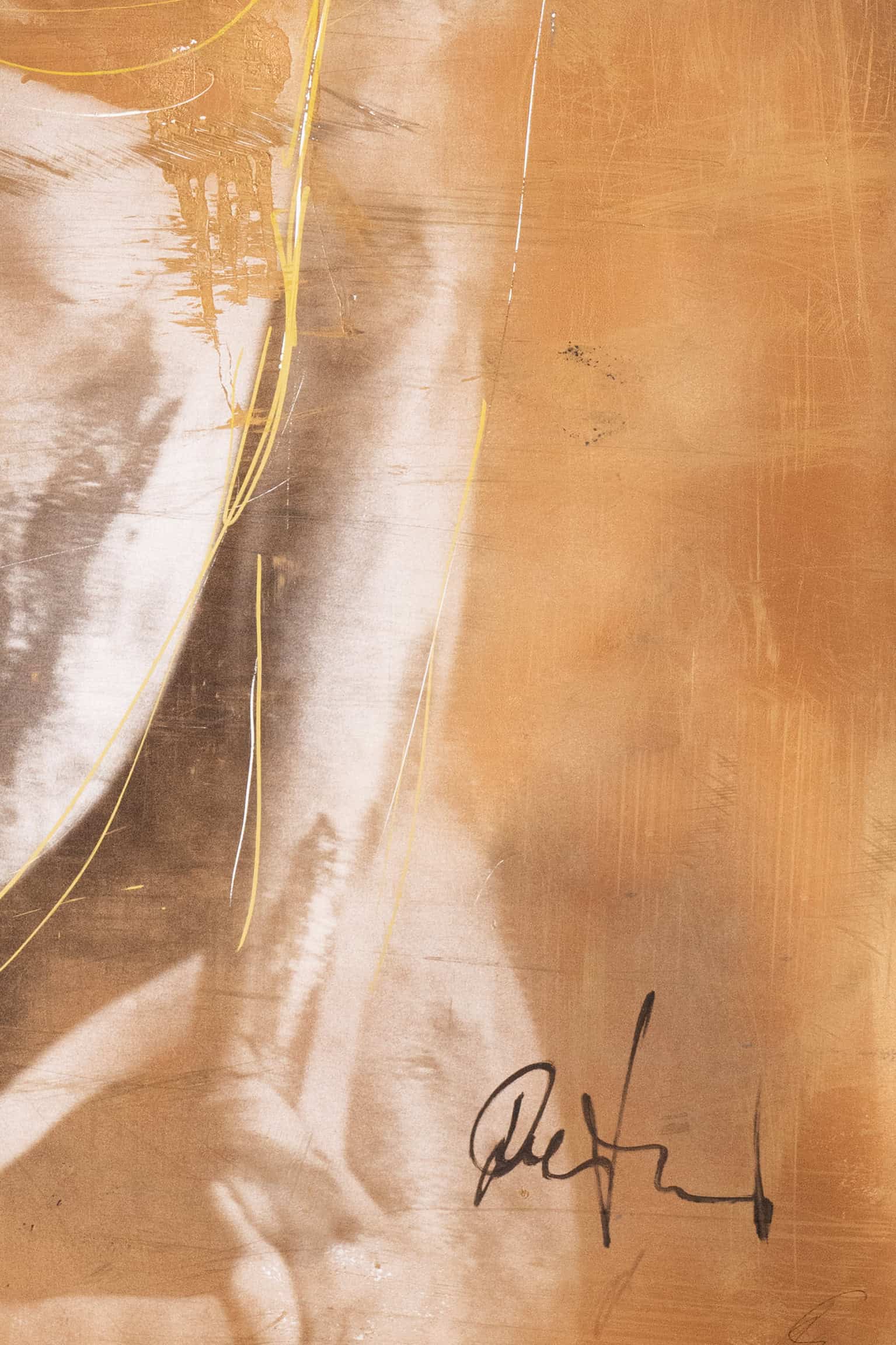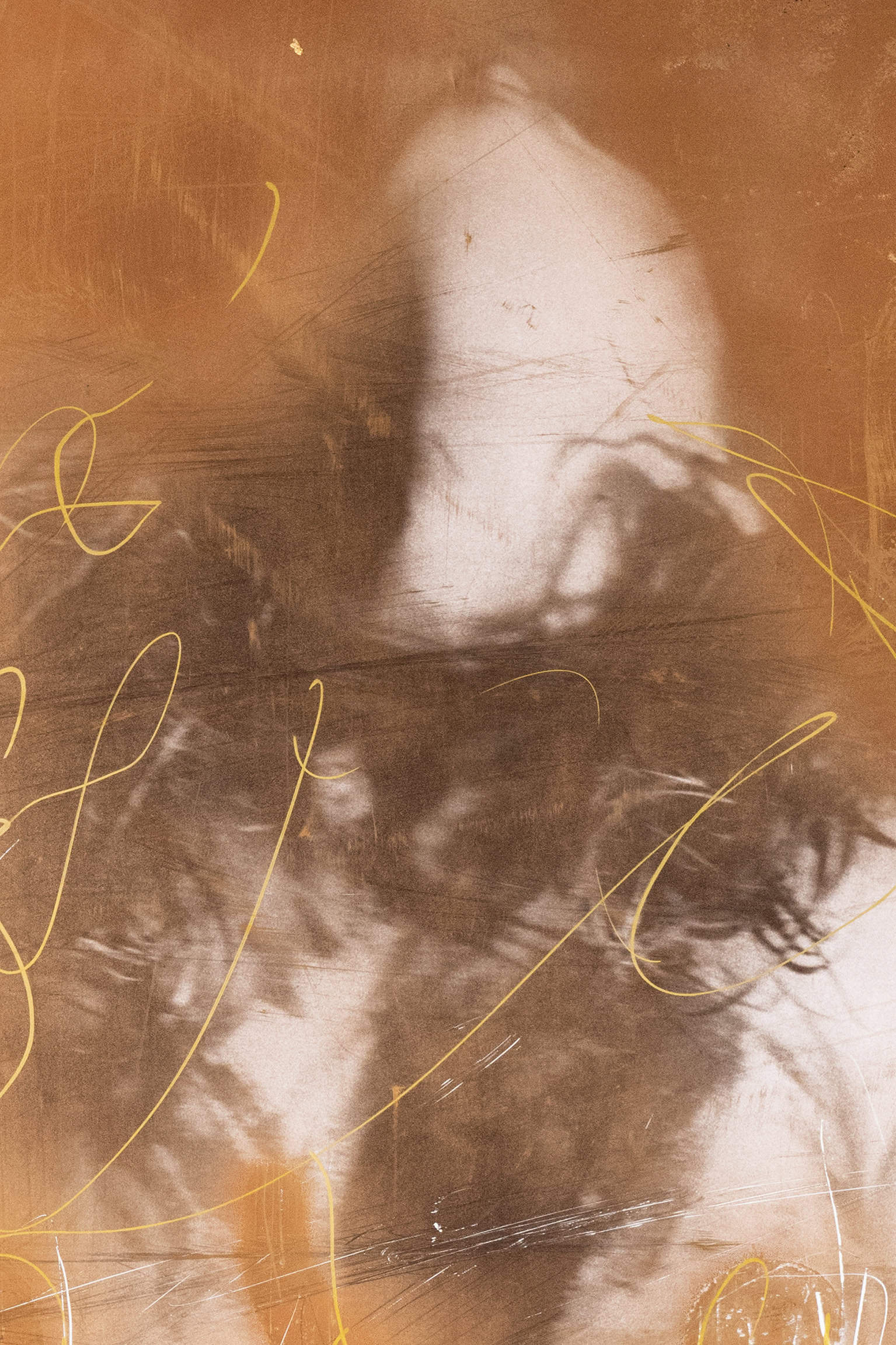 “Coming Home in Chrome” features a beautifully detailed black-and-white photograph of a woman in an evocative pose. The luxurious golden overpainting adds depth and a metallic finish, creating a striking contrast with the grayscale image. The warm golden background provides a rich, elegant backdrop, enhancing the sophistication of the piece. This artwork bridges the gap between traditional portraiture and modern abstraction, making it a timeless addition to any art collection.