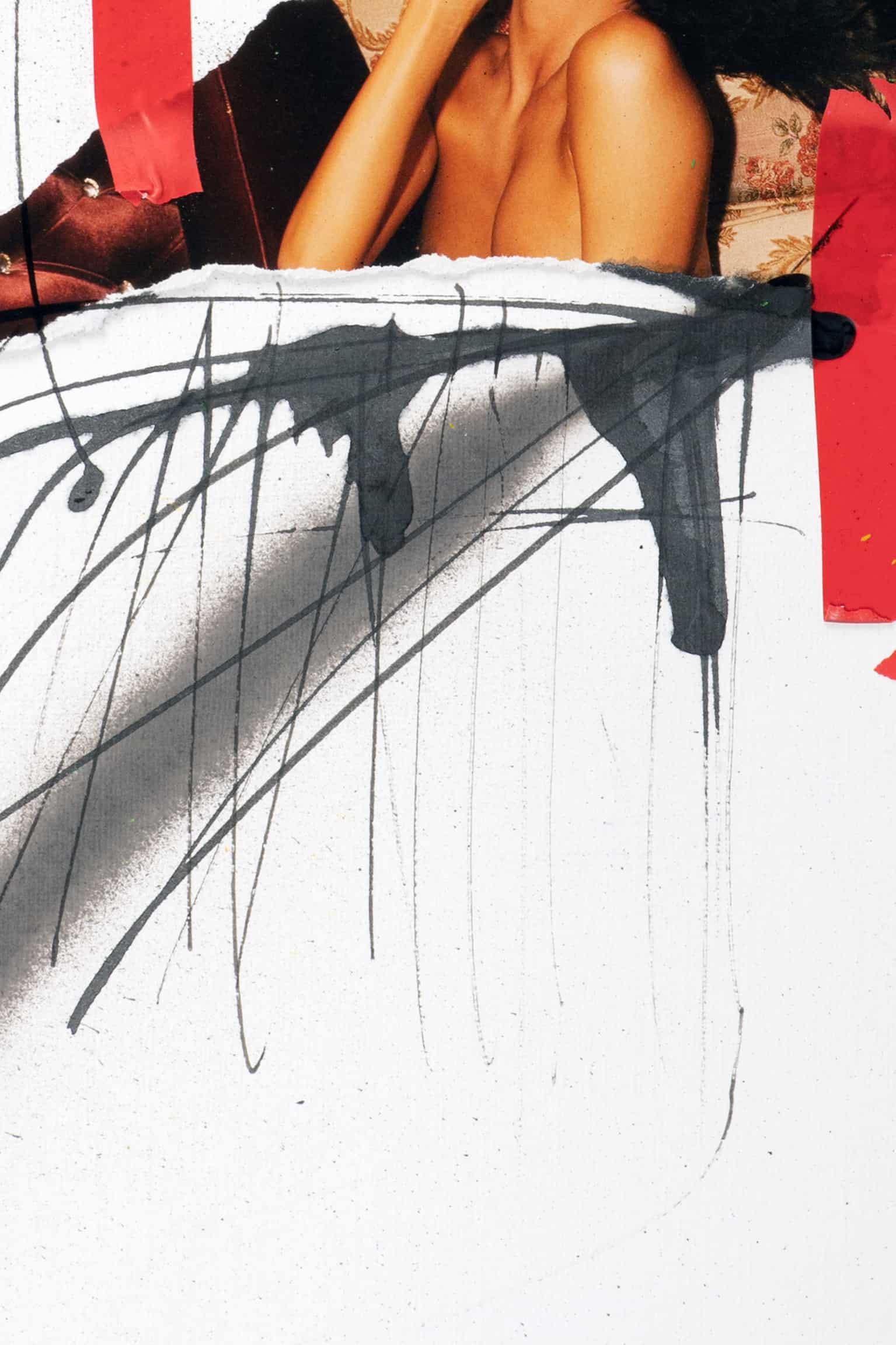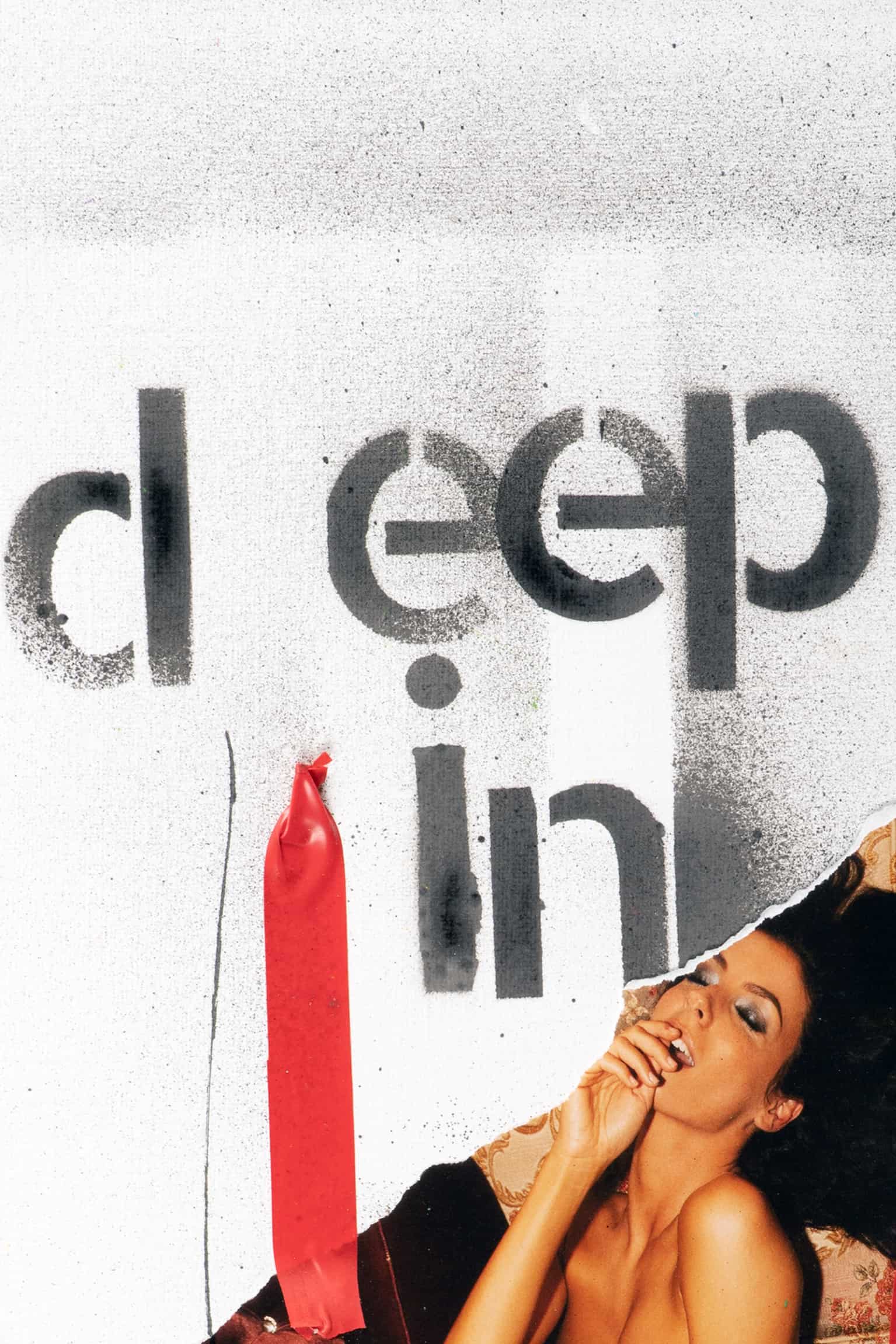 Diese Komposition spielt mit der Verbindung von Text und Bild, um ein narratives Spannungsfeld zu schaffen. Der ausdrucksstarke Schriftzug “deep in” zieht den Betrachter in die Tiefe des Werks, während die lässige Pose der Frau, eingebettet in abstrakte schwarze Linien und rote Farbakzente, eine Geschichte von innerer Reflexion und sinnlichem Selbstbewusstsein erzählt. Ein Stück, das sowohl provokativ als auch elegant ist, perfekt für Sammler, die nach einem Kunstwerk mit Tiefe und Charakter suchen.