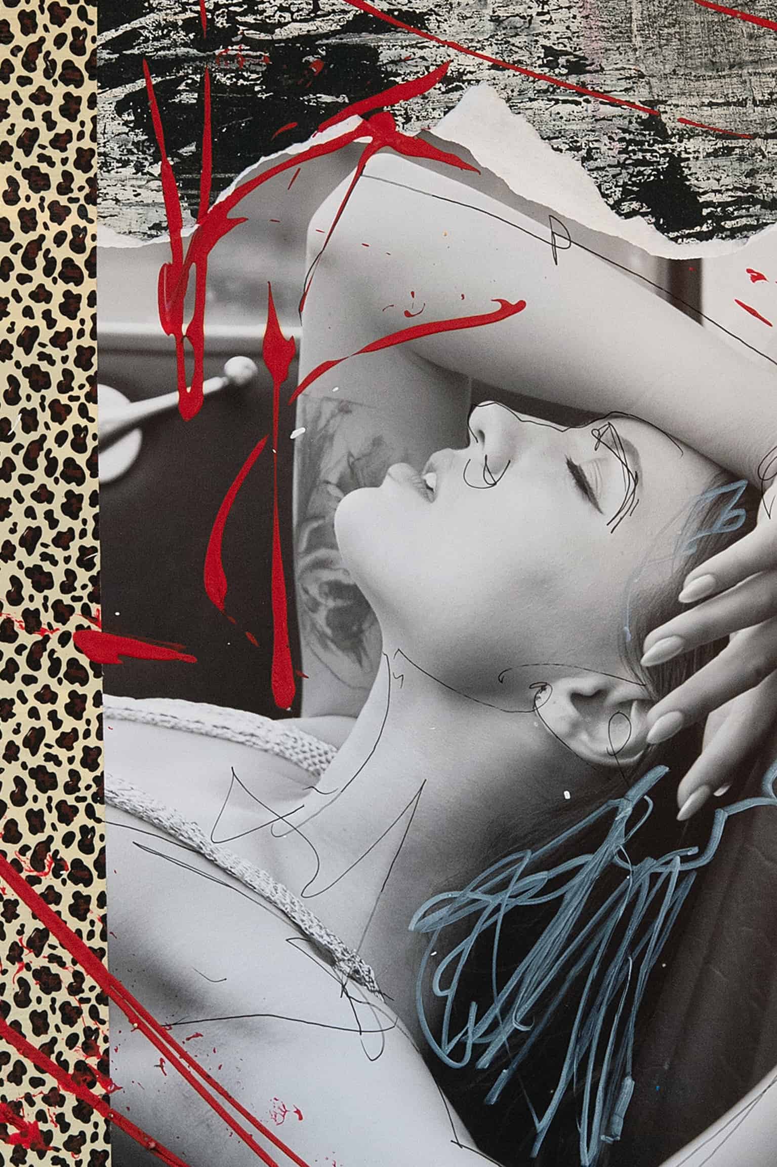 • Ink, oil pastels, acrylic, opaque white, adhesive tape, original photograph, and collage on Hahnemühle FineArt Baryta paper.