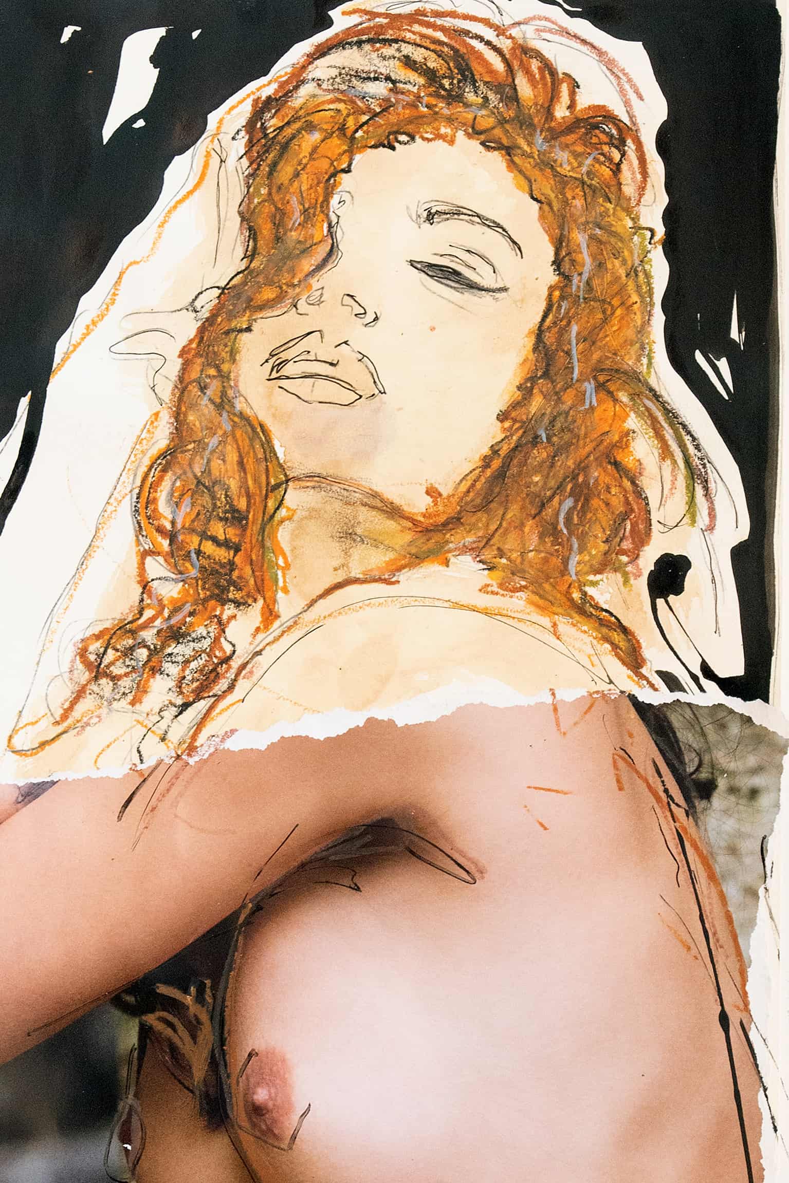 Dieses faszinierende Werk präsentiert eine einzigartige Verschmelzung von Fotografie und Zeichnung. Der untere Teil des Bildes zeigt ein deutliches Foto einer Frau, während der obere Teil durch verschiedene künstlerische Techniken frei interpretiert wurde. Eine subtile Übermalung verbindet die beiden Welten harmonisch miteinander und schafft eine symbiotische Beziehung zwischen Realität und Imagination. In dieser hybriden Darstellung werden die Grenzen zwischen den beiden Medien erkundet und die vielschichtige Natur des menschlichen Ausdrucks erforscht.
