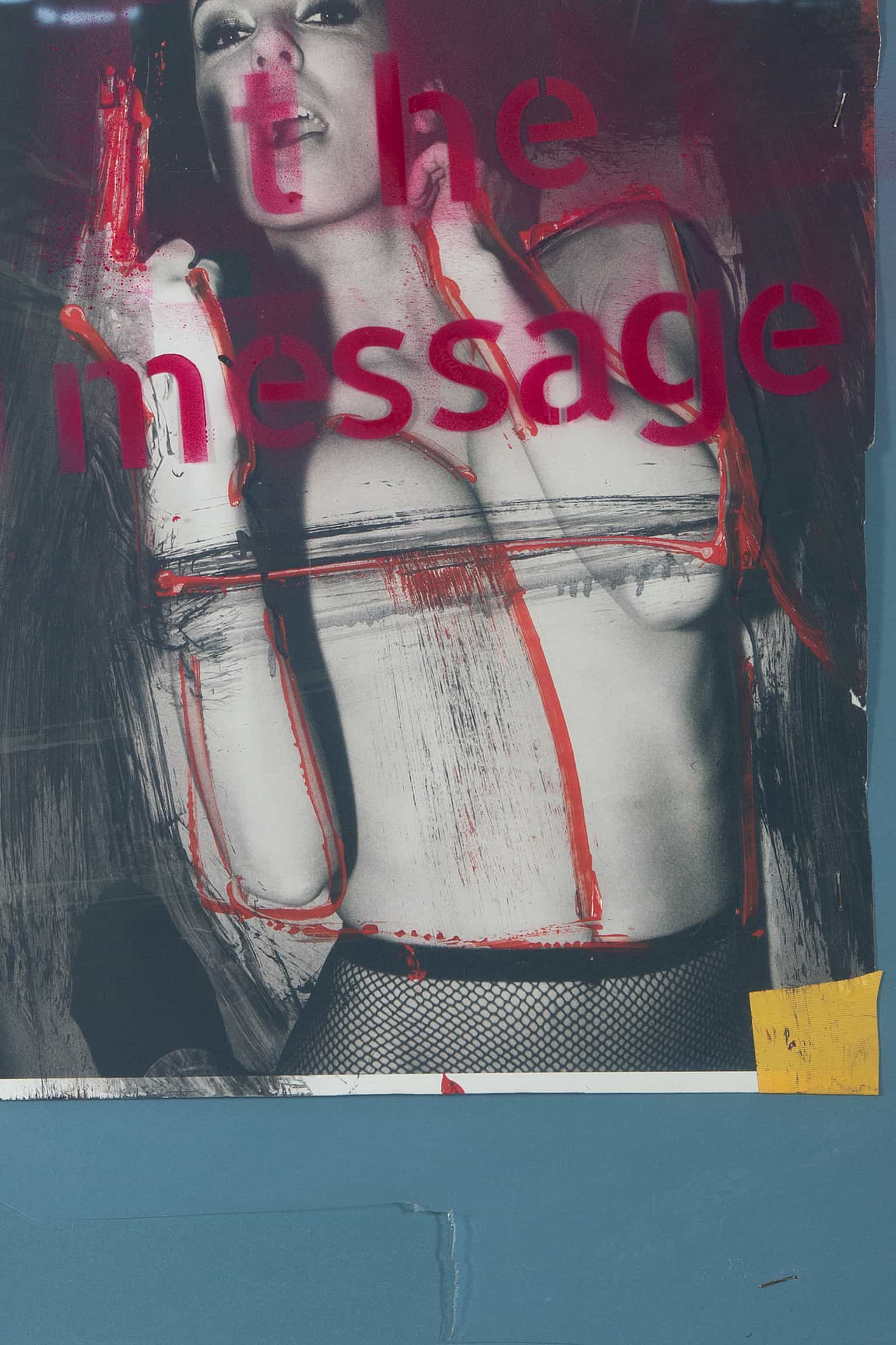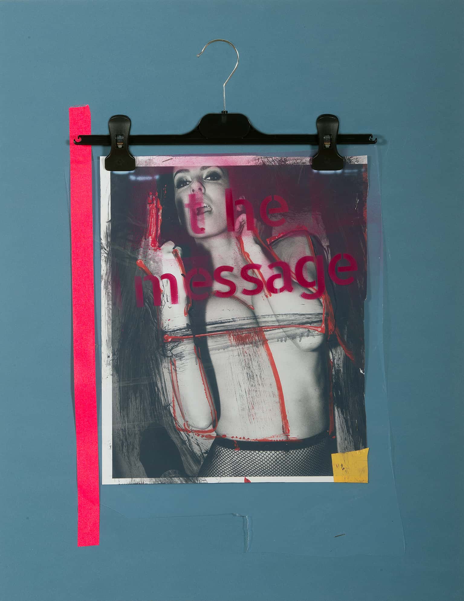 Durchsetzt mit rebellischer Direktheit, fordert die rote Schrift über dem kontrastreichen Porträt den Betrachter heraus. Die Worte „the message“ bilden einen kraftvollen Kontrast zum visuellen Narrativ der Frau dahinter, deren Pose und Ausdruck durch die Überlagerung eine neue Bedeutung erhalten. Die unkonventionelle Präsentation auf einem Kleiderbügel verstärkt die Idee, dass Kunst auch in den alltäglichsten Gegenständen verankert sein kann. Ein provokantes Werk, das traditionelle Darstellungsweisen hinterfragt und einen bleibenden Eindruck hinterlässt.