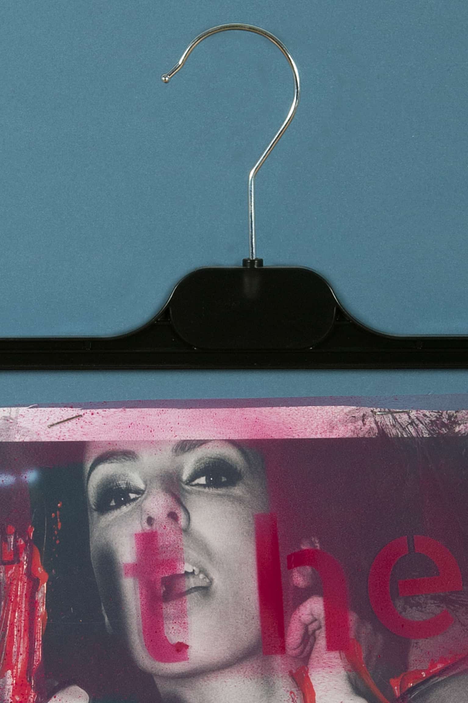 Imbued with a rebellious forthrightness, the red script across the contrasting portrait confronts the viewer. “the message” forms a powerful counterpoint to the visual narrative of the woman behind it, whose pose and expression take on new meaning through the overlay. The unconventional presentation on a hanger amplifies the notion that art can be rooted in the most mundane of objects. A provocative piece that challenges traditional modes of display, leaving a lasting impression.