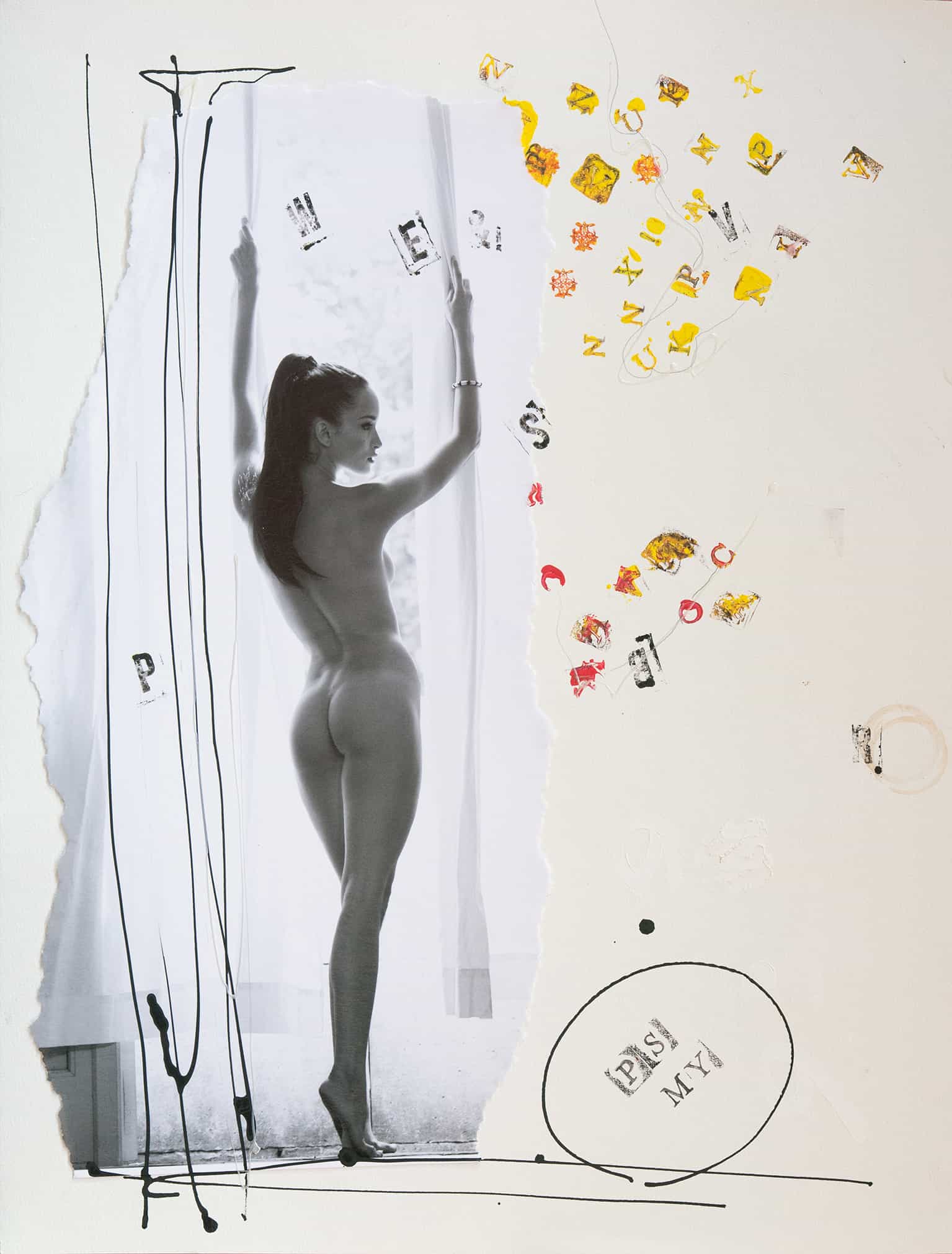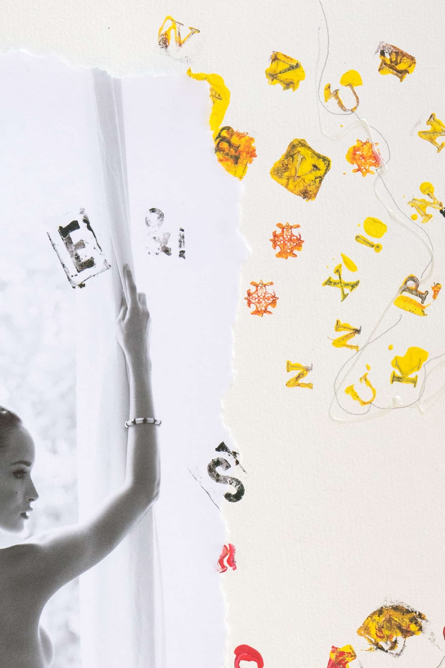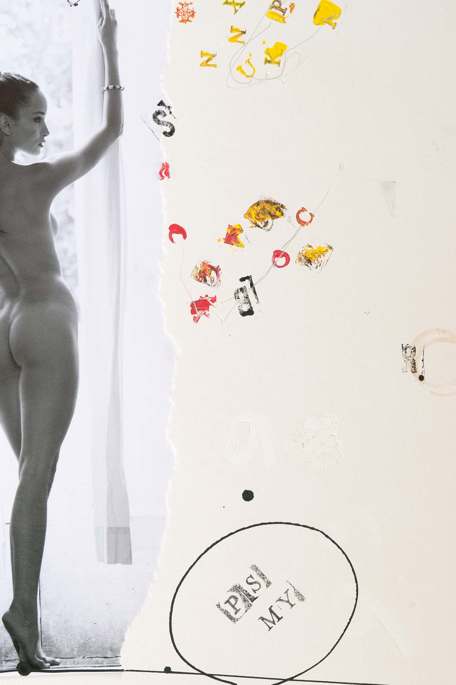 This nude photograph is a captivating narrative that captivates the viewer. The woman holding onto the curtains and turning her gaze to the side exudes an aura of intimacy and introspection. Her graceful pose and the dynamic interplay of light and shadow leave room for interpretation and stimulate the imagination. The torn structure of the image and the flying letters add a touch of drama and depth to the scene. A unique artwork that fills the space with its presence and transports the viewer into a realm of thoughts and dreams.
