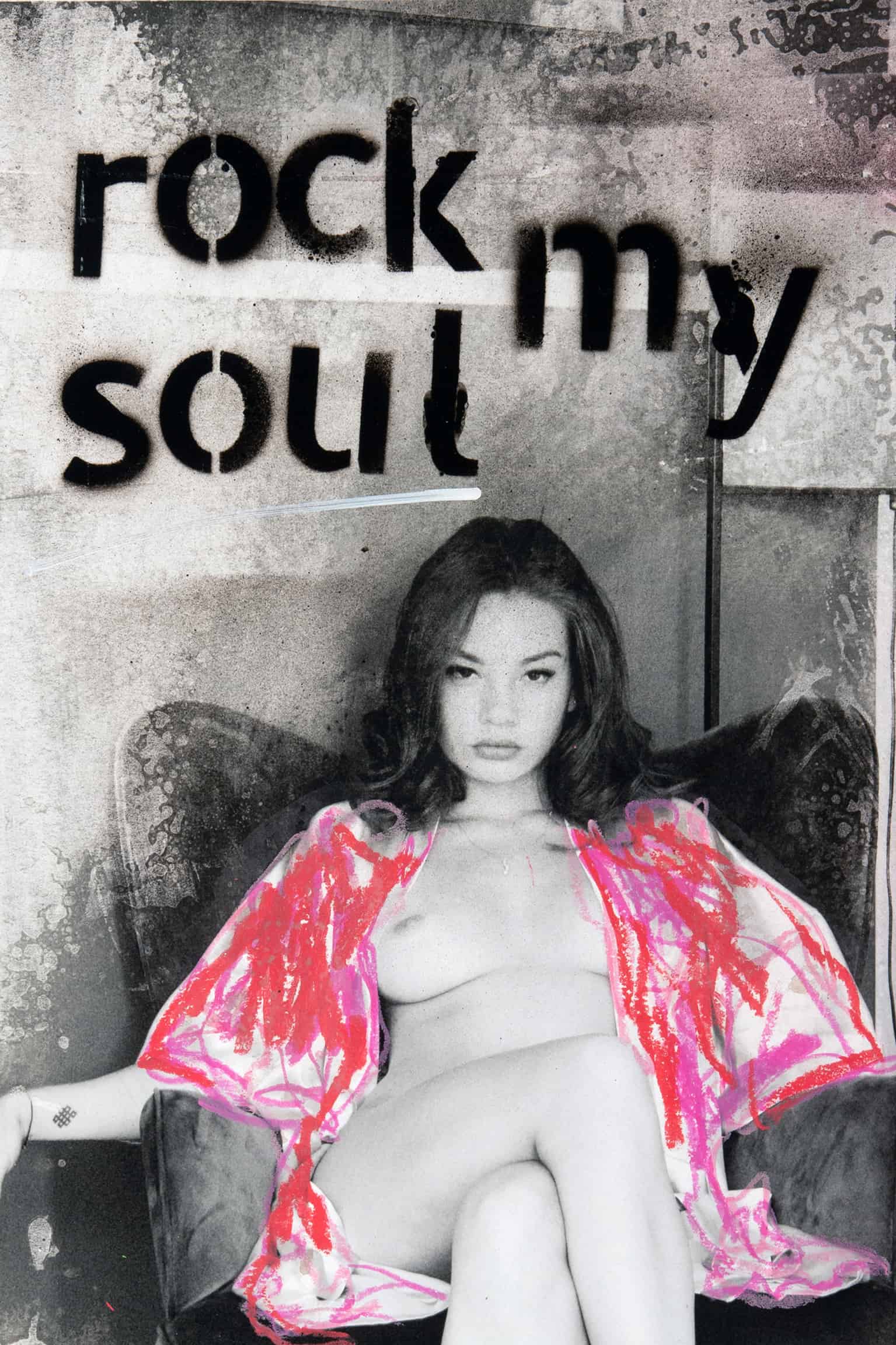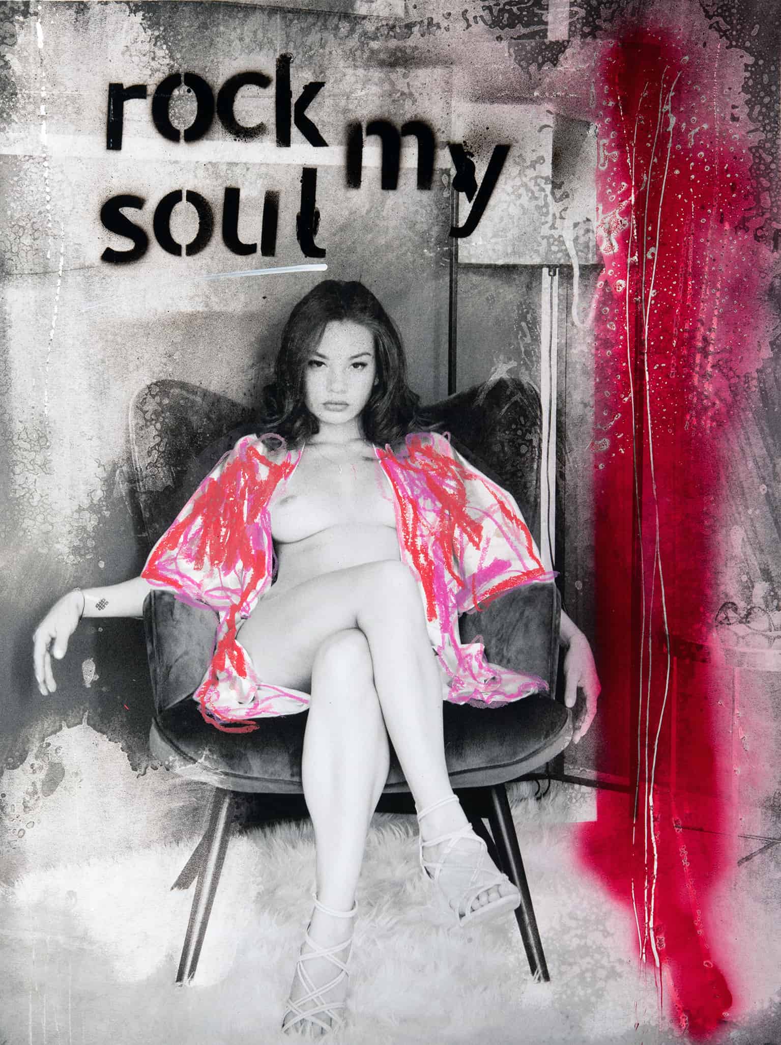 A woman lounges in an armchair, cloaked in an aura of the classic, her gaze capturing the essence of confidence. The monochrome space comes alive with the energetic inscription “rock my soul” and a cascade of ruby red, leaving a trail of intense emotion. This scene weaves the timelessness of black-and-white photography with a bold expression of passion and defiance, a silent yet powerful testament to individuality and strength.