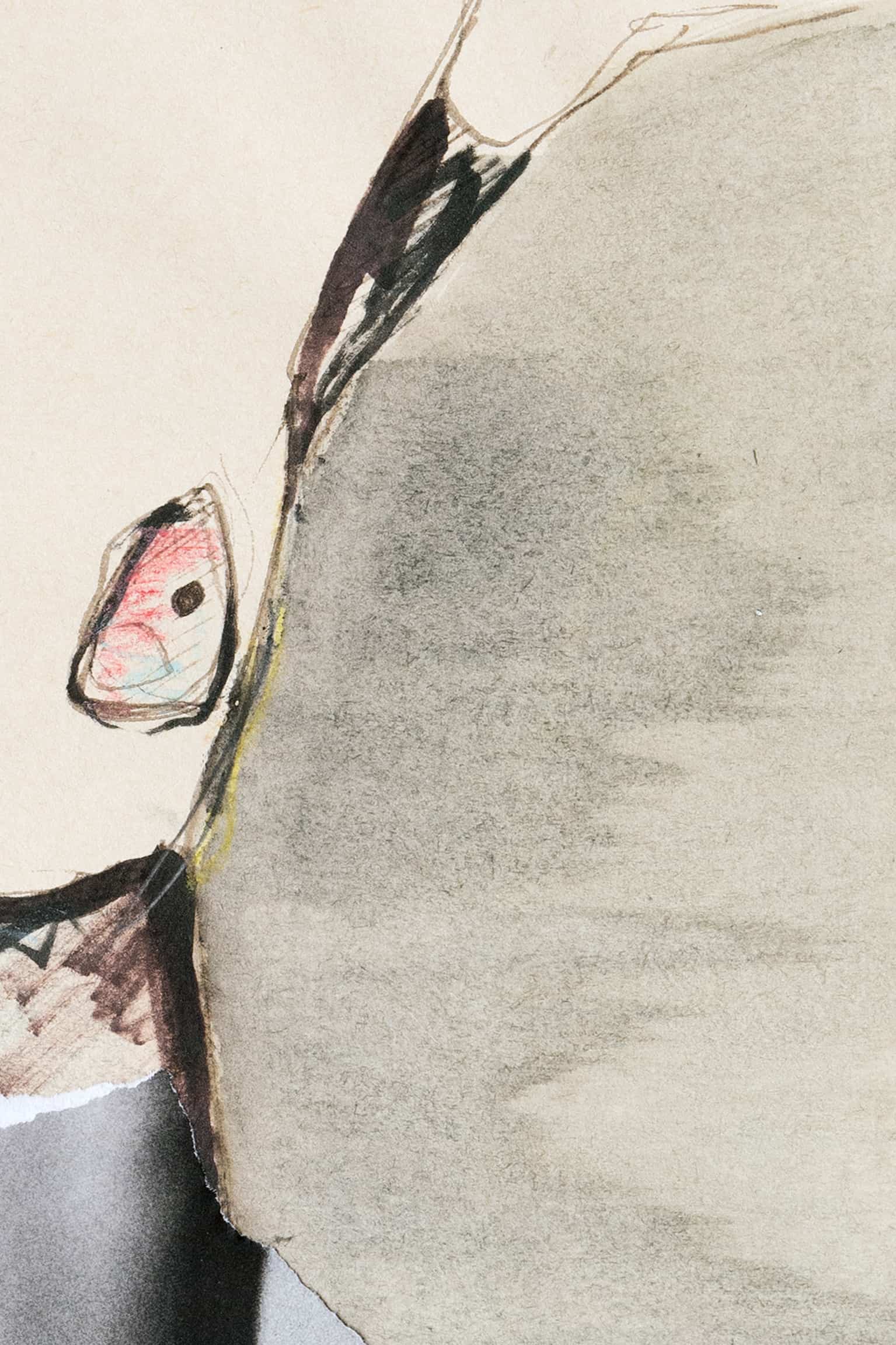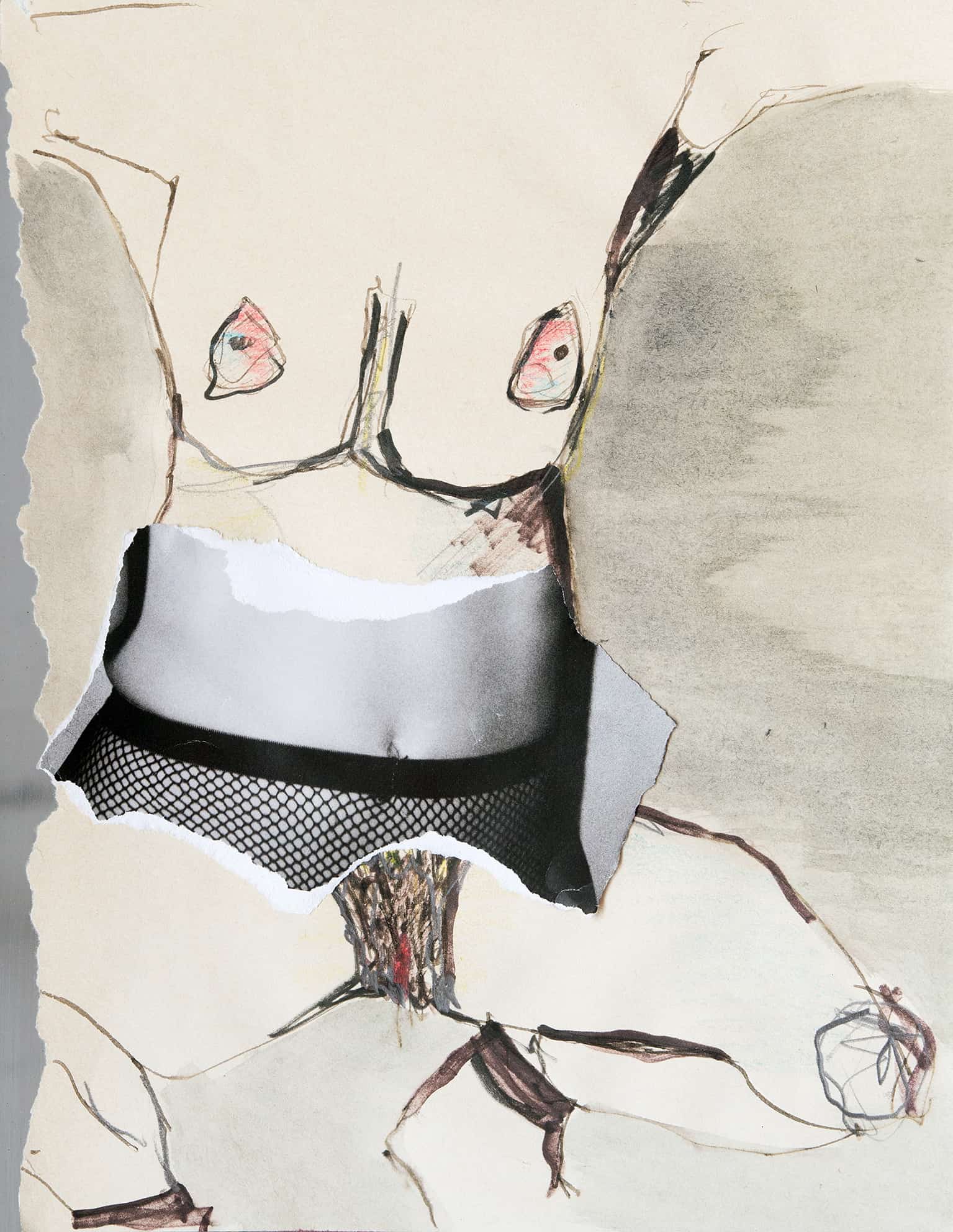 • Tusche, Wachsmalstift, gedruckte Fotografie, Collage auf Karton