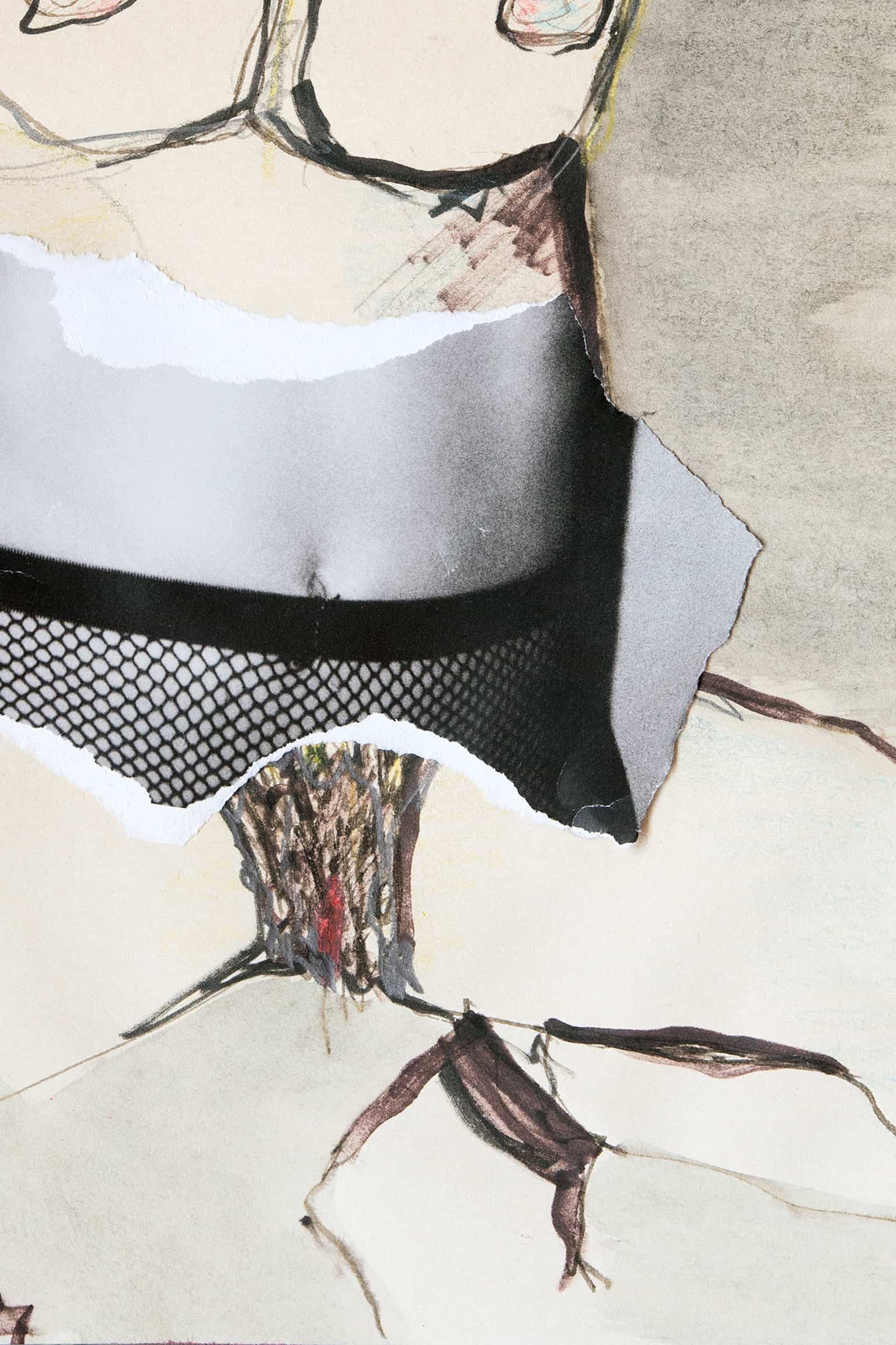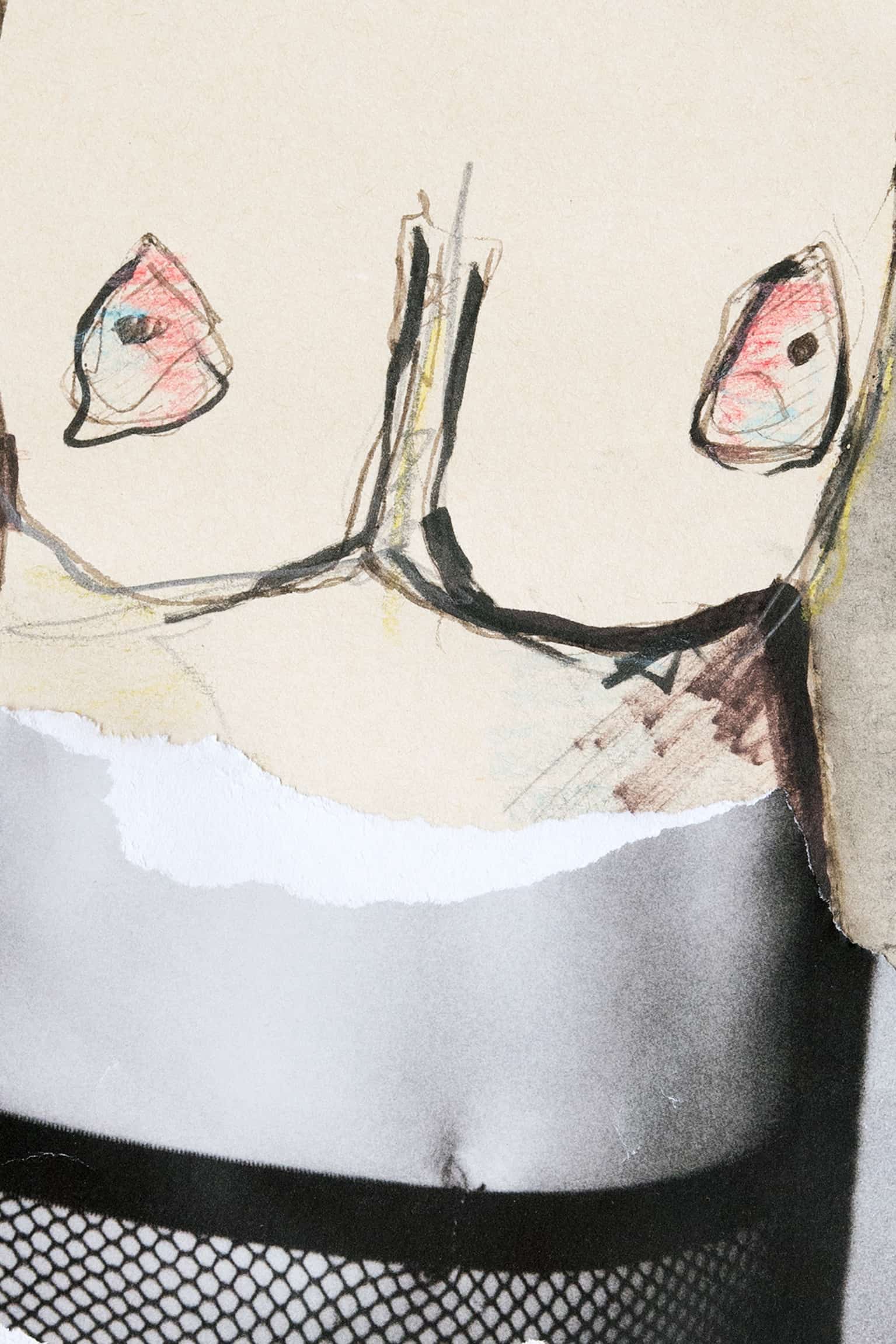 Abstrakte Formen und flüchtige Linien konstruieren eine Präsenz, die sowohl enthüllt als auch verbirgt. Ein Ausschnitt – scharf und klar – zeigt einen weiblichen Körper in Netzstrümpfen, der Realität und Verführung spielt. Der harte Kontrast des Textils gegen die weichen, organischen Striche erzeugt ein Spannungsfeld, das Fragen nach Authentizität und Inszenierung aufwirft. Hier wird das Betrachtende dazu angeregt, die nicht erzählten Geschichten hinter den sichtbaren Fragmenten zu entdecken.