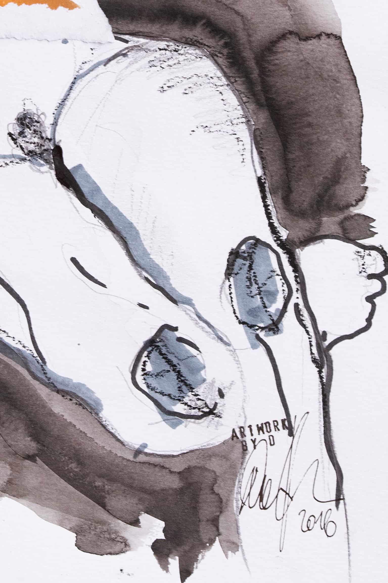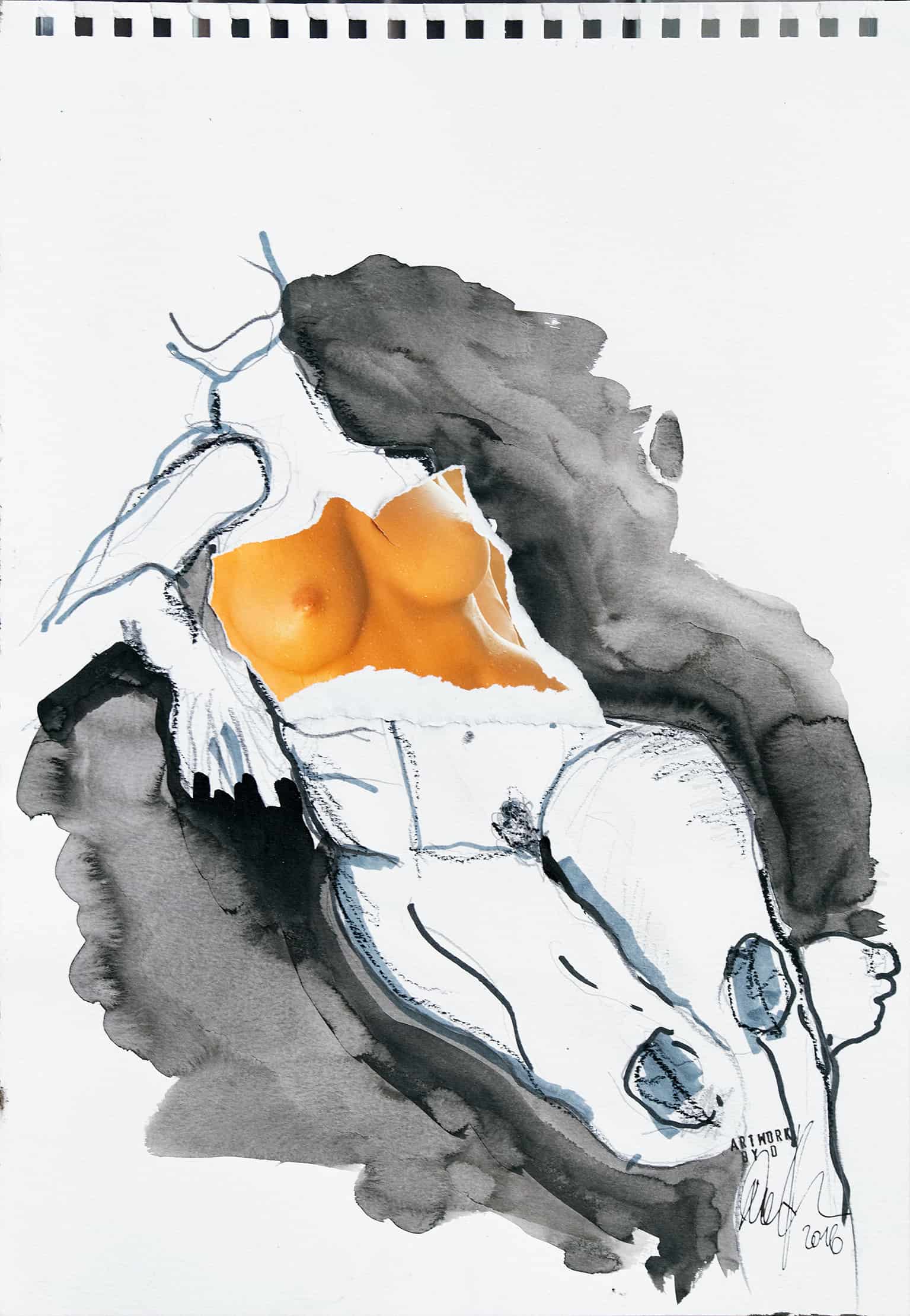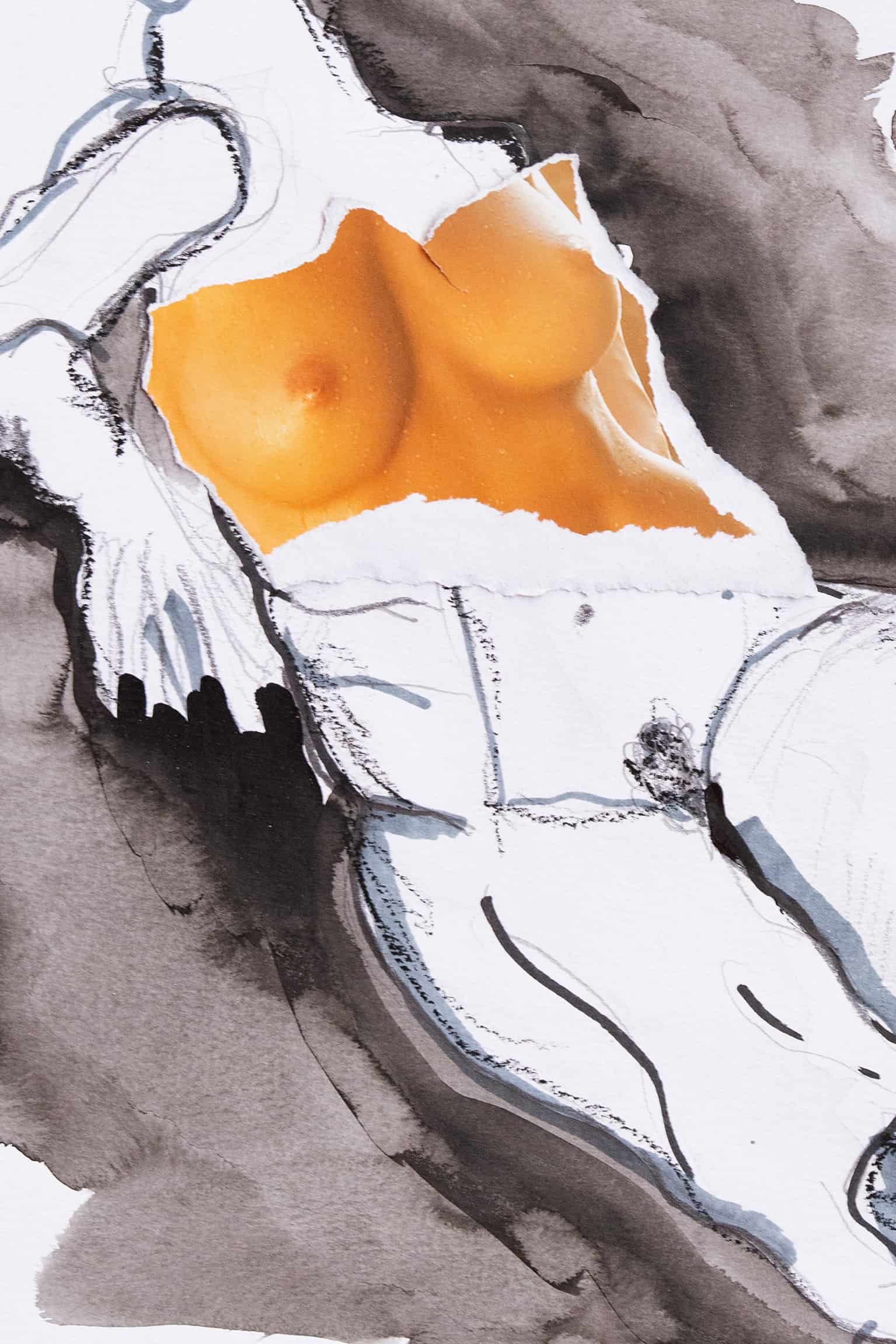 Ein liegender weiblicher Torso, skizziert in feinen Linien, scheint sich in einem Ozean aus schwarzer Aquarellfarbe zu befinden, was eine Atmosphäre der Tiefe und Unendlichkeit schafft. Die blauen Akzente auf dem Torso könnten auf ein Gefühl der Kühle oder Distanz hinweisen, während die warmen Farben des fotografierten Oberkörpers einen lebendigen Kontrast erzeugen, der das Bild mit Leben erfüllt. Diese Kombination aus kühler Skizze und warmer Fotografie könnte auf die Vielschichtigkeit der menschlichen Erfahrung hinweisen, die sowohl rational als auch emotional ist, und den Betrachter dazu einladen, über die Dualität des menschlichen Selbst nachzudenken.
