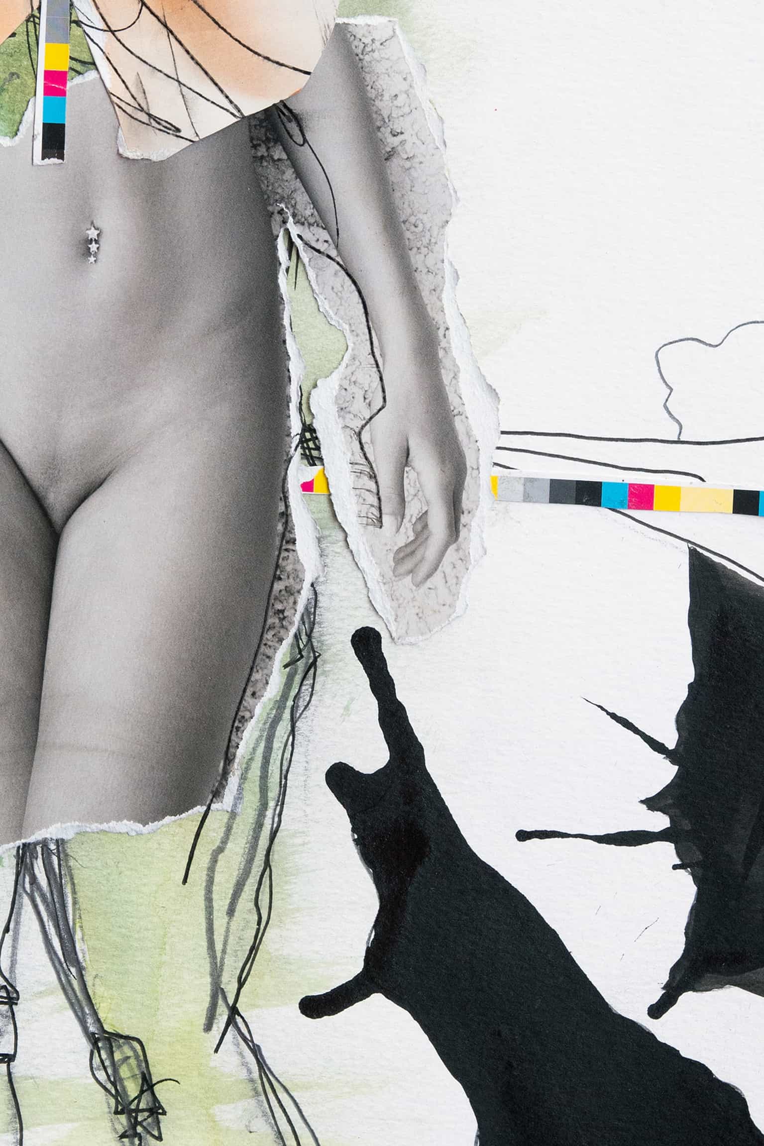 Eine Frauenfigur, gezeichnet in Tusche und Bleistift und mit blassgrüner Aquarellfarbe koloriert, dient als Grundlage. Darüber wurden passgenau verschiedene Fotos platziert und eingefügt. Der Titel “Turning Inside Out” lässt auf eine innere Transformation oder eine introspektive Reise schließen. Dunkle Formationen, die sich vom Rand des Bildes zu bewegen scheinen, greifen scheinbar nach der Figur, was dem Bild eine geheimnisvolle und faszinierende Dimension verleiht.