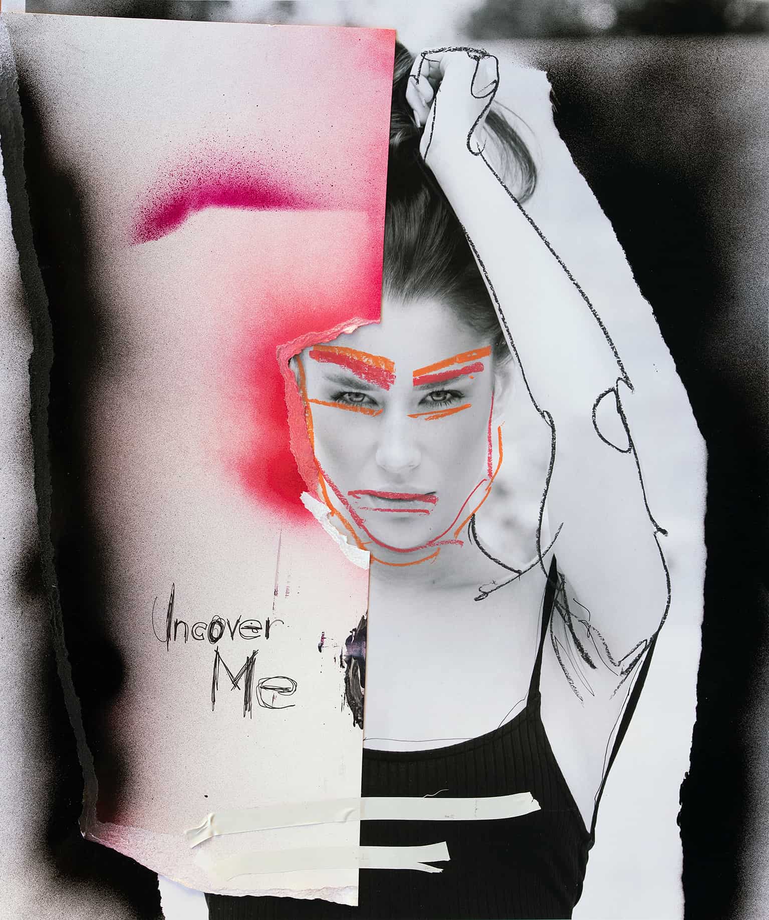 A captivating black and white portrait depicts a confident woman sensually gazing into the camera, with her hands playfully running through her hair. Her eyebrows are accentuated in vibrant red and orange tones, adding a powerful intensity to the image. The stencil with the provocative title “Uncover Me” adds an additional layer of meaning to the image by alluding to hidden realities and unspoken stories. This hidden message opens up room for interpretation and invites viewers to explore the secrets lying beneath.