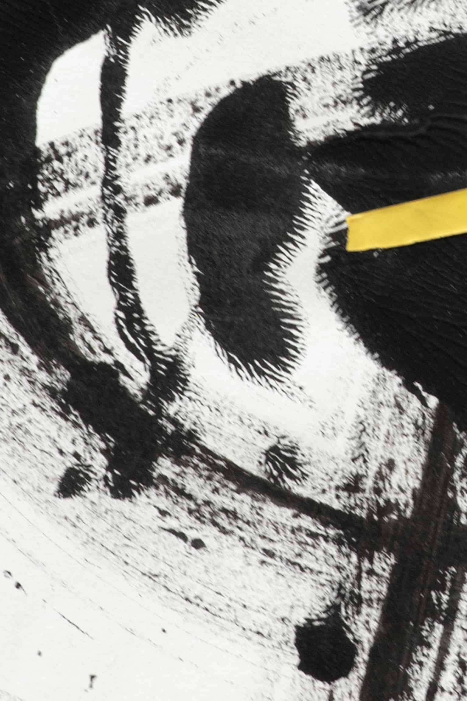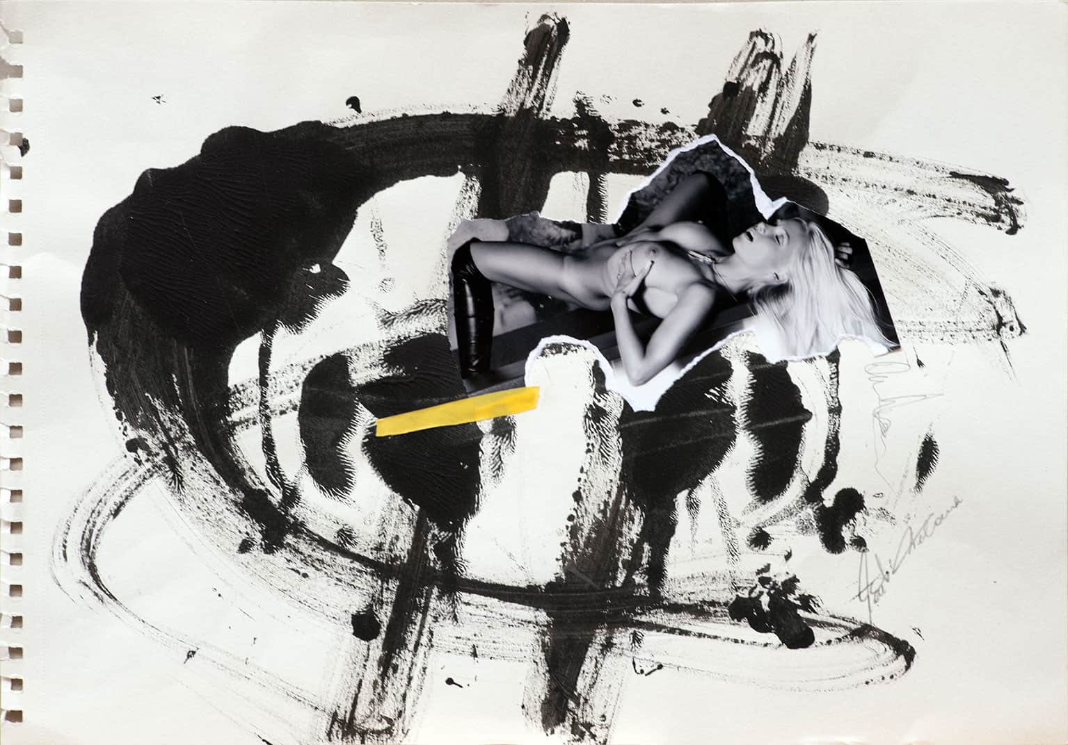 Schwarze, expressive Pinselstriche bilden eine dynamische Kulisse für die Aktaufnahme einer Frau, deren Pose Ekstase und Hingabe ausstrahlt. Der Kontrast des Körpers gegen die wilde Abstraktion des Hintergrunds reflektiert das Spiel zwischen Kontrolle und Loslassen. Ein gelber Strich durchbricht das Monochrome und bringt einen Hauch von Lebendigkeit in das Bild – eine Darstellung voller Energie und gleichzeitiger Stille, ideal für Betrachter, die Wert auf Tiefe und Kontrast legen.