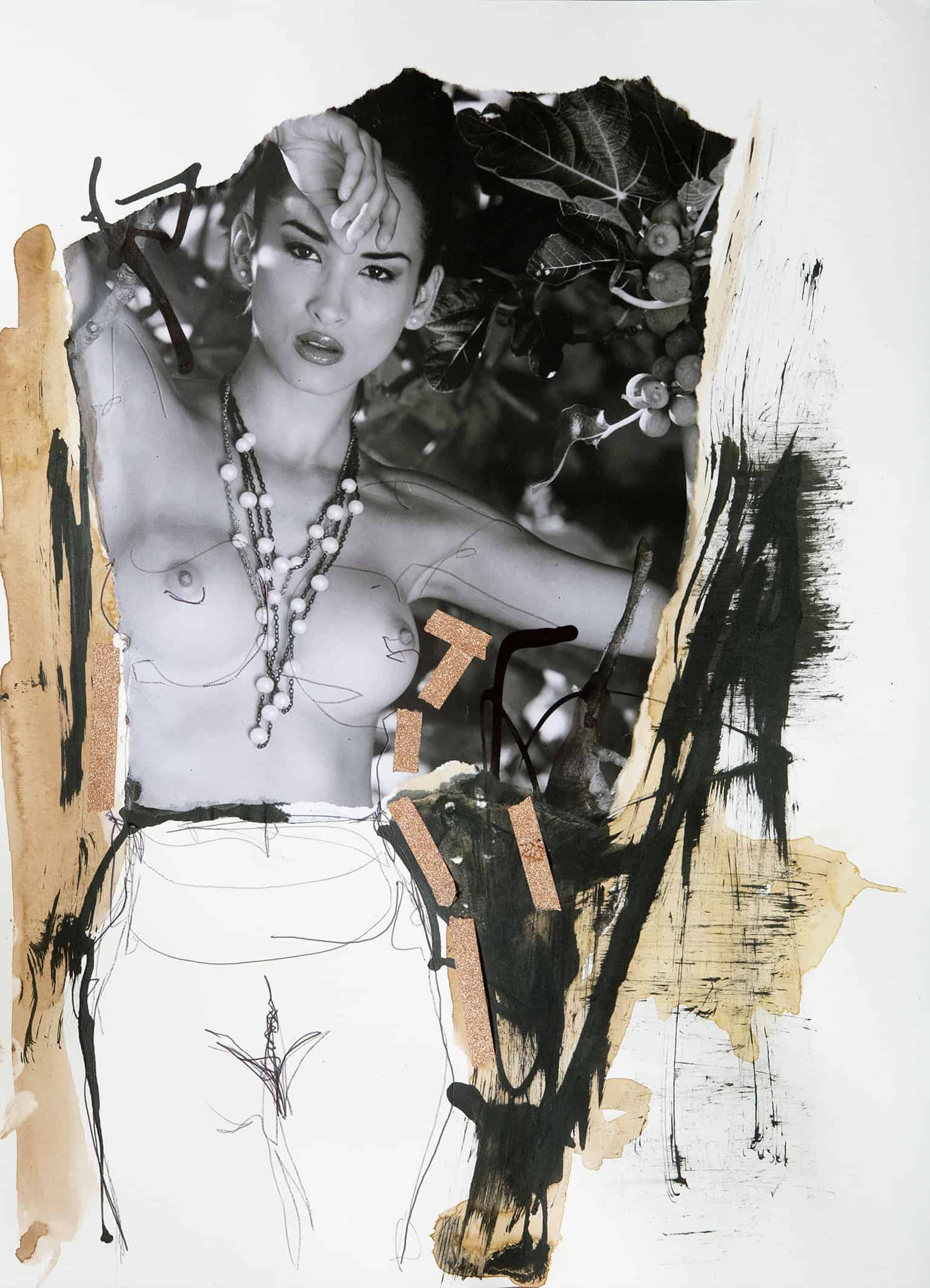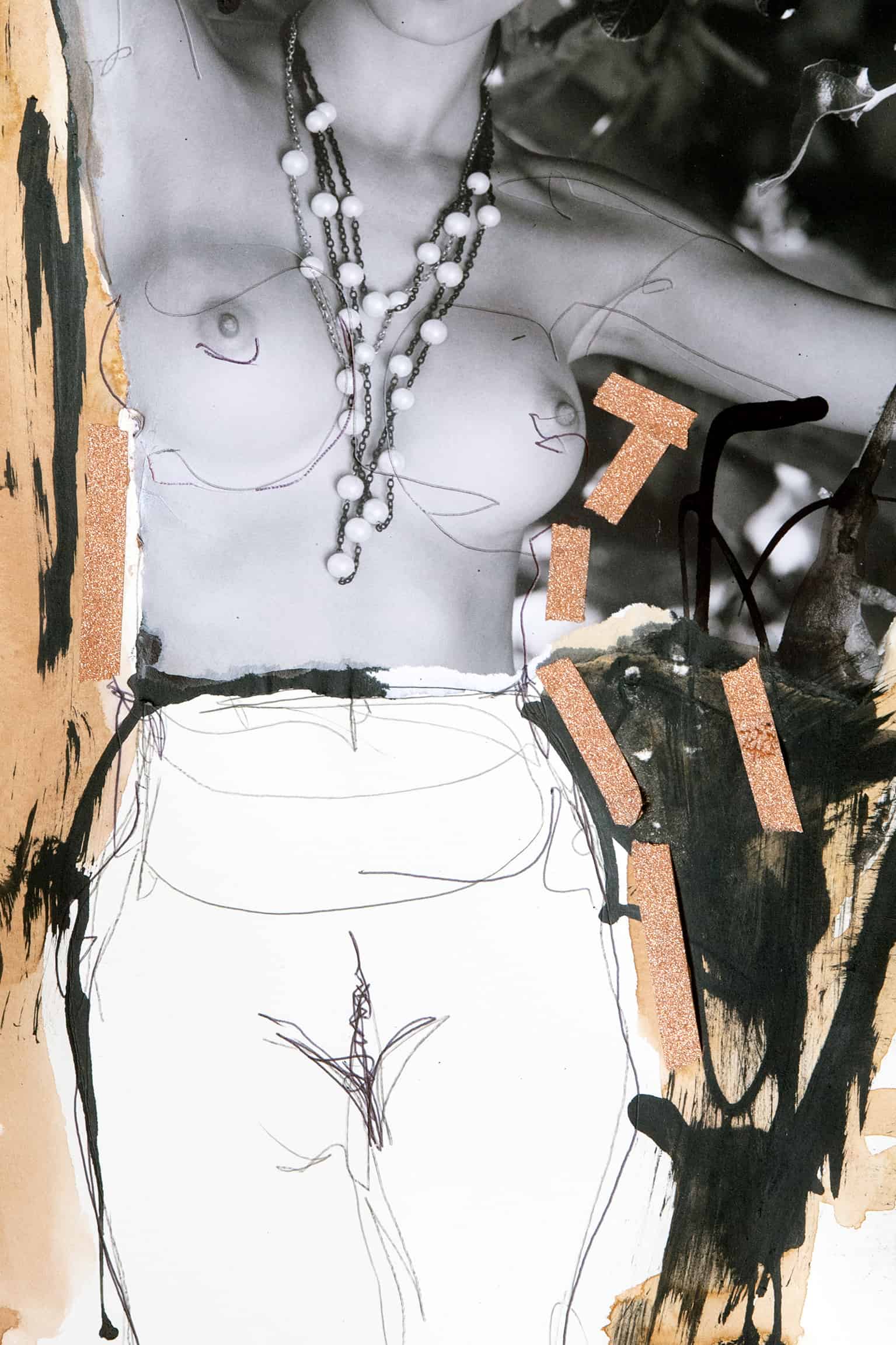 Diese eindrucksvolle Zusammenführung zweier Medien ist eine Reise durch die Spuren des Lebens einer Frau. Die detailreiche Integration der Aktskizze und des Fotos enthüllt die Geschichte einer weiblichen Figur, die sich zwischen Realität und Vorstellungswelt bewegt. Die unkonventionelle Kaffee-Colorierung trägt zur Tiefe dieser Erzählung bei und verleiht dem Werk eine warme, erdige Anmutung. Die glitzernden Bronze-Tapes dienen als Leitfaden, der den Betrachter dazu einlädt, tiefer in diese faszinierende Geschichte einzutauchen, die eine Vielzahl von Emotionen und Erinnerungen zu erwecken scheint.