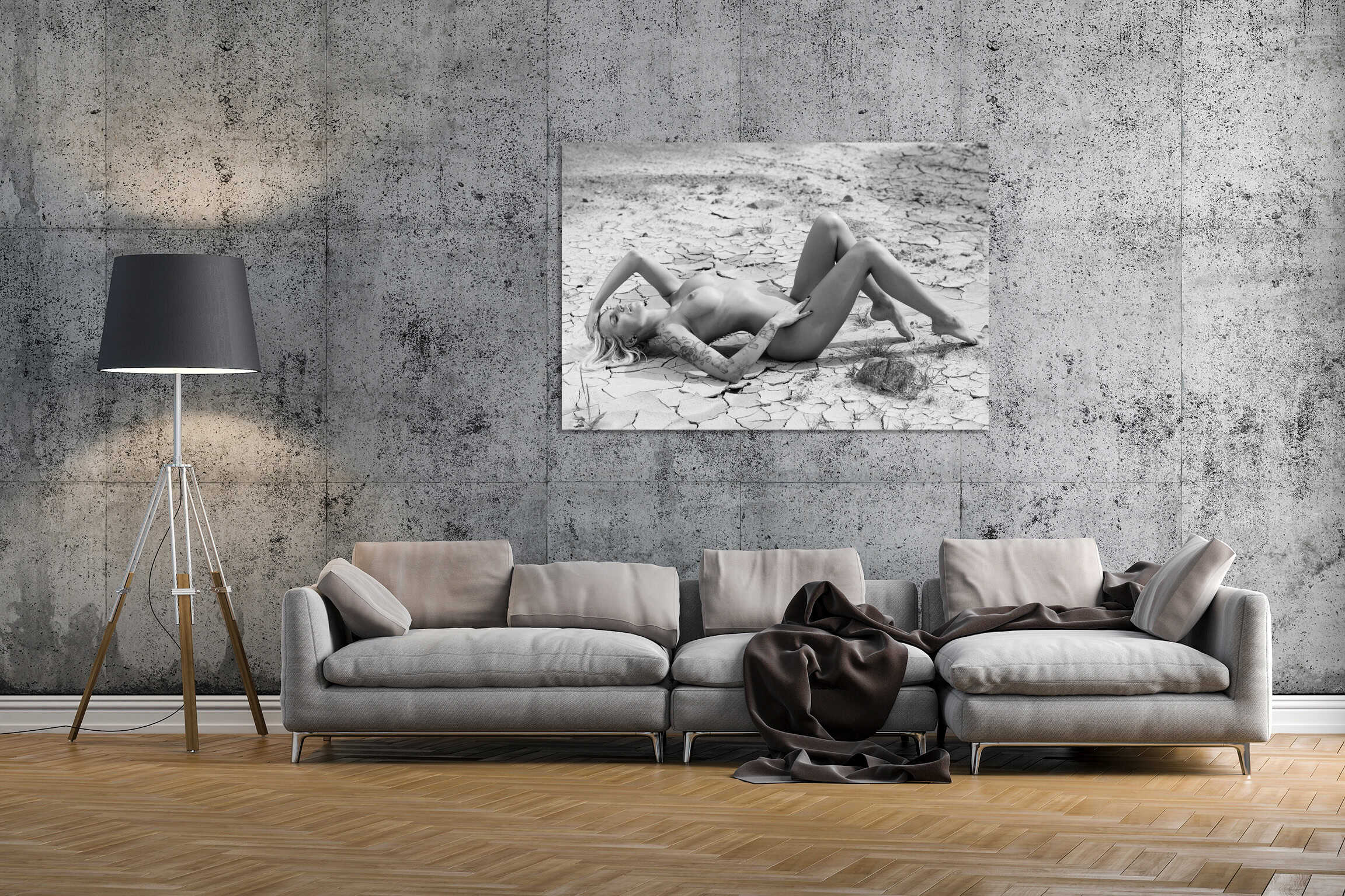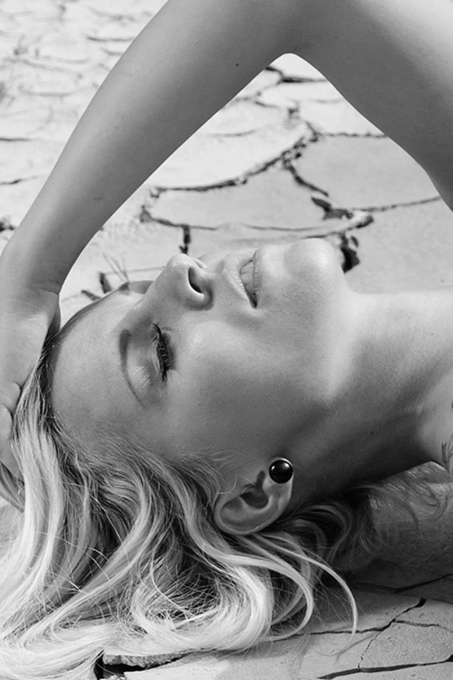 Desert meets attitude here. She’s lying in the middle of nowhere, the heat beating down, yet she remains cool and composed. Tattoos speak of stories merging with the dusty ground as she revels in the endless expanse. A touch of wildness in a world that seems to stand still.