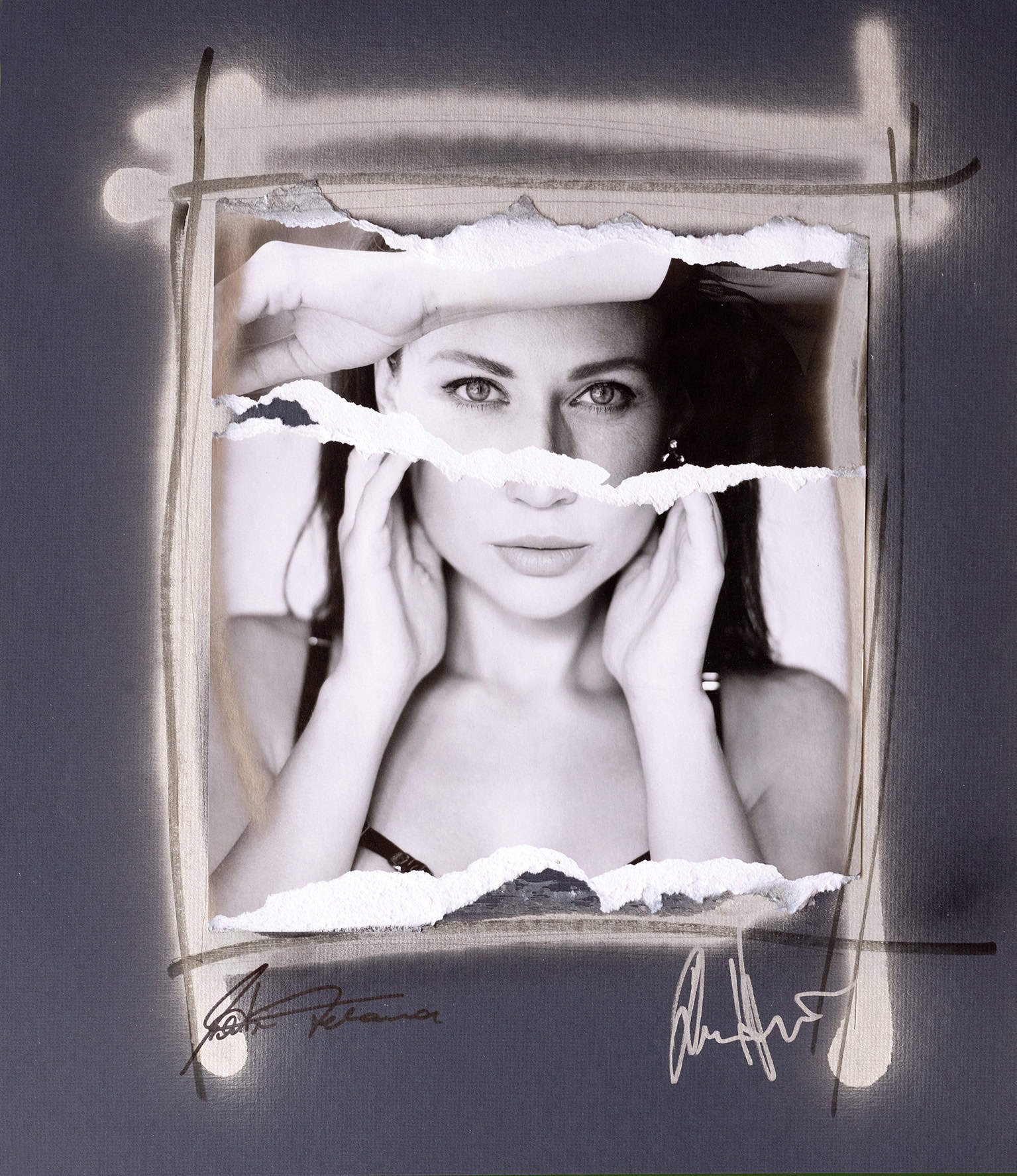 “Double Vision” kombiniert Fotografie und abstrakte Kunst. Die Schwarz-Weiß-Porträts von zwei verschiedenen Frauen, deren Gesichter durch das Zerreißen der Originalfotografien in mehrere Teile zerlegt und miteinander verbunden wurden, dominieren die Szene. Diese Technik verleiht dem Bild eine einzigartige visuelle Tiefe und eine spannende Dynamik. Die weichen, luftigen Pinselstriche um die Fotografien herum schaffen eine ätherische, fast traumhafte Atmosphäre. Die Kombination aus kräftigen Linien und zarten Schattierungen verleiht dem Werk eine moderne, fast futuristische Ästhetik. “Double Vision” ist ein visuelles Erlebnis, das sowohl stilvoll als auch tiefgründig ist.