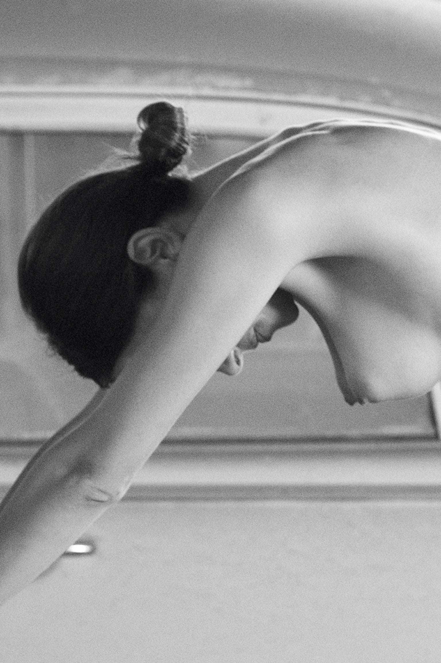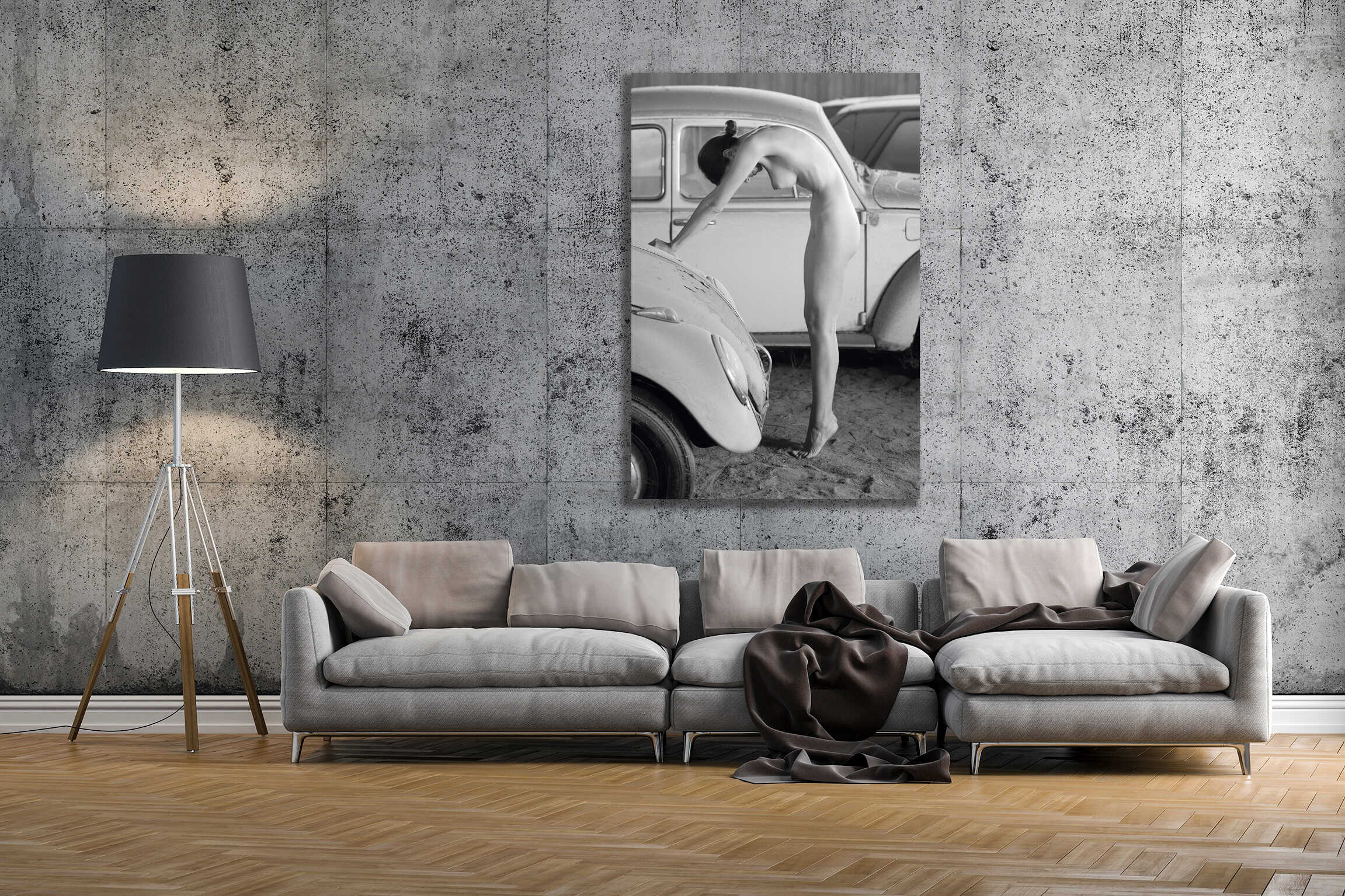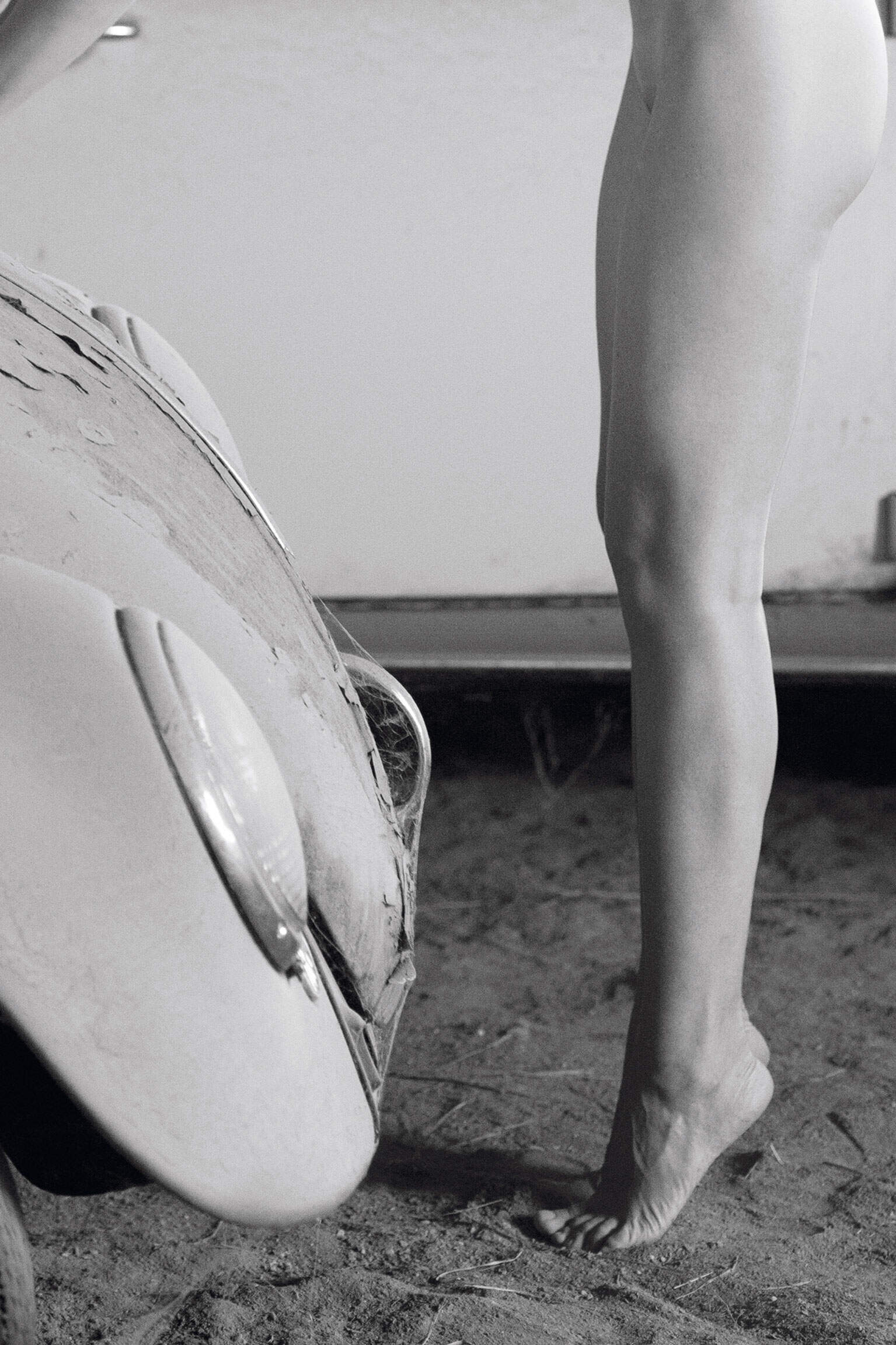 Die Inszenierung dieser Aufnahme spricht von einer suggestiven Melancholie und stillen Kraft. Der Kontrast zwischen der nackten, anmutigen Silhouette und den verlassenen, einst stolzen Fahrzeugen wirft Fragen über Vergänglichkeit und Beständigkeit auf. Die Frau und das Auto sind gleichsam Relikte verschiedener Epochen, vereint in einer Szene, die sowohl Vergänglichkeit als auch die Ewigkeit der Schönheit thematisiert. Es ist ein kraftvoller Dialog zwischen Mensch und Maschine, Leben und Zeit.