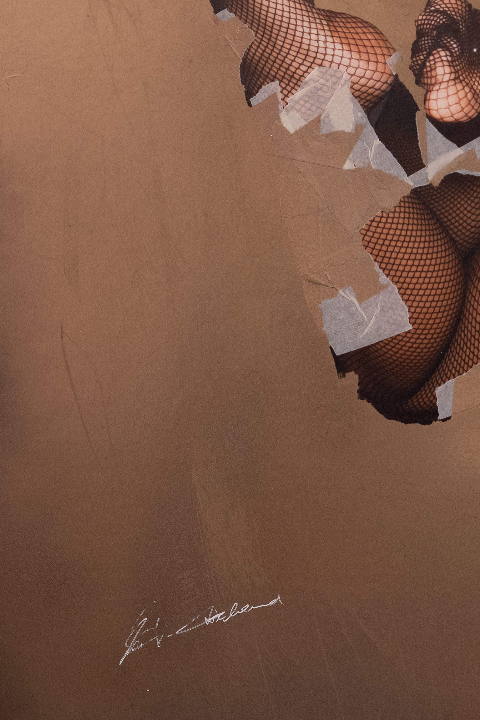 „Floating“ ist wie ein wilder Mix aus Abstraktion und Verführung. Die schwebende Figur, mit Klebestreifen und zerfransten Rändern, wirkt surreal und doch greifbar. Sie ist wie ein Puzzle aus Körperteilen, das sich selbst zusammenhält und gleichzeitig auseinanderbricht. Das goldene Setting bringt eine dezente, edle Note rein – gleichzeitig roh und schick.