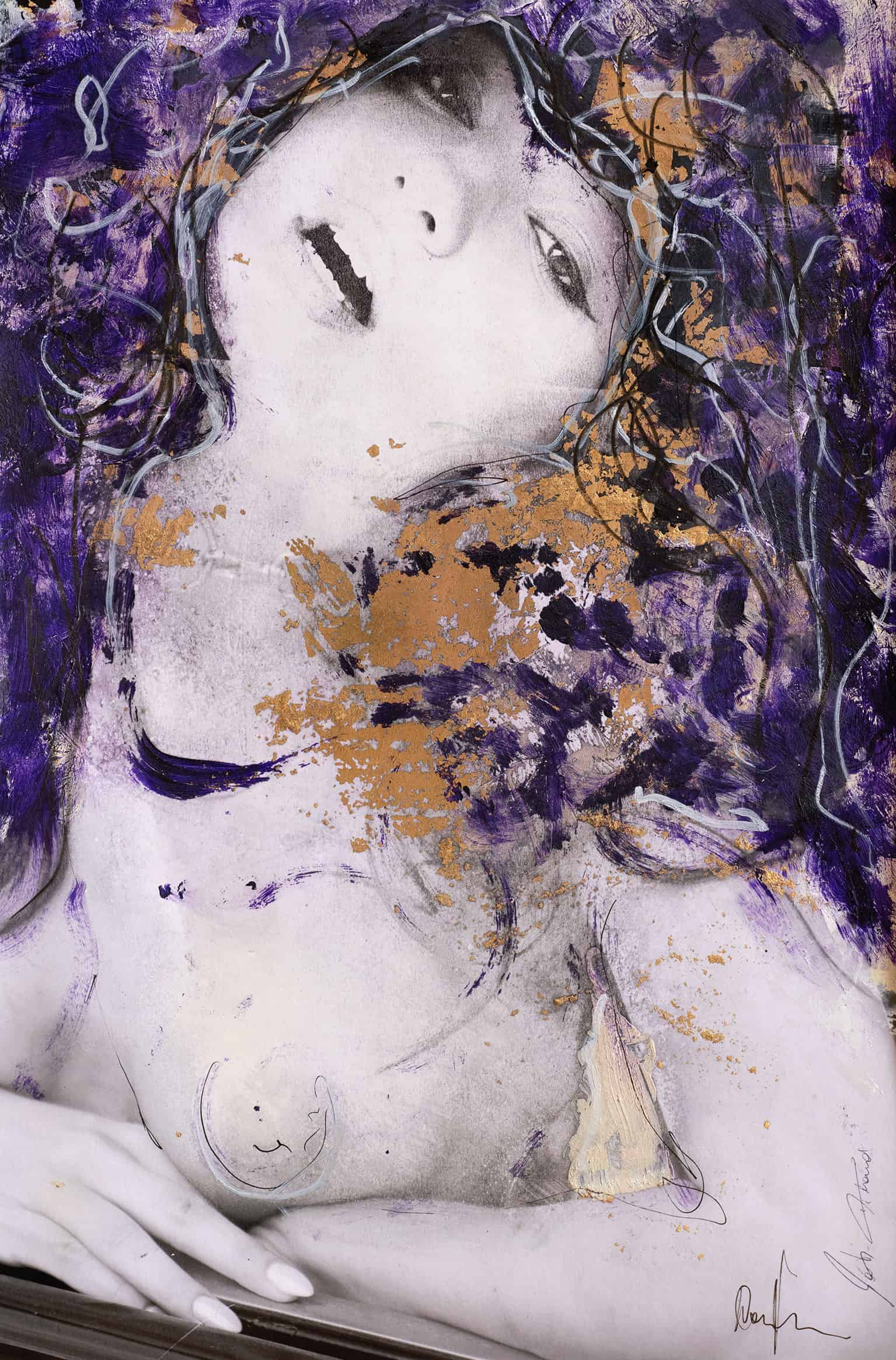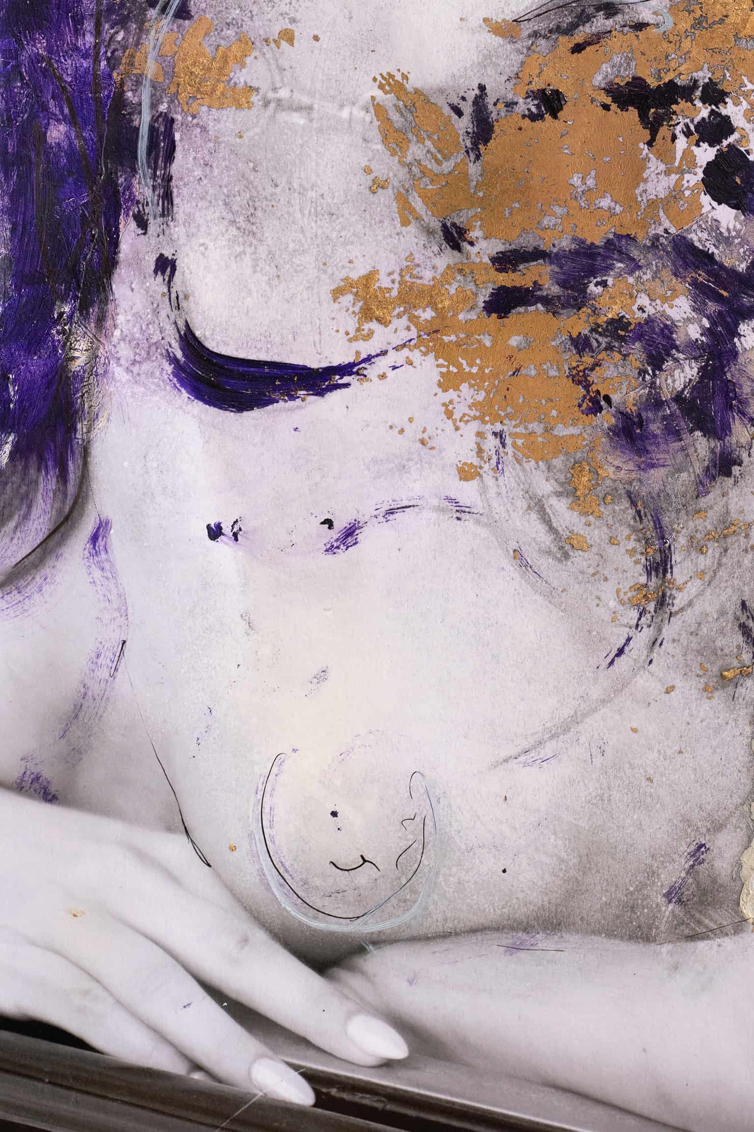 Die Übermalung bringt violette und goldene Elemente ein und verleiht dem Porträt eine frische und zeitgemäße Note. Die lebhaften Farben heben sich vom Graustufenbild ab und geben dem Werk eine lebendige und moderne Ausstrahlung. Es ist eine unerwartete Kombination, die den Betrachter fesselt und Interesse weckt.