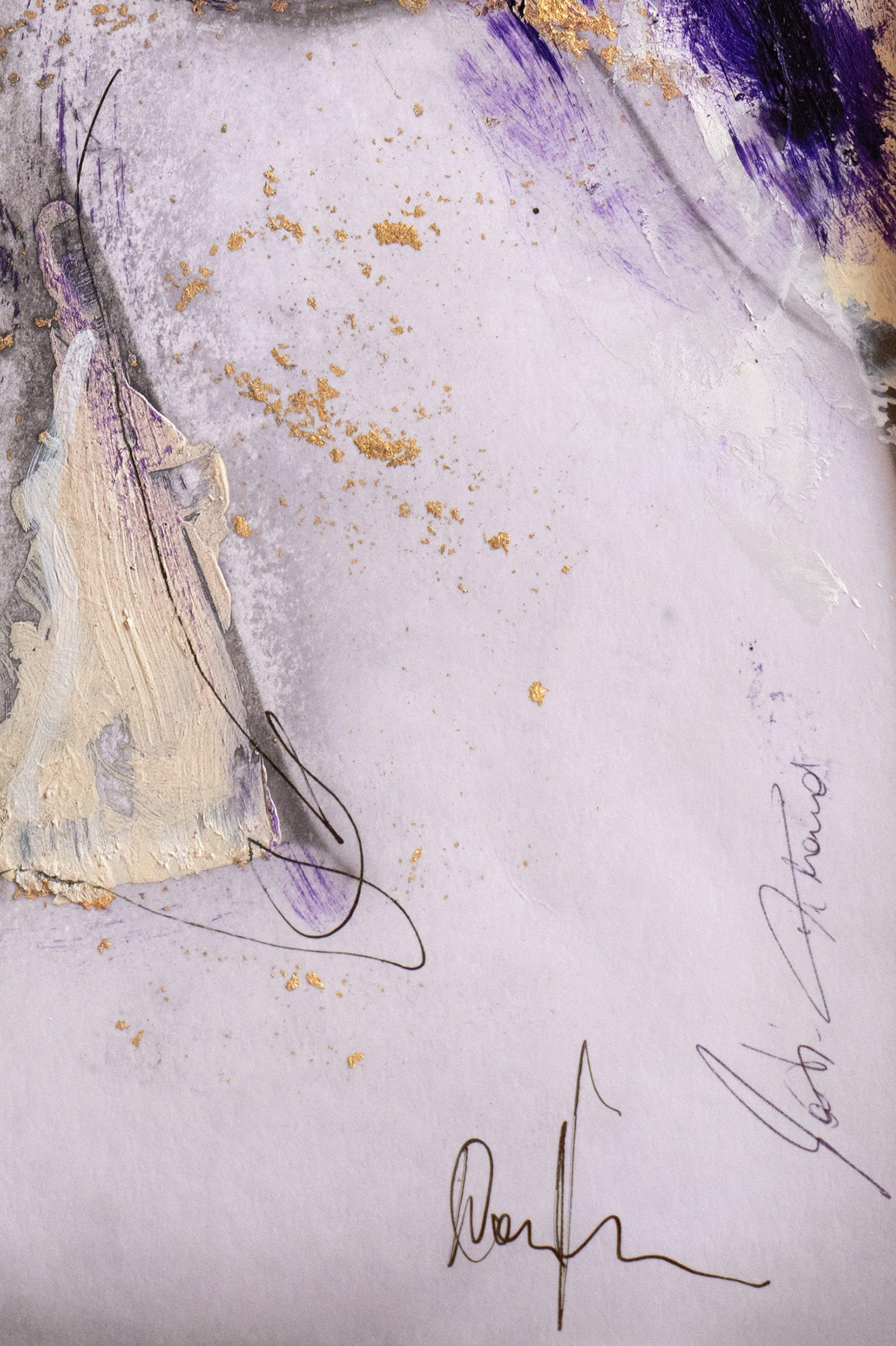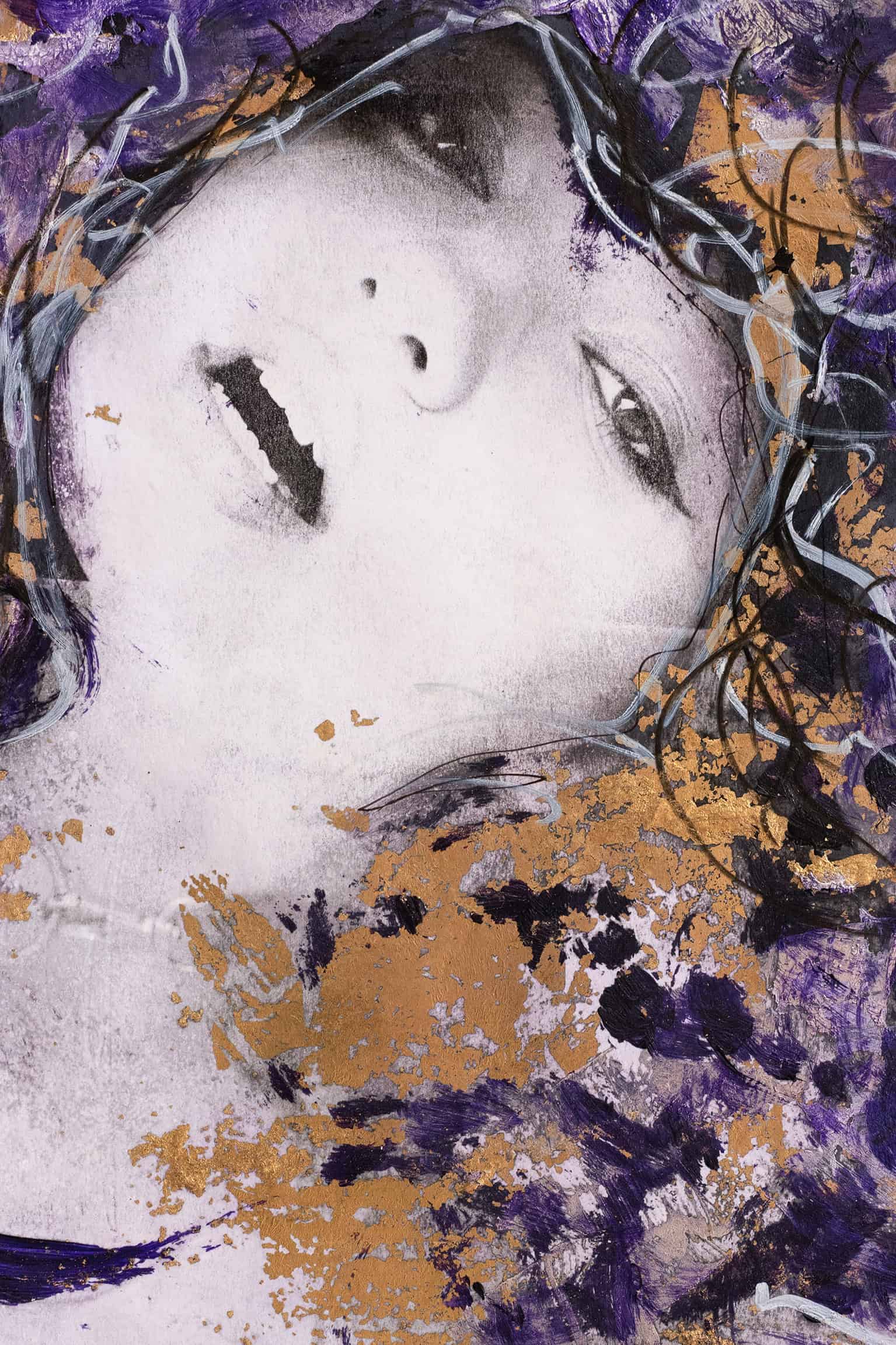 The overpainting introduces purple and gold elements, adding a fresh and contemporary touch to the portrait. The vibrant colors stand out against the grayscale, giving the piece a lively and modern feel. It’s an unexpected combination that draws the viewer’s eye and adds interest.