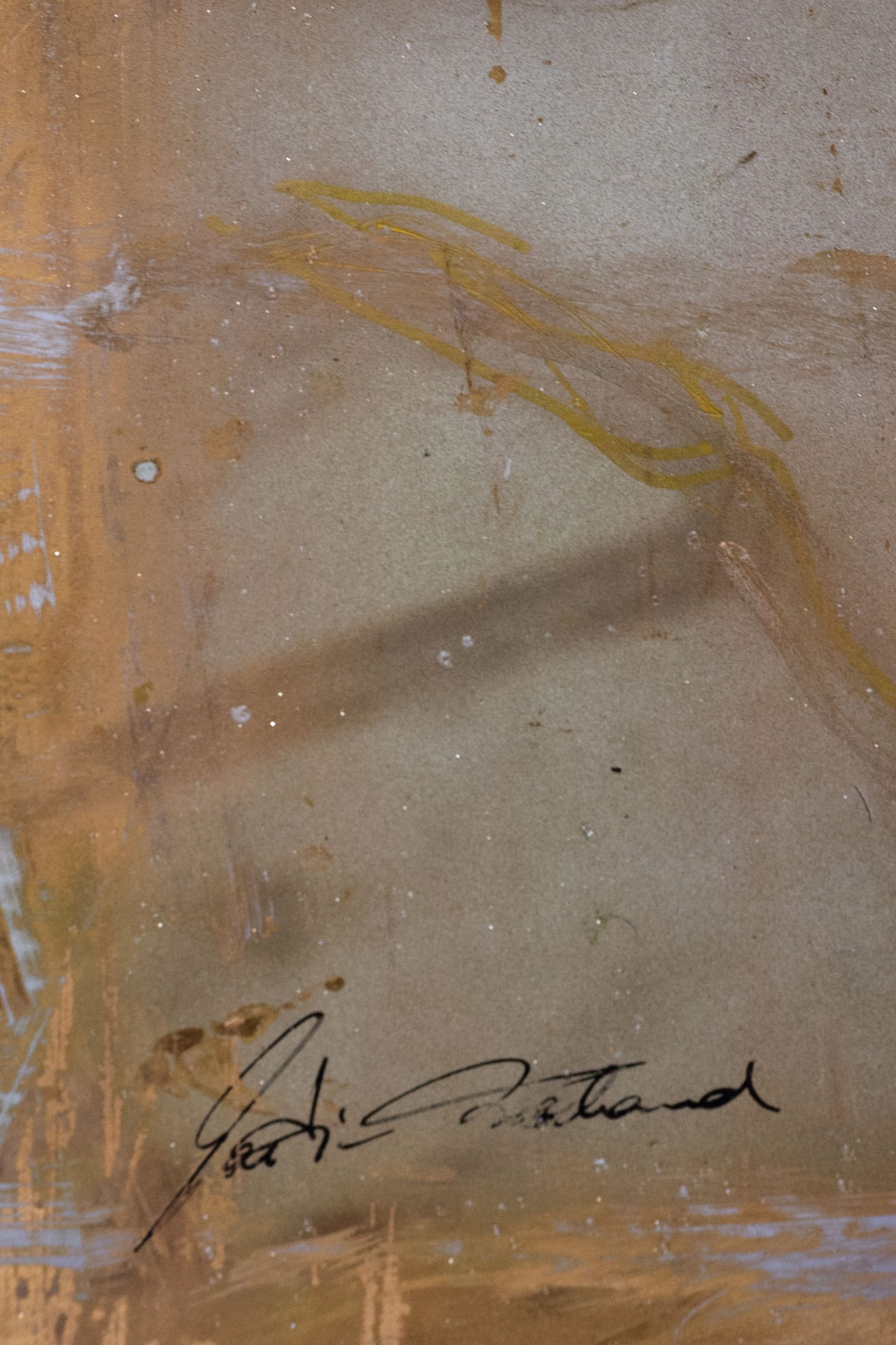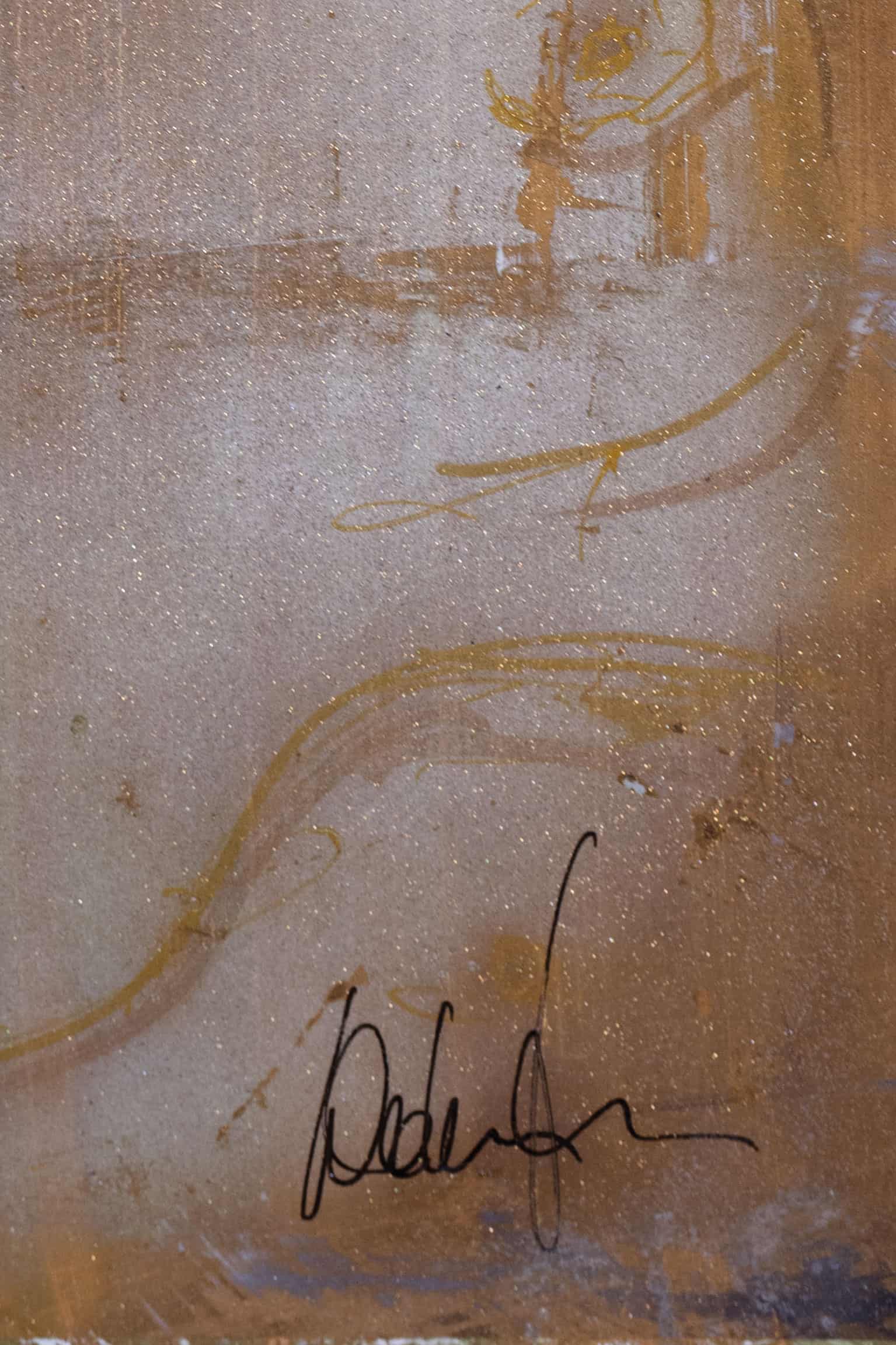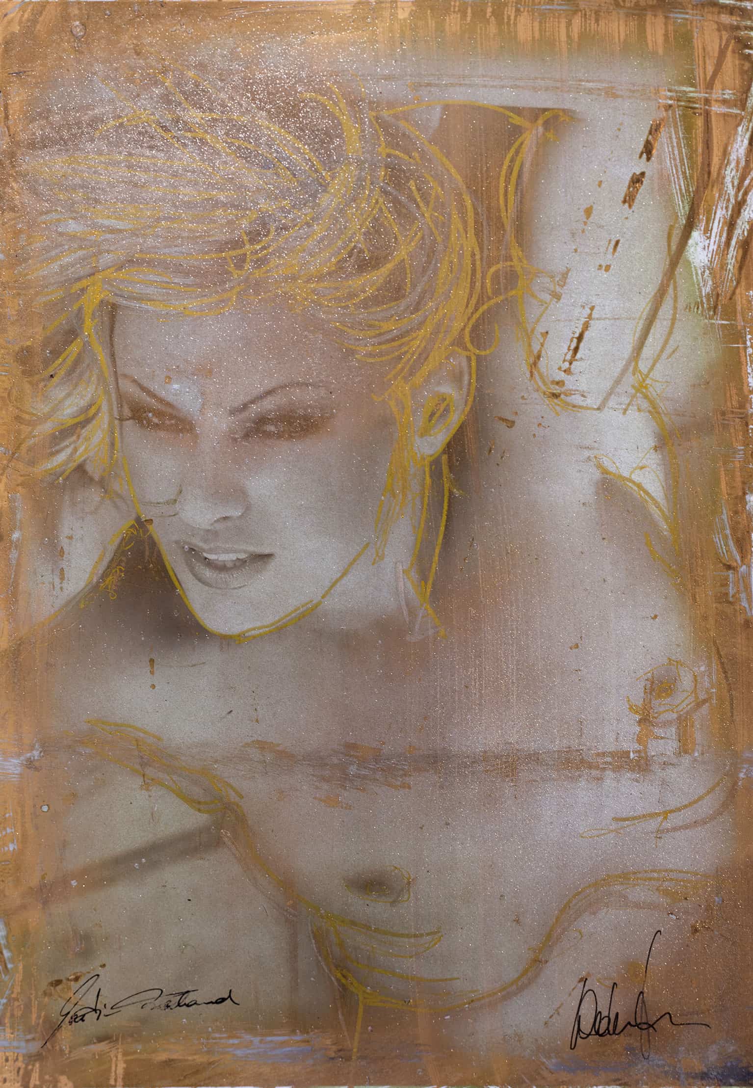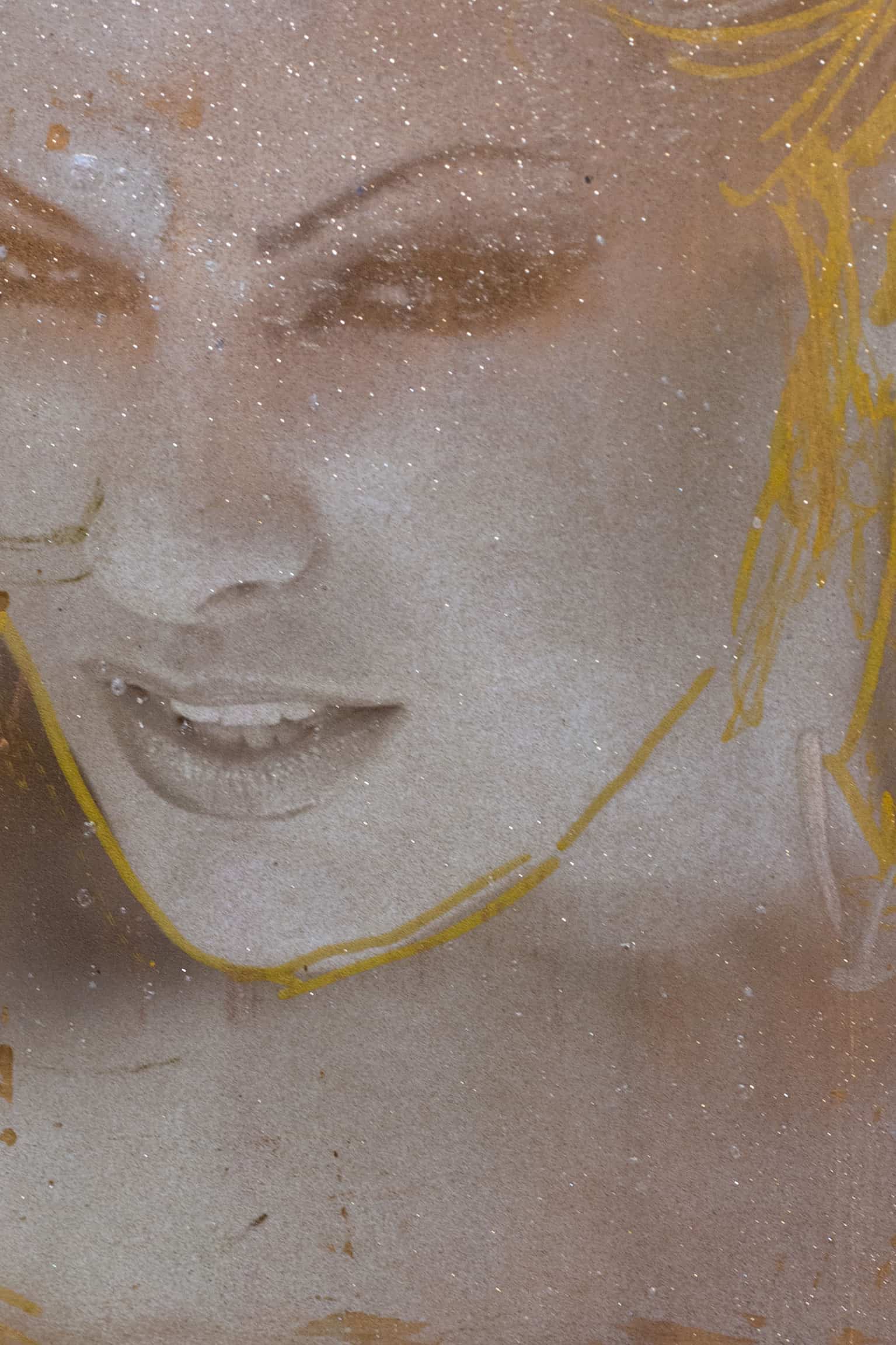 “Got to be Real” feels like a snapshot thrown onto a metallic canvas, then refined with a few casual brushstrokes. The woman stays in focus, unfiltered, no frills. It’s that mix of raw reality and light abstraction that grabs you. The gold-yellow lines? They’re more like spontaneous notes, adding a hint of rebellion. A piece that doesn’t need many words to make an impact.