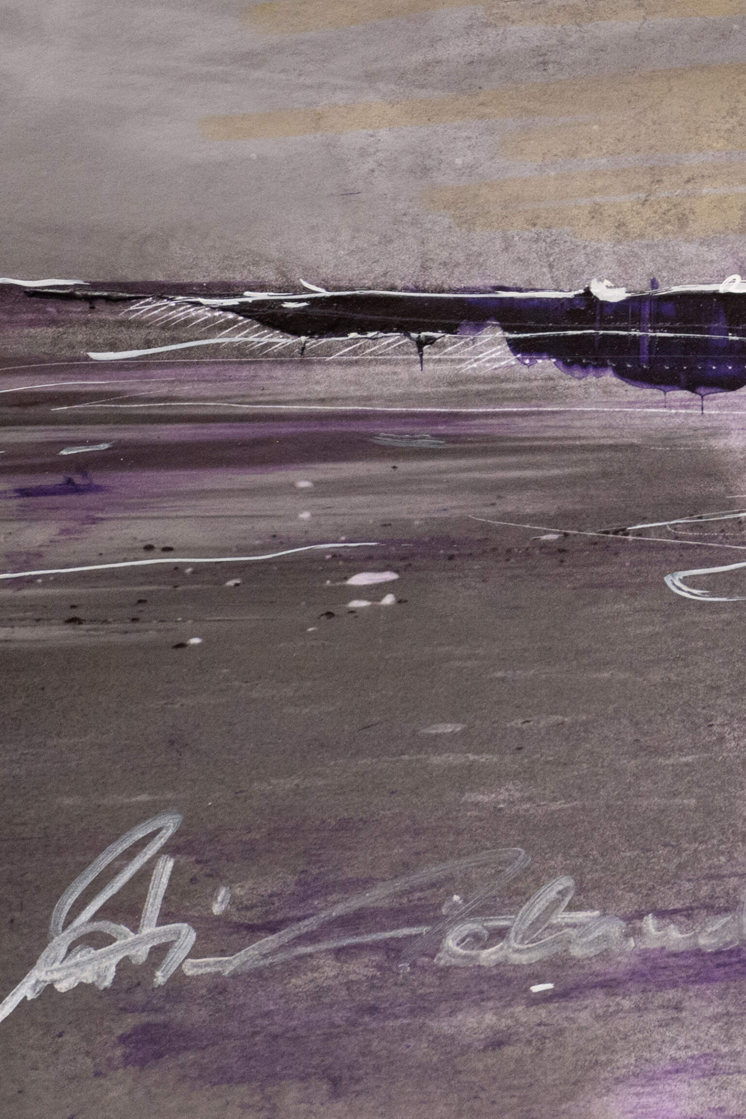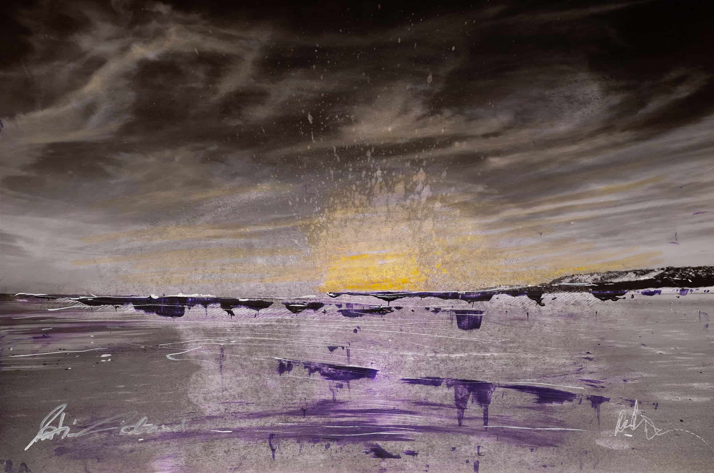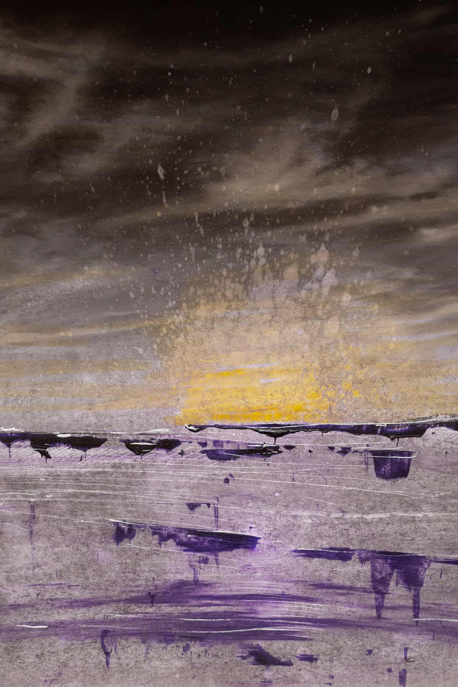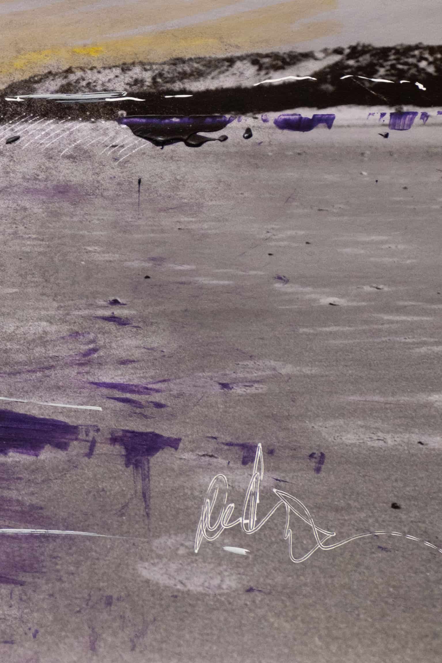 In einer düsteren Strandlandschaft offenbart sich eine Szenerie, die durch ihre Verlassenheit und Einsamkeit besticht. Die Hinzufügung von Gelb- und Lilatönen durch die Übermalung lenkt den Fokus auf die suggestive Atmosphäre des Bildes. Die subtile, aber wirkungsvolle Kombination dieser Farben erzeugt eine emotionale Spannung und eine Aura des Rätselhaften. Diese künstlerische Entscheidung erlaubt es dem Betrachter, eine persönliche Reise anzutreten, indem sie Raum für subjektive Interpretationen und Gedanken über die Bedeutung von Isolation, Vergänglichkeit oder auch einer verborgenen Hoffnung lässt.