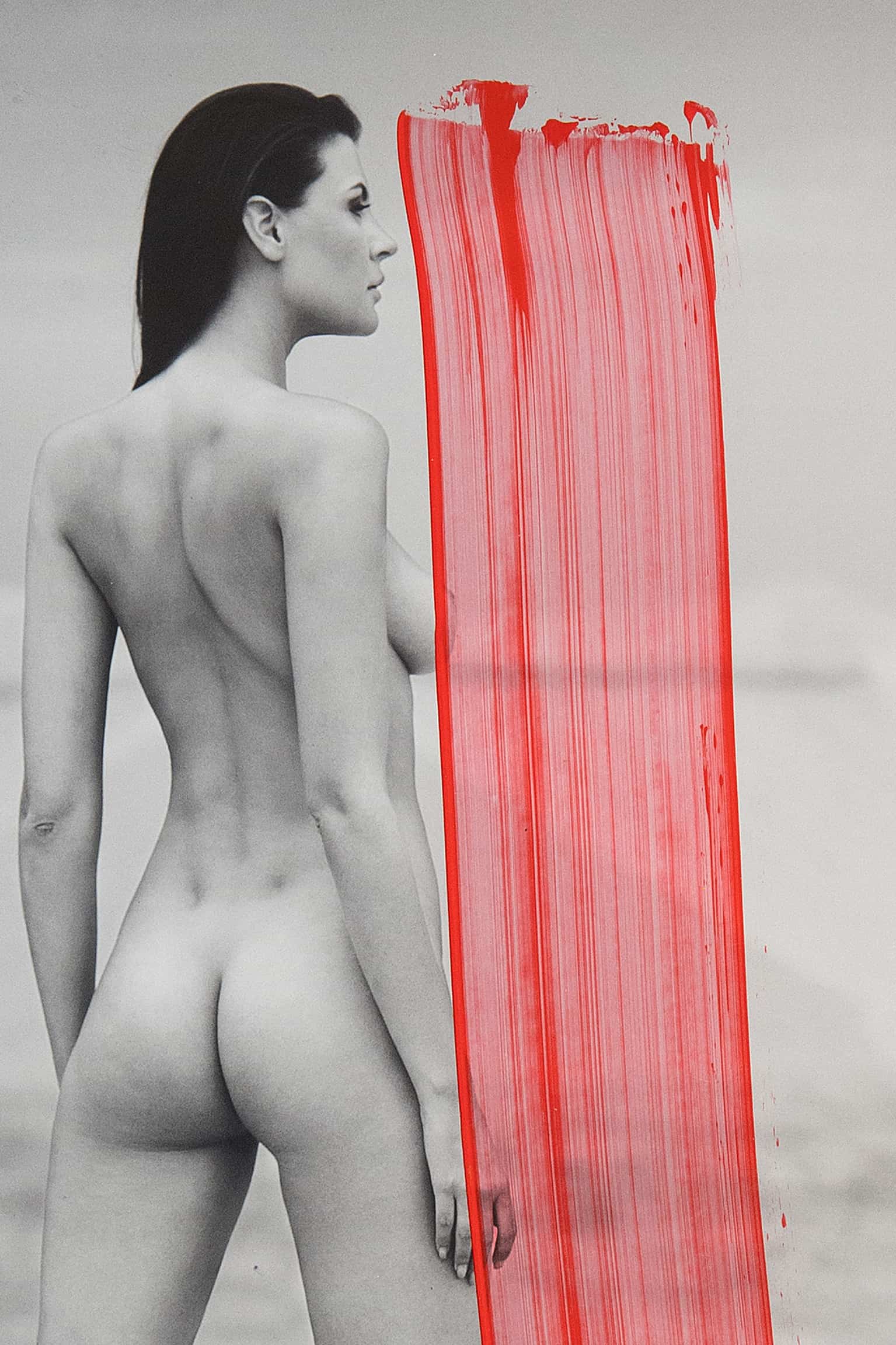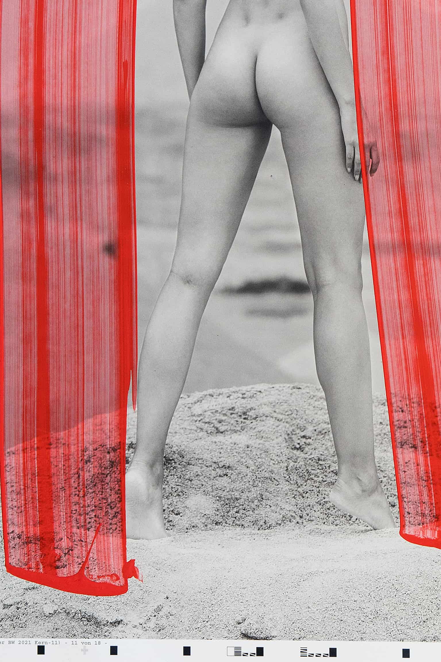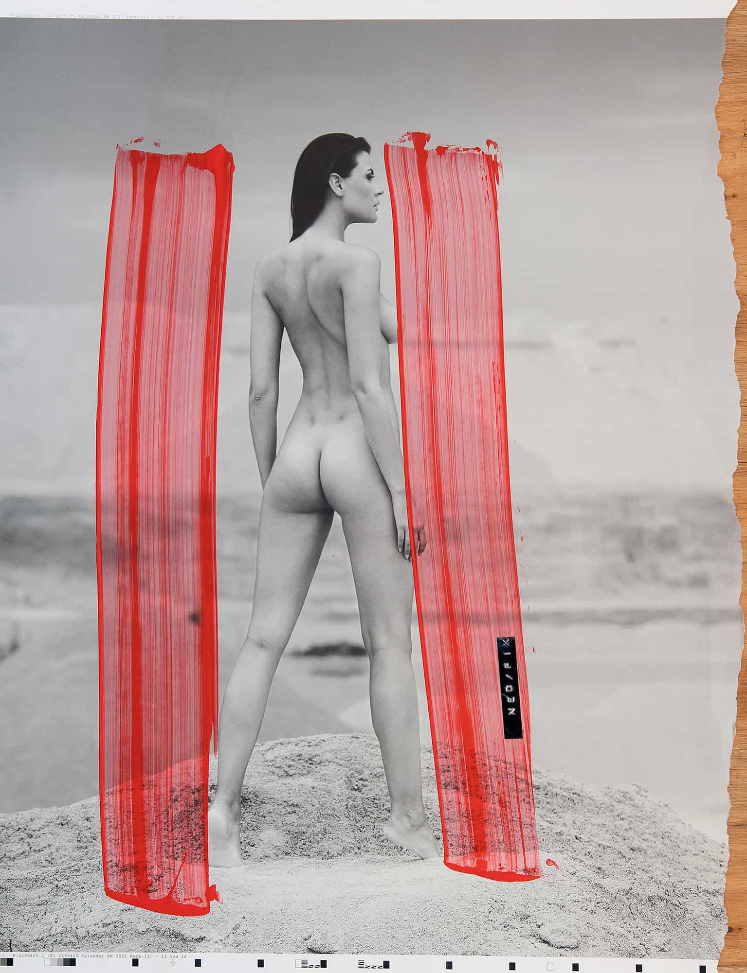 Dieses Aktfoto einer Frau in einer Wüstenlandschaft ist mehr als nur ein bloßes Bild – es ist eine künstlerische Reflexion über die Vereinigung von Natur und moderner Welt. Die beiden roten Streifen, gemalt mit Acrylfarbe, erinnern unweigerlich an einen bekannten Streaminganbieter und verleihen dem Werk eine zeitgenössische Note. Der Titel “Ned Fix” wirft Fragen auf und fordert den Betrachter heraus, seine eigene Interpretation zu finden, während die Landschaft als Bühne für die kraftvolle Präsenz der Frau dient, die gleichzeitig verletzlich und stark erscheint.