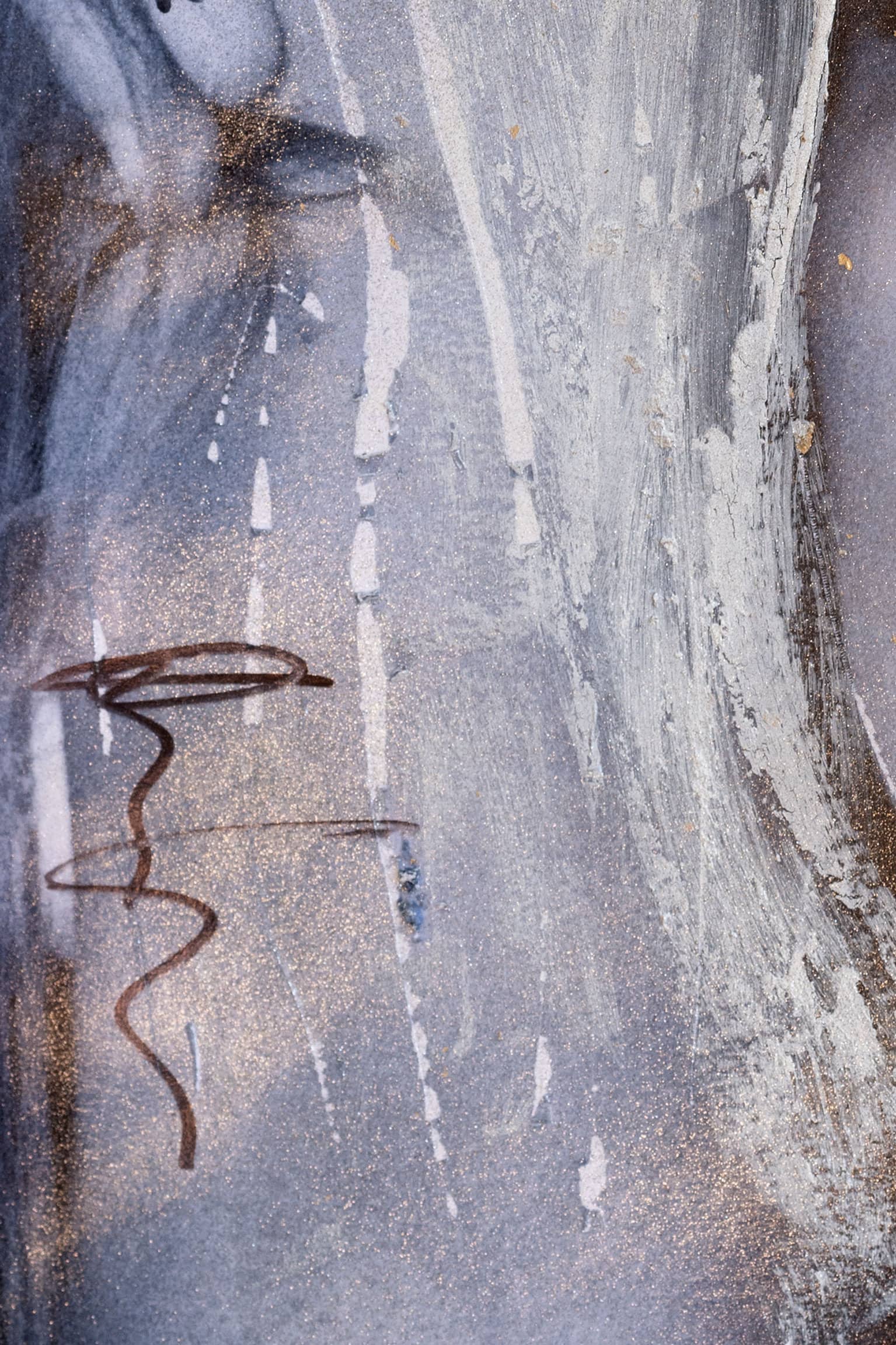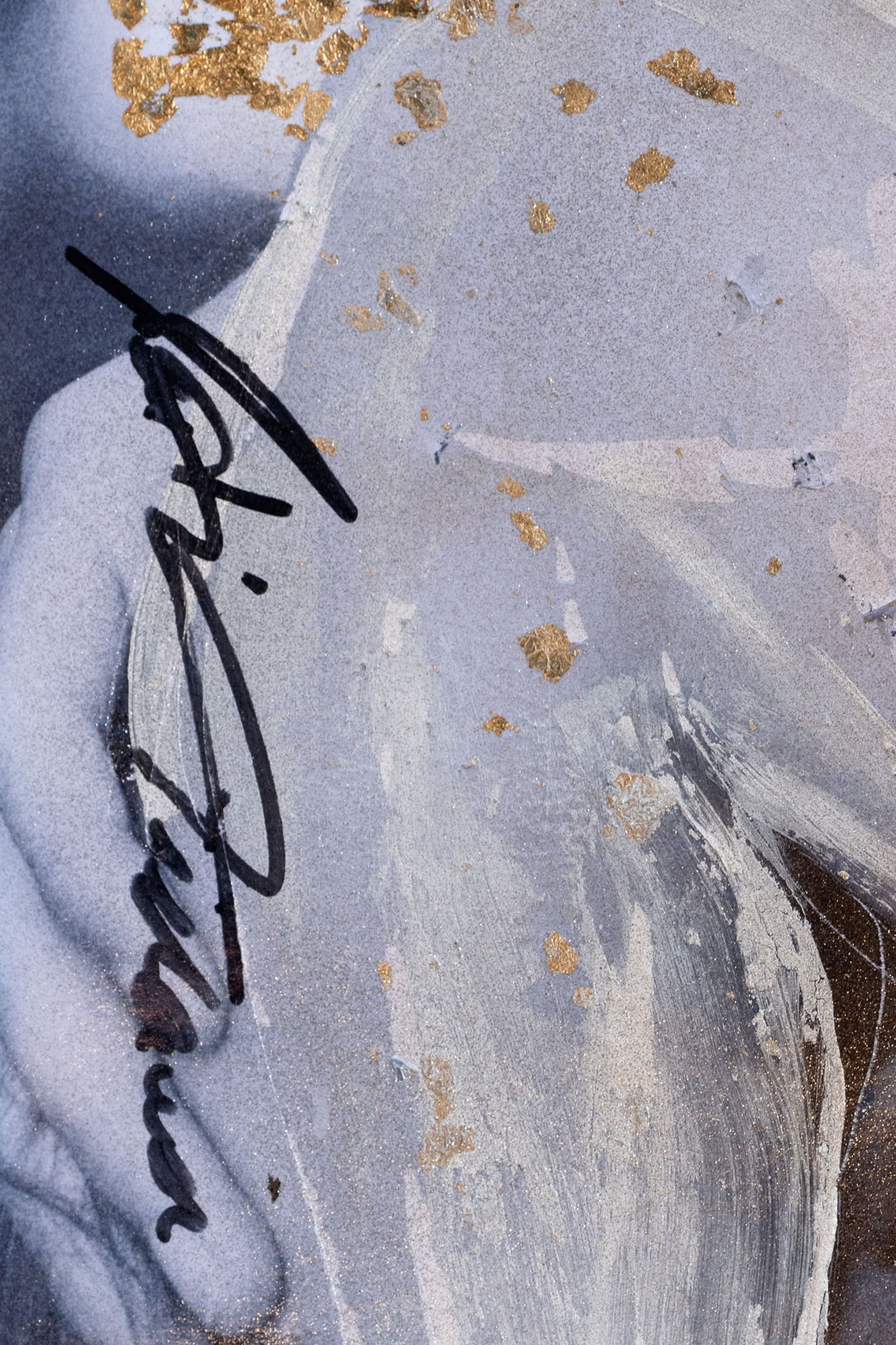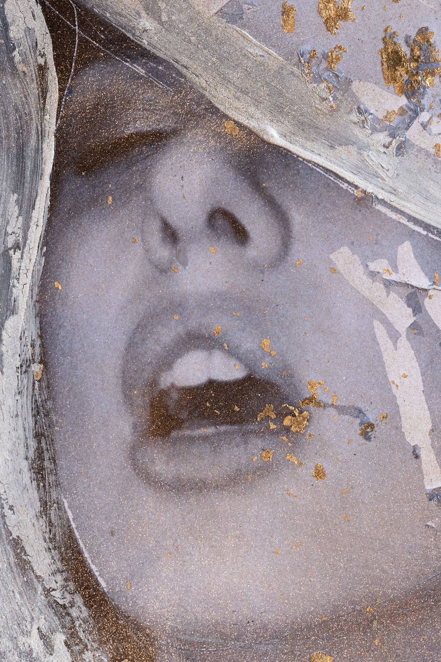 „OMG“ ist fast hypnotisch. Die Goldstücke flimmern wie elektrischer Strom über das Gesicht der Frau, das in einem Moment völliger Hingabe eingefangen ist. Die Mischung aus starkem Schwarz-Weiß und dem Bruch der Goldplättchen lässt die Szene dramatisch und zugleich fragil wirken. Es ist, als ob das Bild ein Eigenleben hätte, zwischen Abdeckung und Freigabe schwankend, unfertig und doch vollendet in seiner Rohheit.