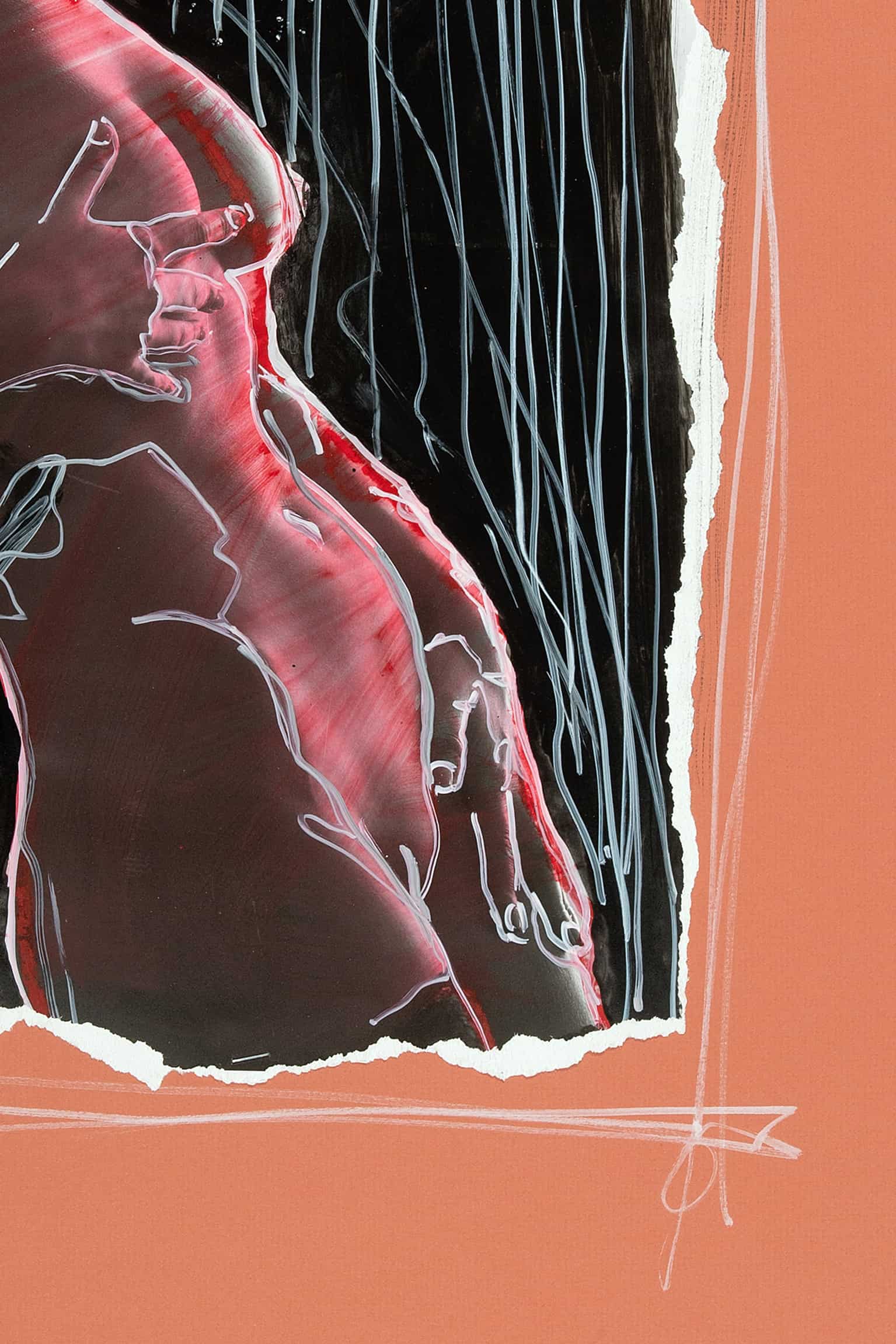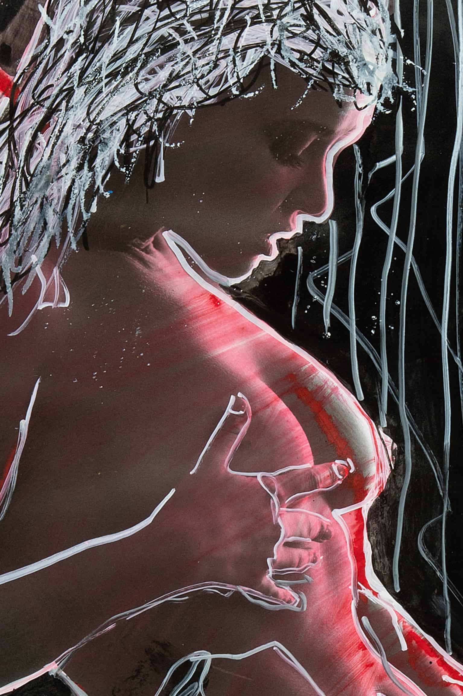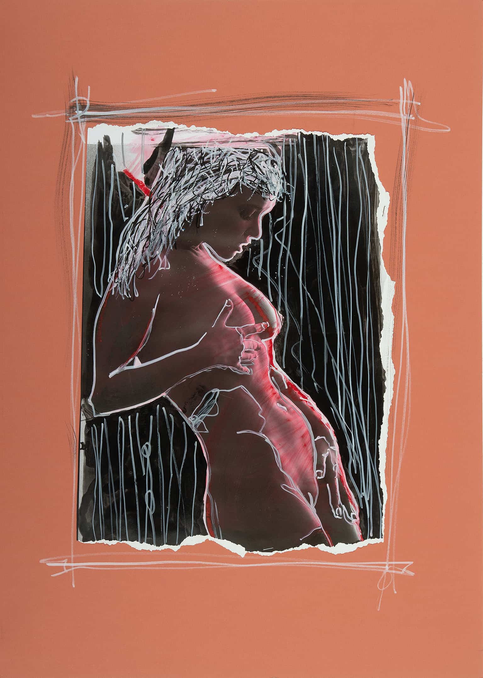 “On Strings” presents a contemplative silhouette emerging from a dance of shadow and purposeful flashes of light. The minimalist approach to color, punctuated by dynamic shades of red, establishes an impressive visual dialogue between form and void. This piece is a captivating reflection on intimacy and the layers of our soul, an expressive feature for spaces that value character and a touch of drama.