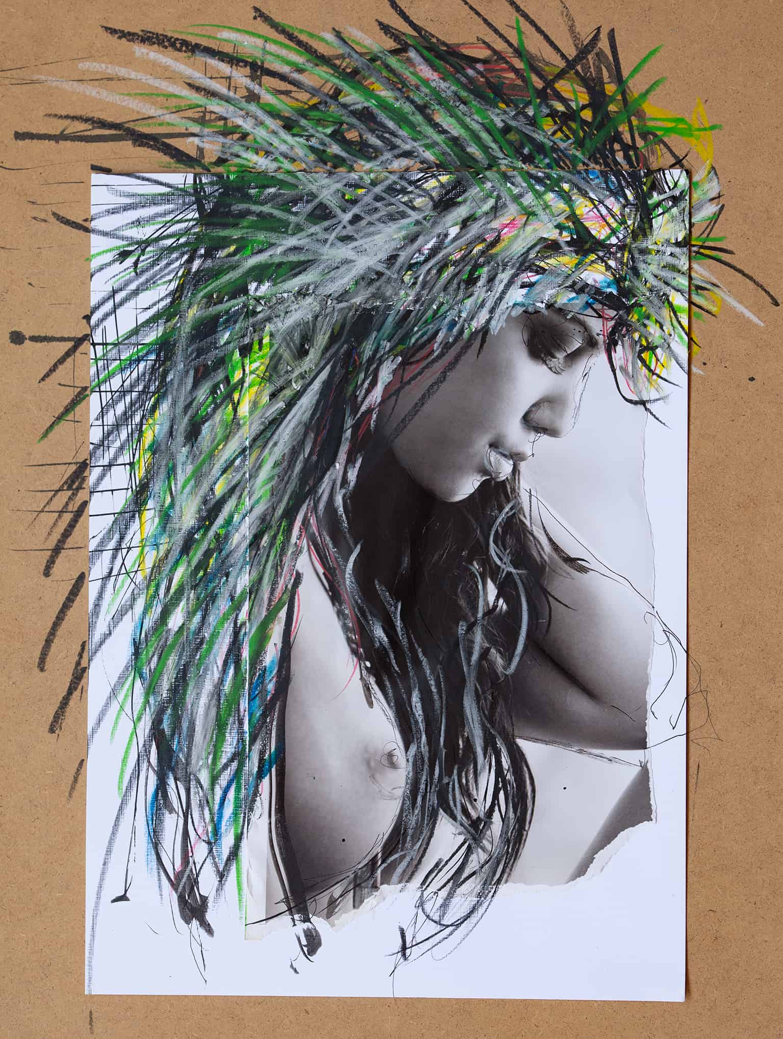 • Tusche, Wachsmalstifte, original Fotografie, Übermalung auf Karton