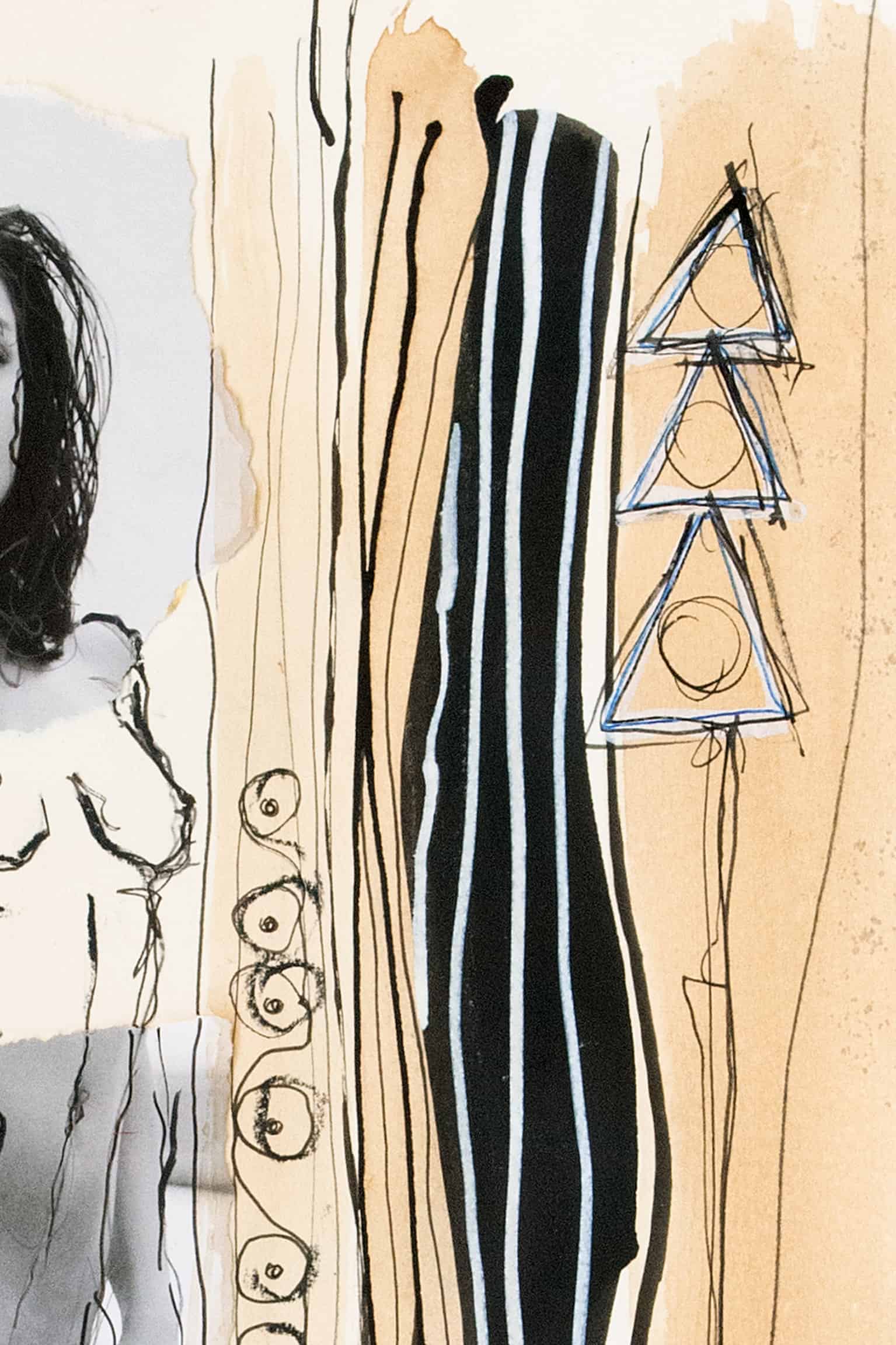 • Ink, coffee, crayon, opaque white, original photography, collage on paper.