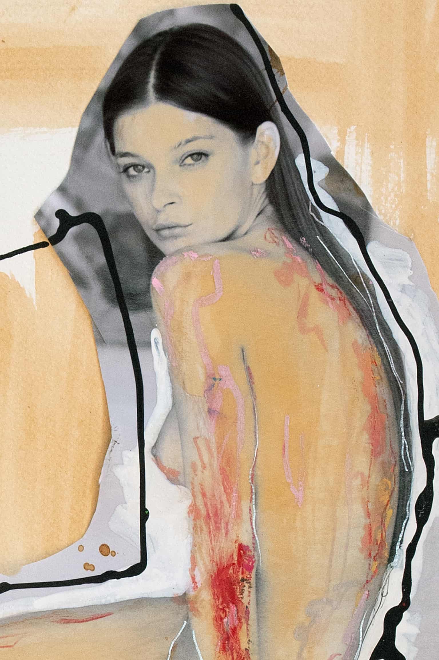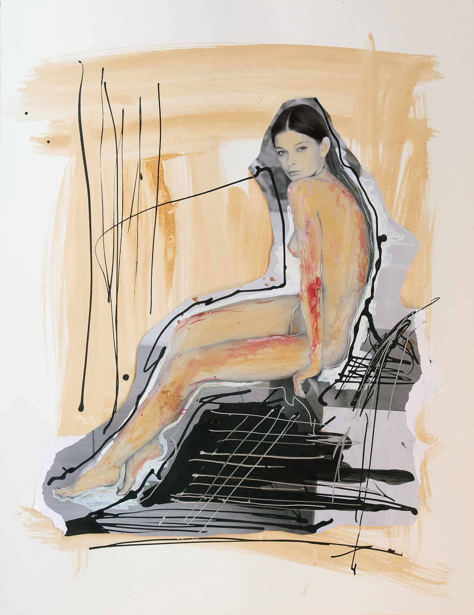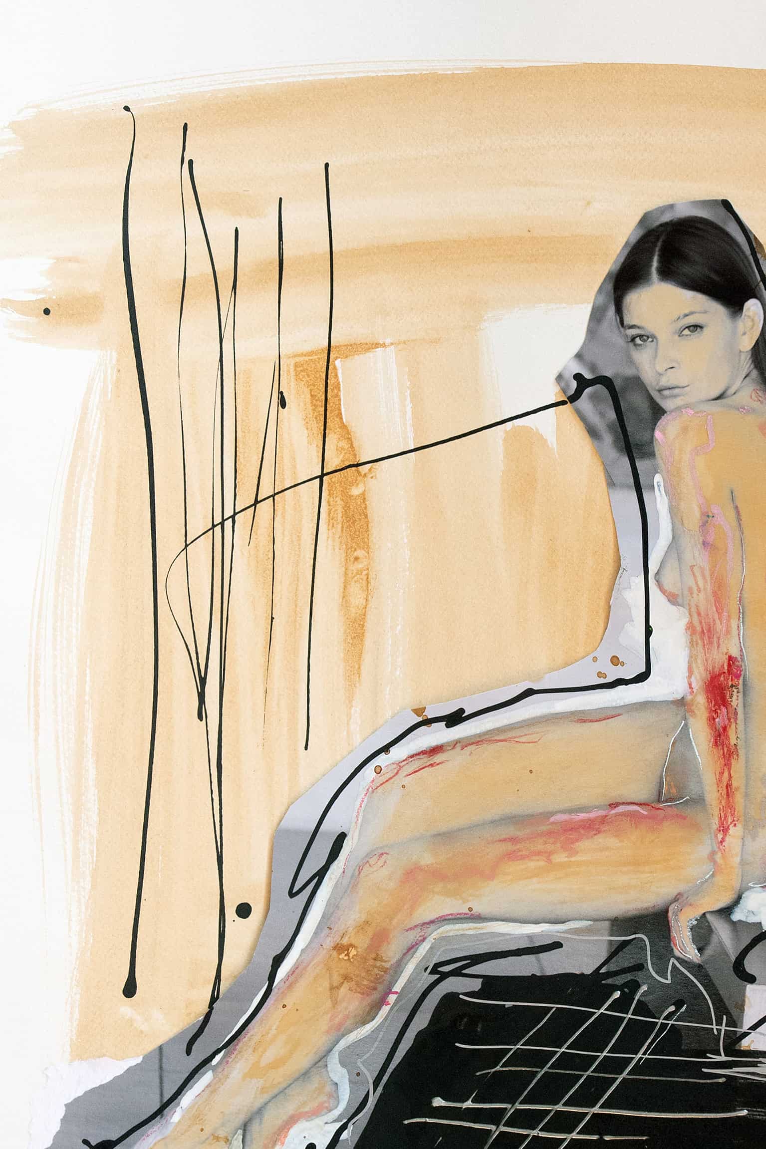 Bold and expressive, the figure stands amidst a play of abstraction and figurative art. Black lines embrace the contours, highlighting the human form in its fragility. The contrasting golden background enlivens the scene, as painted shadows and accents deepen the mood. It’s a contemporary take on the classical nude, a dialogue between the body’s strength and its representation on paper.