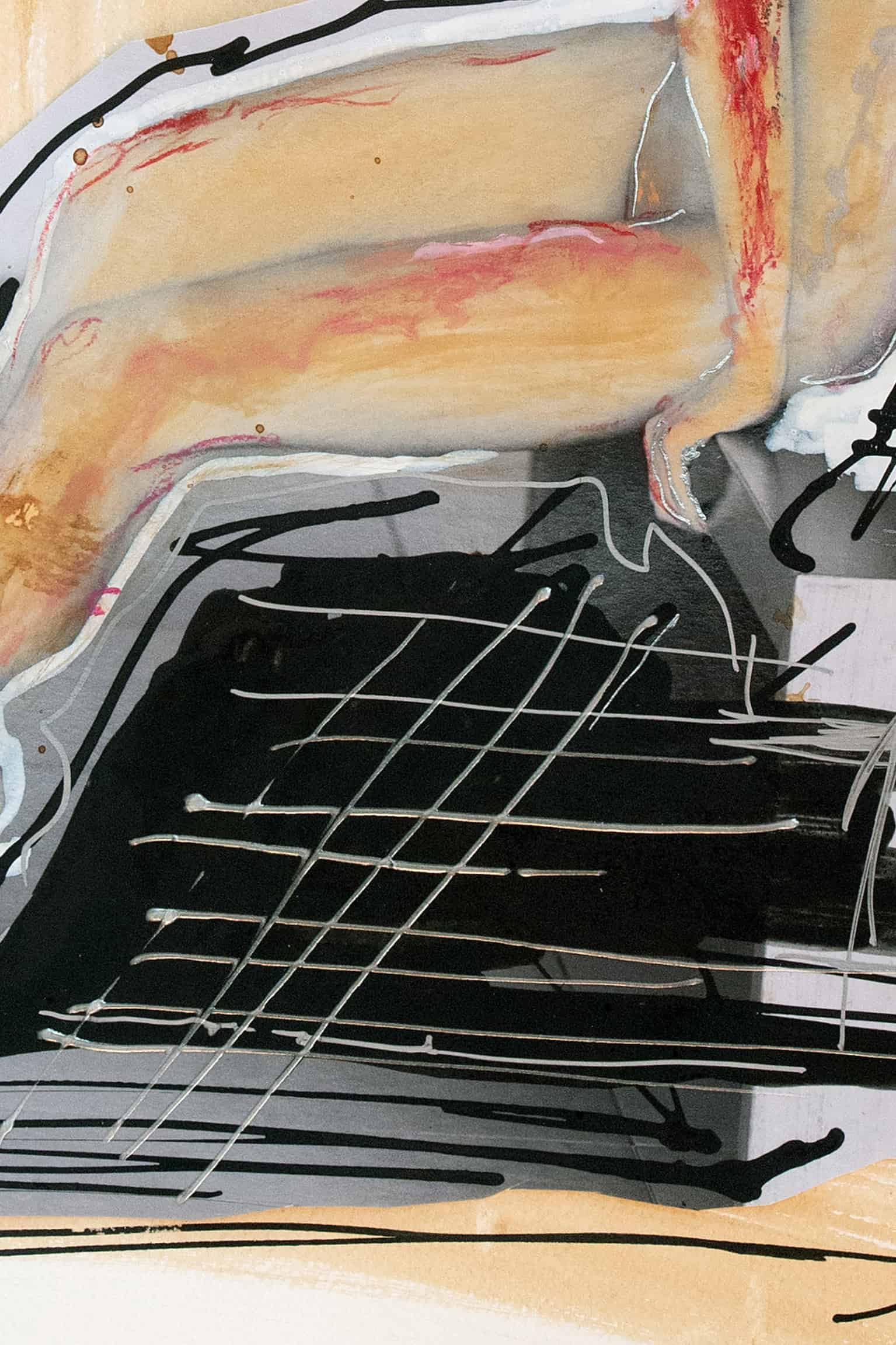 Roh und ausdrucksstark präsentiert sich die Figur, umgeben von einem Spiel aus Abstraktion und figurativer Kunst. Die schwarzen Linien umarmen die Konturen, betonen die menschliche Form in ihrer Fragilität. Der kontrastreiche goldene Hintergrund belebt die Szene, während die gemalten Schatten und Akzente die Stimmung vertiefen. Es ist eine zeitgenössische Interpretation des klassischen Aktes, ein Dialog zwischen der Kraft des Körpers und seiner Darstellung auf Papier.