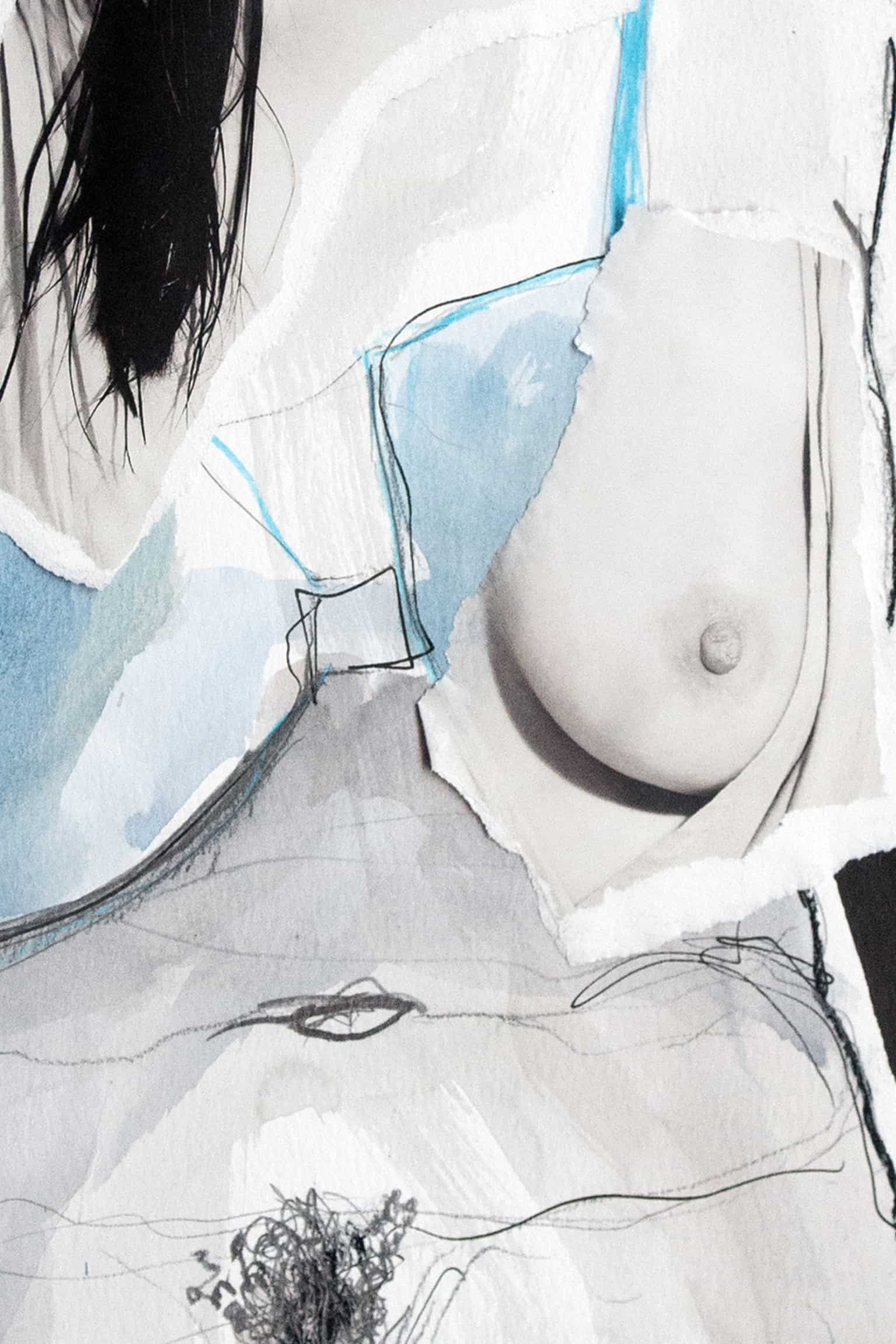 The image of a naked woman against a white wall captivates the viewer in a direct manner. The torn surface and the sketched outline of the body create an immediate and raw expressiveness. The background, rendered in dark black, evokes a sense of intensity and confrontation, while intermittent yellow and blue accents provide a slight contrast. This portrayal is unapologetic, raising questions about vulnerability, power, and the interplay between beauty and pain. The artwork provokes us to reflect on our own emotions and societal norms. It is a challenging and evocative representation of the human experience, compelling us to confront the immediate and unfiltered reality of life.