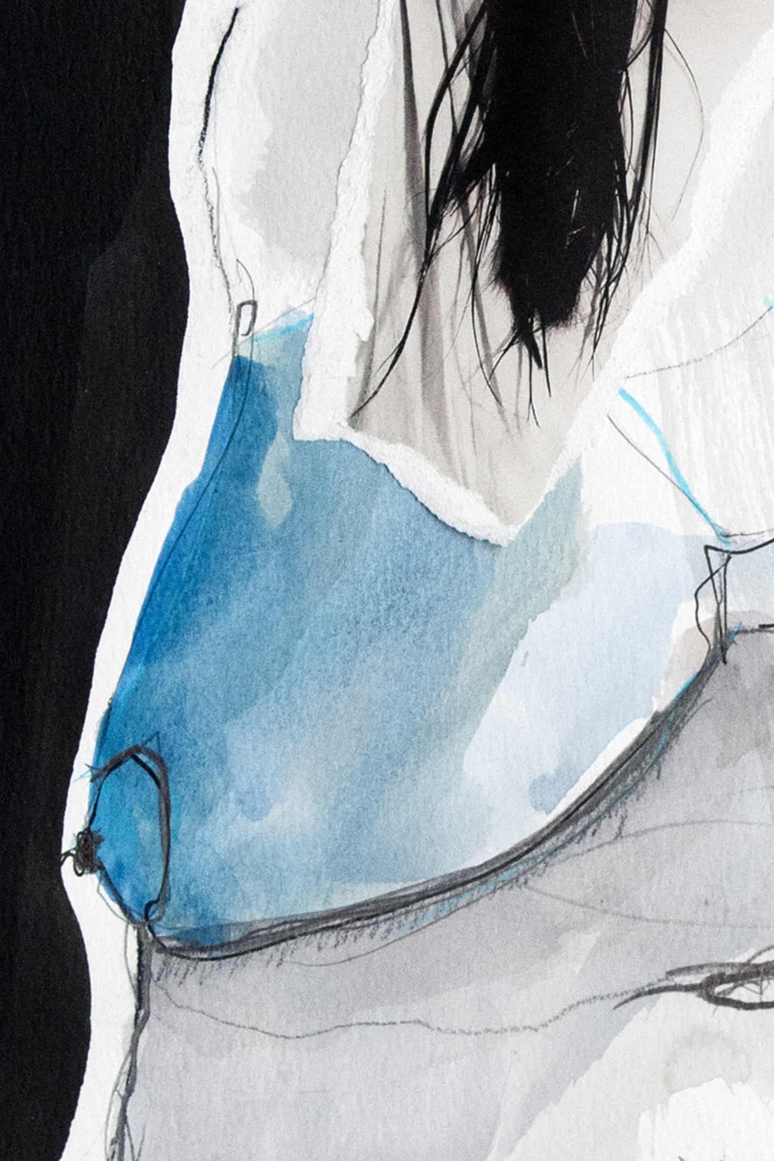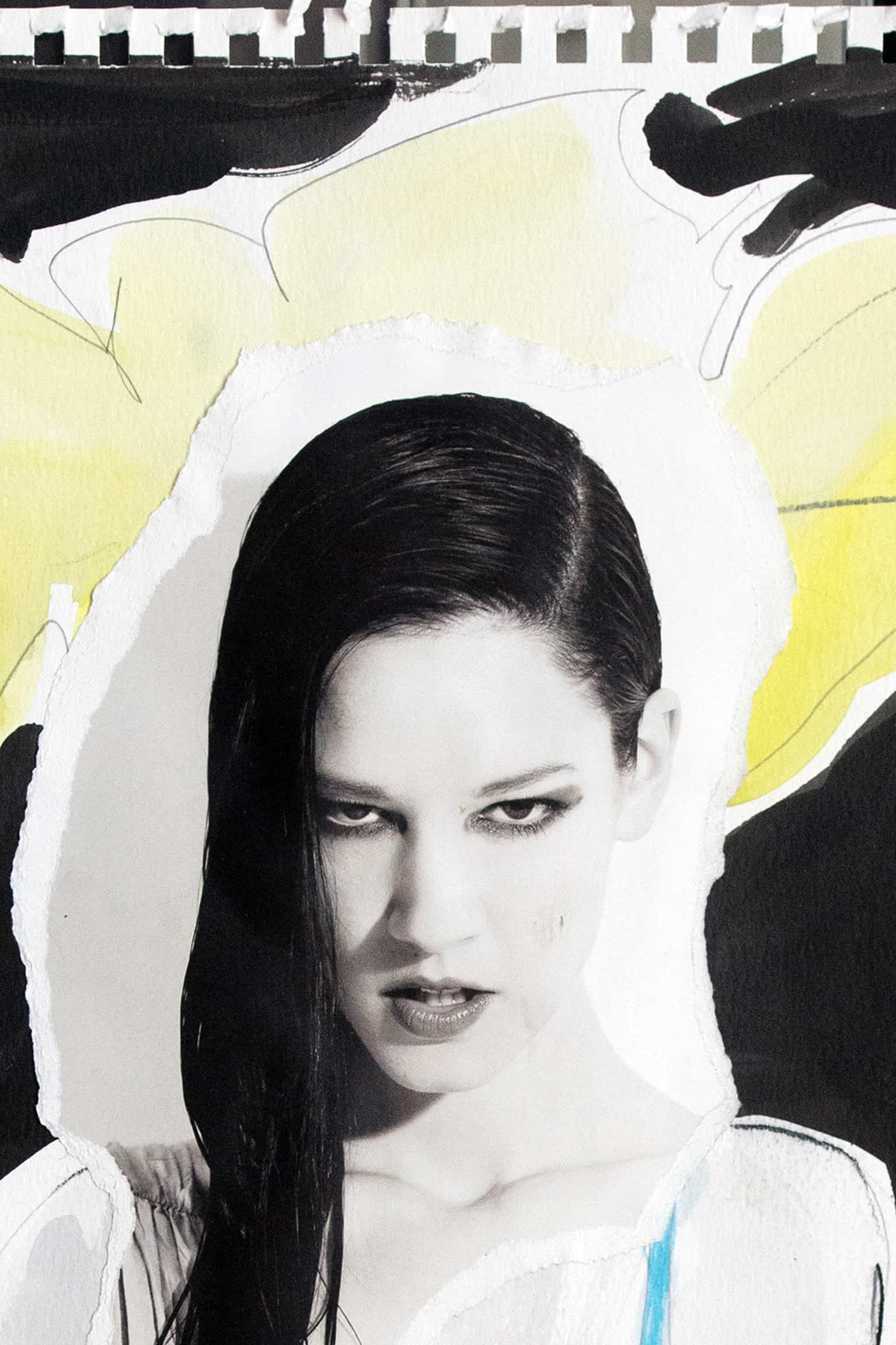 Das Bild einer nackten Frau vor einer weißen Wand fesselt den Betrachter auf direkte Weise. Durch die gerissene Oberfläche und die nachgezeichnete Skizze des Körpers entsteht eine unmittelbare und rohe Ausdruckskraft. Der Hintergrund, in düsterem Schwarz, erzeugt eine Atmosphäre der Intensität und Konfrontation, während gelbe und blaue Akzente dazwischen gesetzt sind und die Stimmung etwas aufhellen. Diese Darstellung ist schonungslos und wirft Fragen nach Verletzlichkeit, Macht und dem Spannungsfeld von Schönheit und Schmerz auf. Das Kunstwerk provoziert uns, unsere eigenen Emotionen und gesellschaftlichen Normen zu reflektieren.