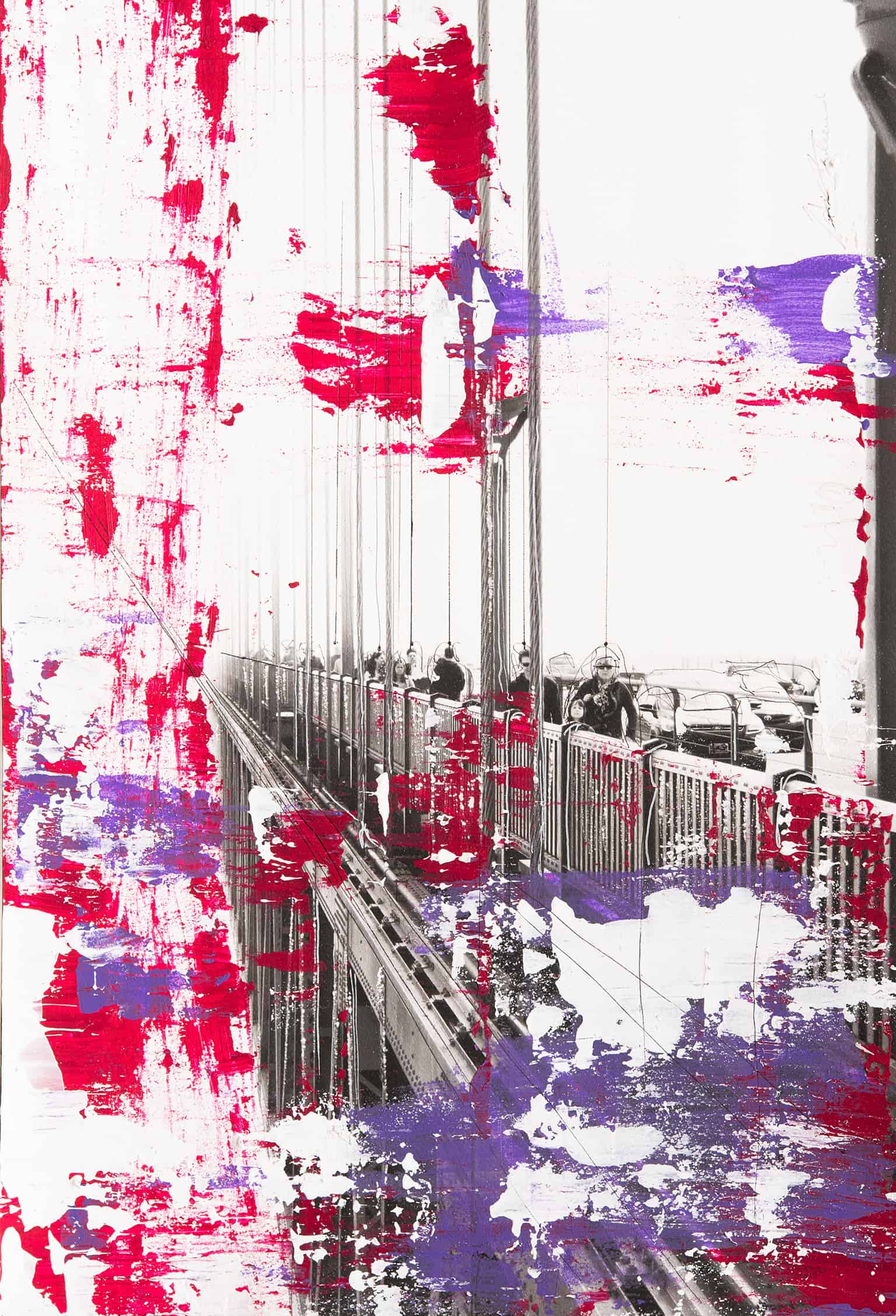 This Original artwork presents the Golden Gate Bridge from an unexpected angle: Captured in black and white, the image depicts a lively scene with people and cars, while powerful overlays intensify the dynamism. The artistic rework creates a distinct fusion of reality and artistic interpretation. It encapsulates the bridge’s bustling energy, infusing the picture with captivating depth. The overlays contribute to vividly portraying the busy activity on the bridge, offering a fresh, intense perspective on this world-renowned location.
