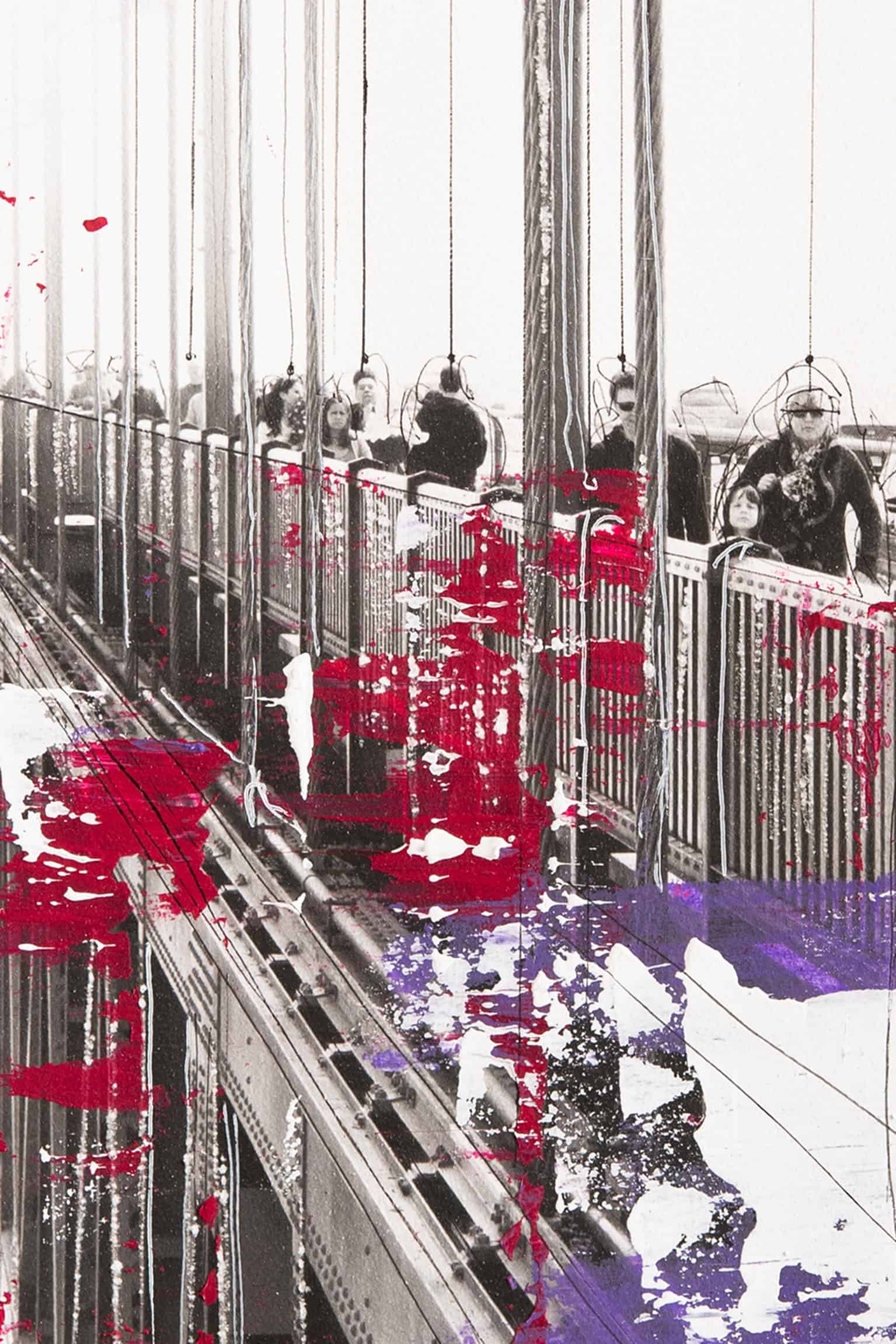 Das Originalkunstwerk präsentiert die Golden Gate Bridge aus einer unerwarteten Perspektive: Fotografiert in Schwarz-Weiß, zeigt das Bild eine lebhafte Szene mit Menschen und Autos, während kraftvolle Übermalungen die Dynamik verstärken. Die künstlerische Überarbeitung schafft eine markante Verschmelzung von Realität und künstlerischer Interpretation. Sie fängt die hektische Energie der Brücke ein und verleiht dem Bild eine faszinierende Tiefe. Die Übermalung trägt dazu bei, das geschäftige Treiben auf der Brücke plastisch und lebendig darzustellen, und eröffnet somit einen neuen, intensiven Blick auf diesen weltberühmten Ort.