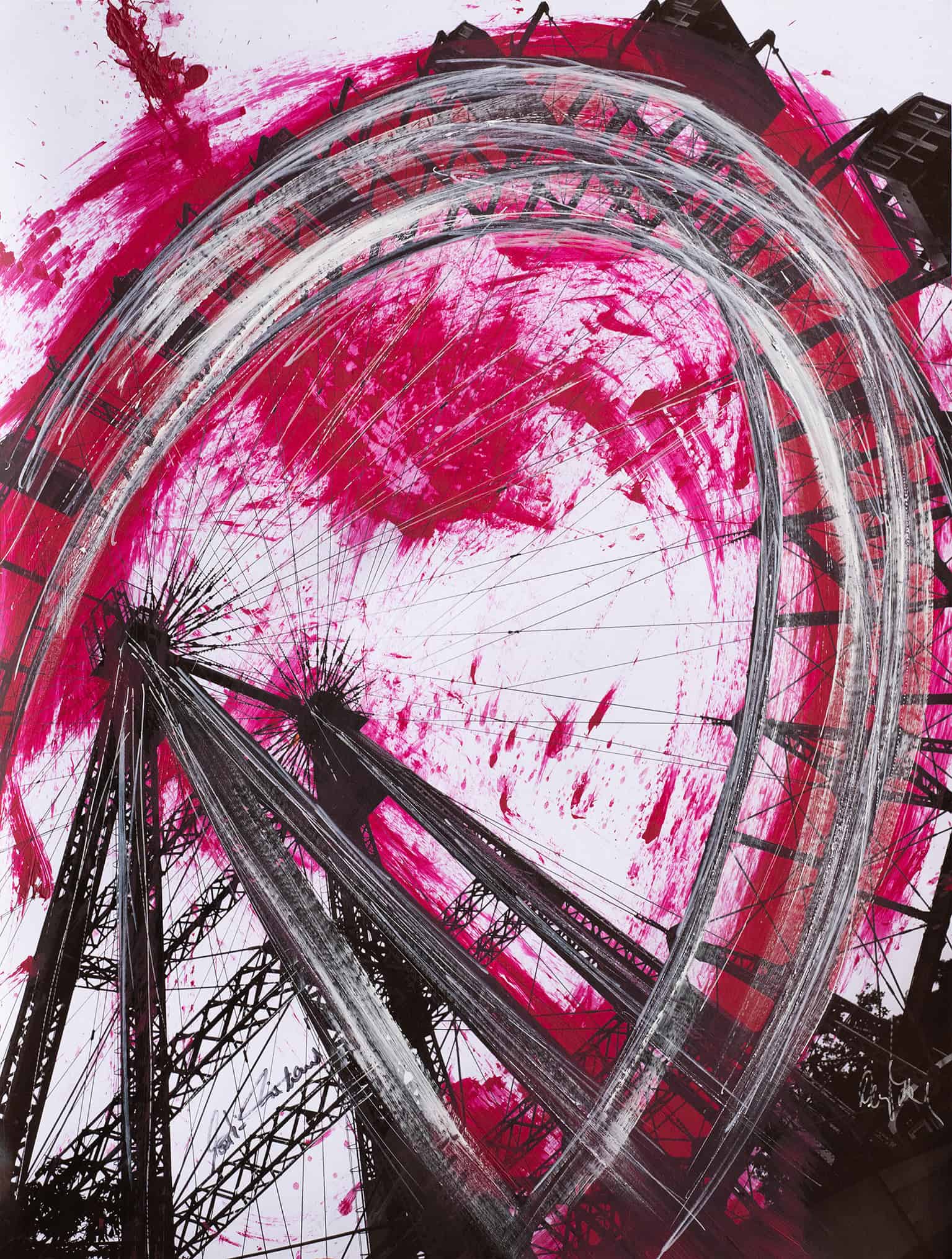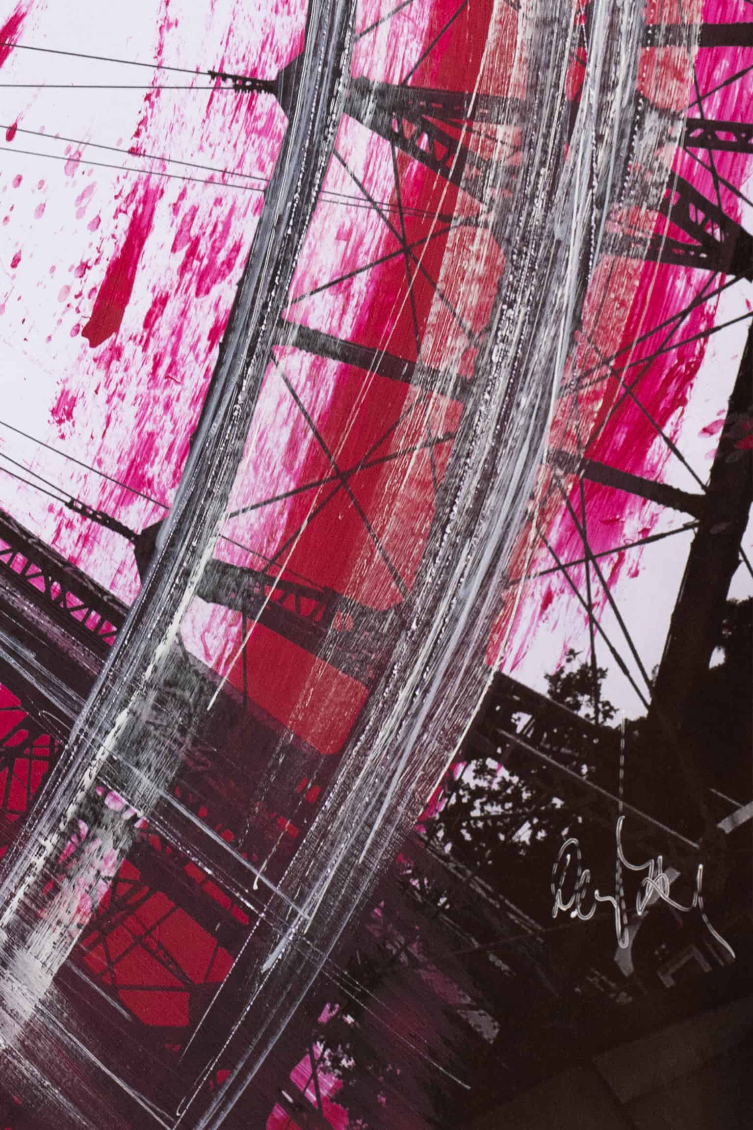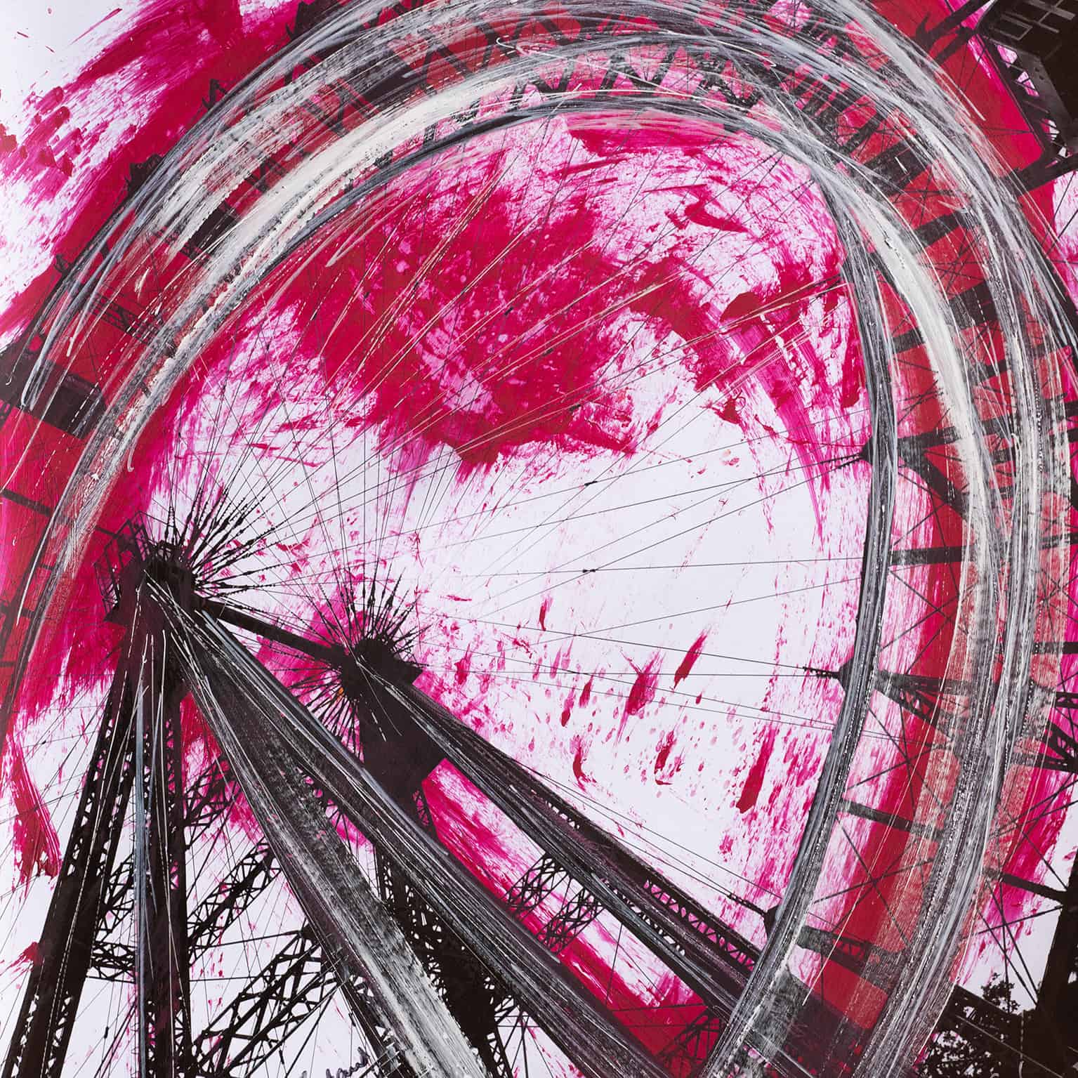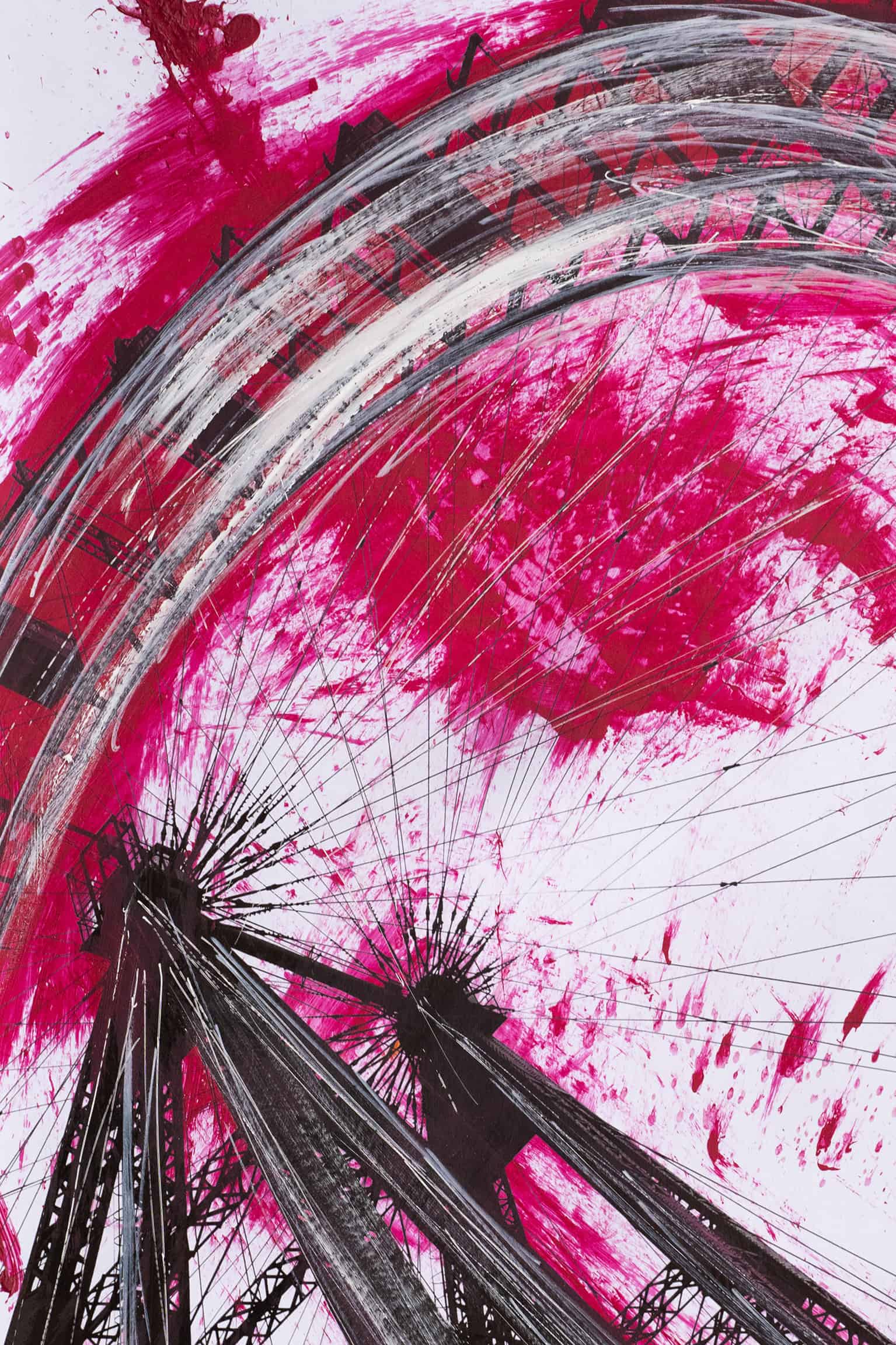 An unconventional view of the Vienna Giant Ferris Wheel: This original artwork presents the landmark in black and white, overlaid with vibrant red brushstrokes and precise marker lines. The powerful use of color infuses the image with a unique dynamism, showcasing the famous Ferris wheel. A captivating reinterpretation of this iconic symbol, its energy and freshness captivate, bringing a distinctive ambiance to any space.