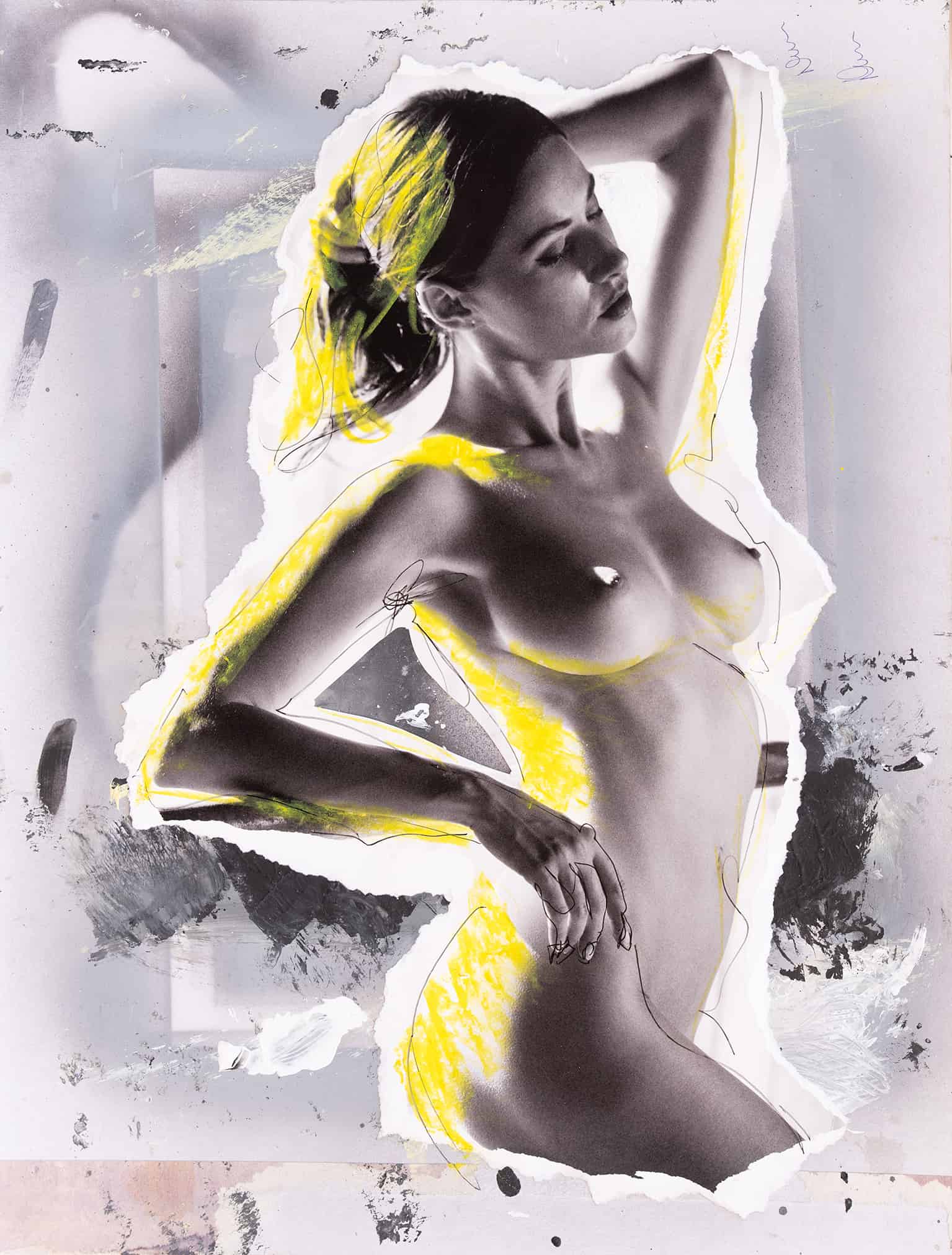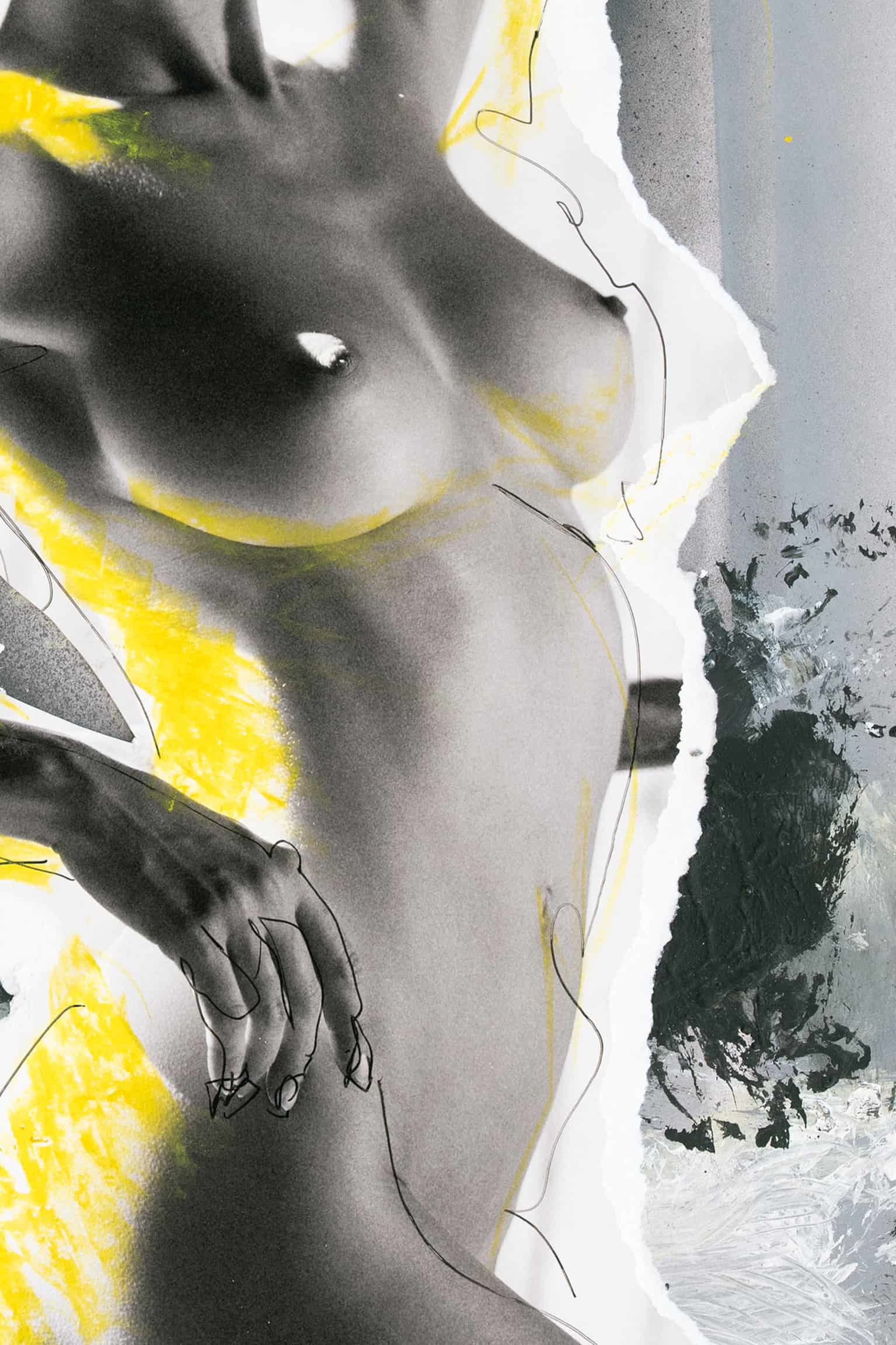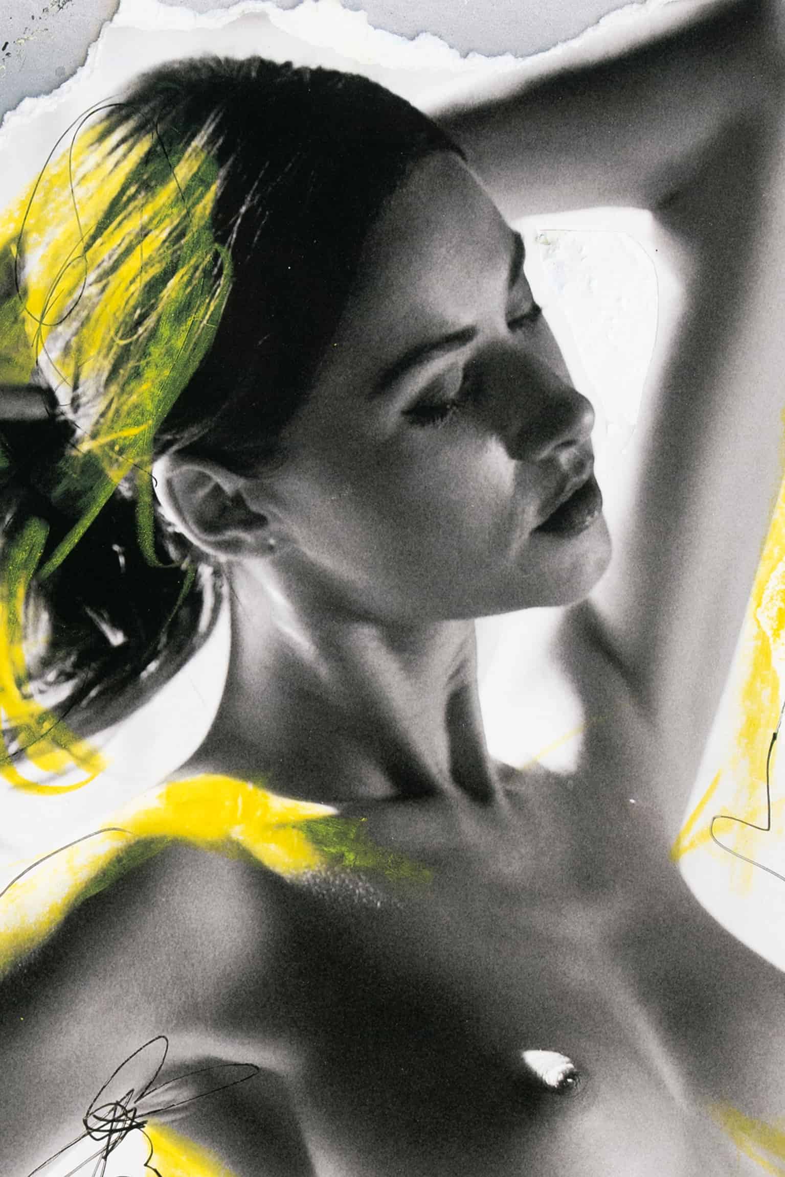 Ein faszinierendes Kunstwerk zeigt eine Frau vor einem hellen Hintergrund, deren Konturen sorgfältig auf einen eigenhändig gemalten Untergrund übertragen wurden. Das Bild strahlt eine helle Atmosphäre aus und präsentiert sich in gedämpften Farbtönen. Die subtile Nuance liegt in den gelben Ölkreiden, die die hellen Stellen des Fotos sanft einfärben, und verleihen dem Werk eine besondere Dynamik. Dieses Kunstwerk zieht den Betrachter durch seine Einfachheit und gleichzeitig seine komplexen Details in seinen Bann.