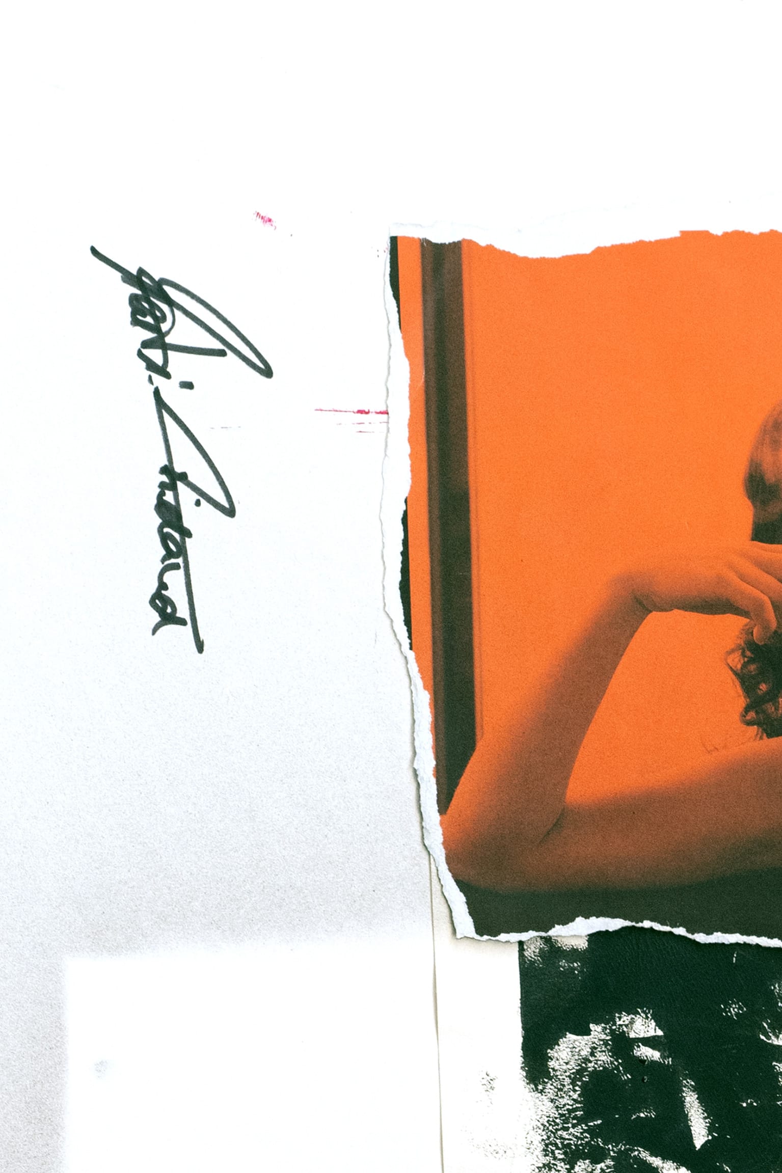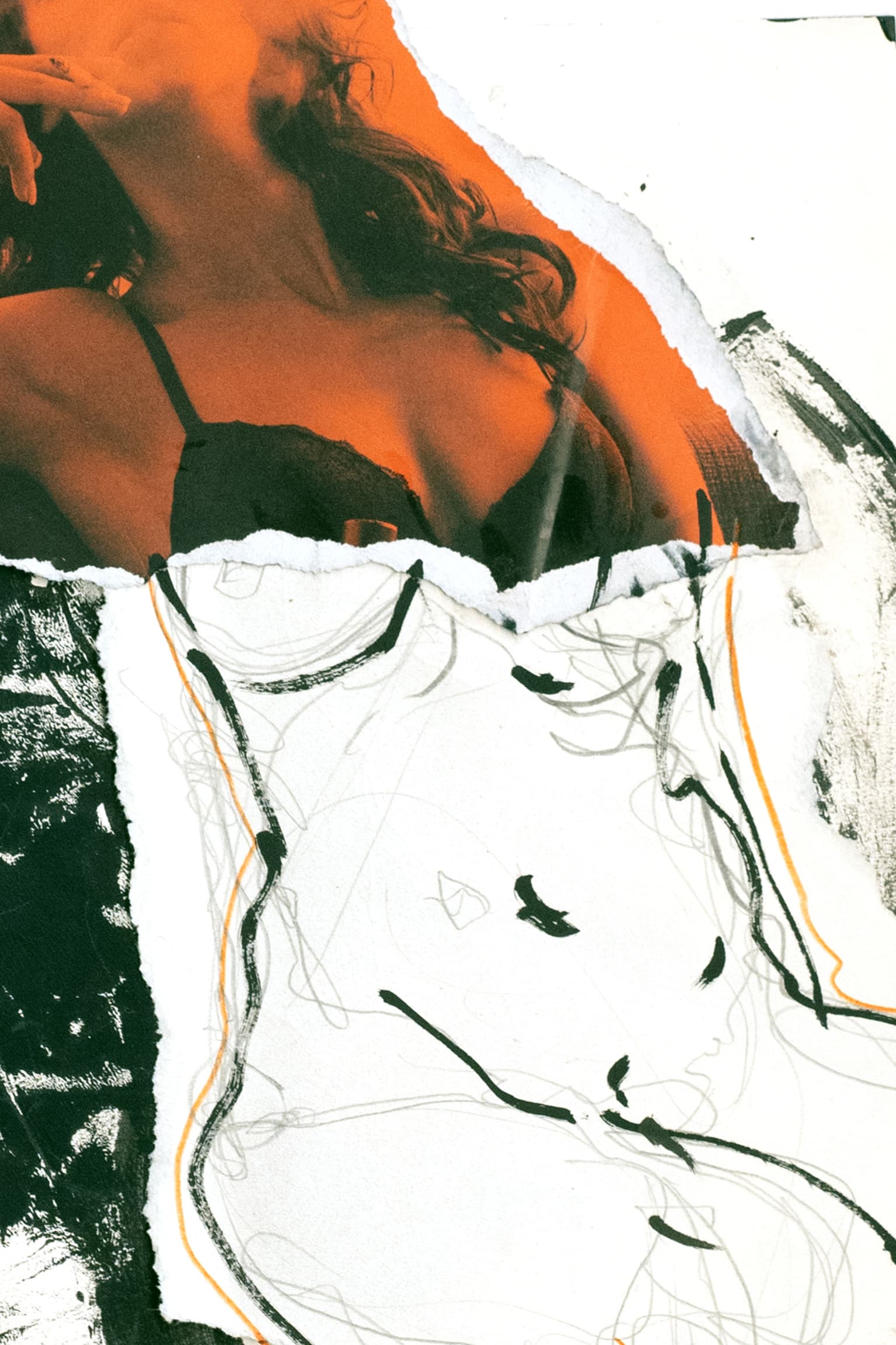 A play of texture and color: The vivid orange frames a smoking woman, encircled by abstract black and red elements. The gestural painting and fragmentation of the image evoke questions of identity and self-perception. The seemingly random composition amplifies the moment’s intensity